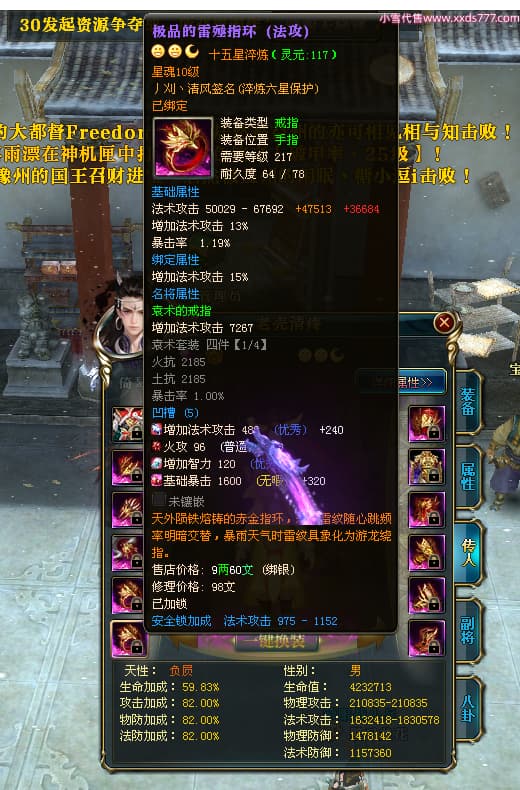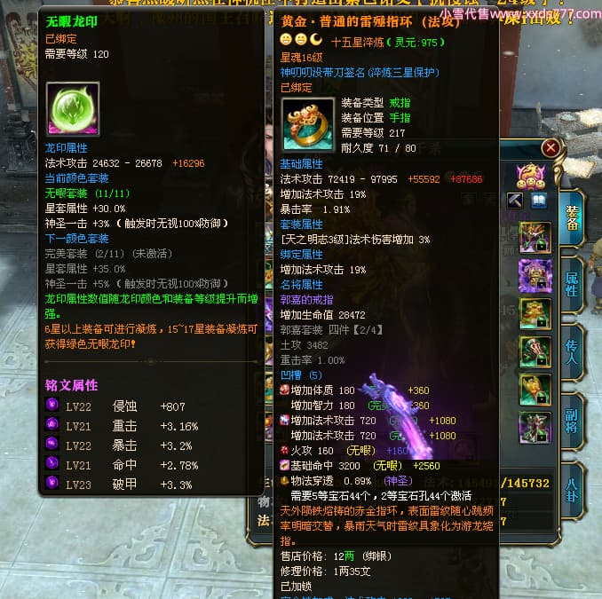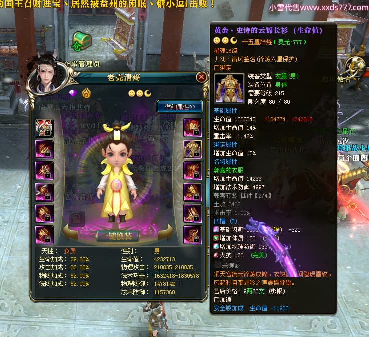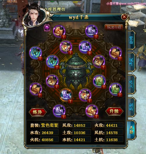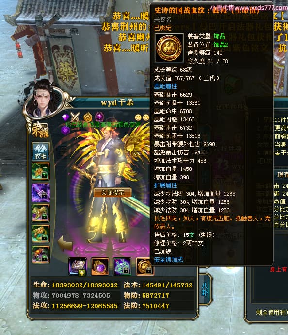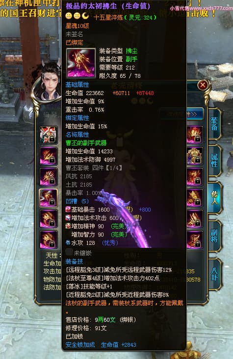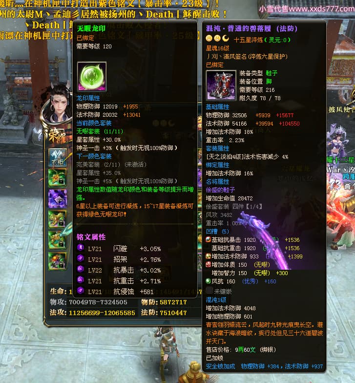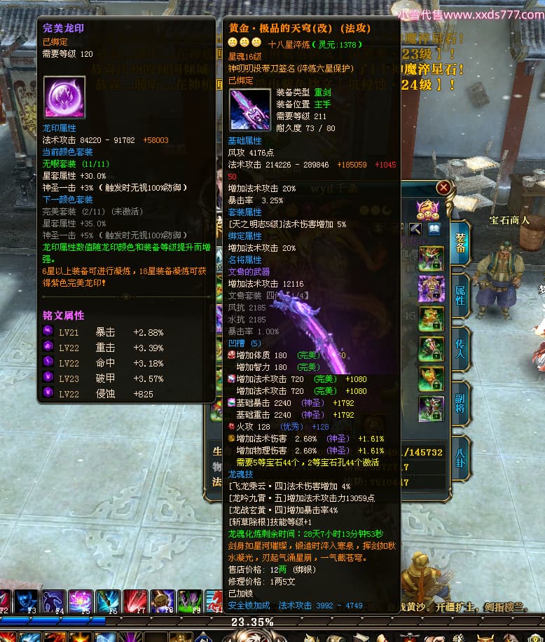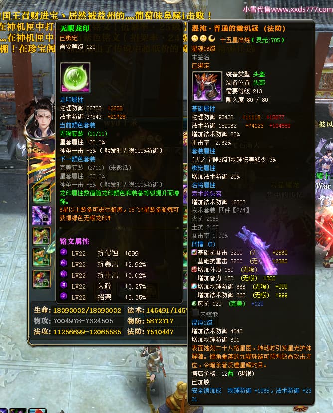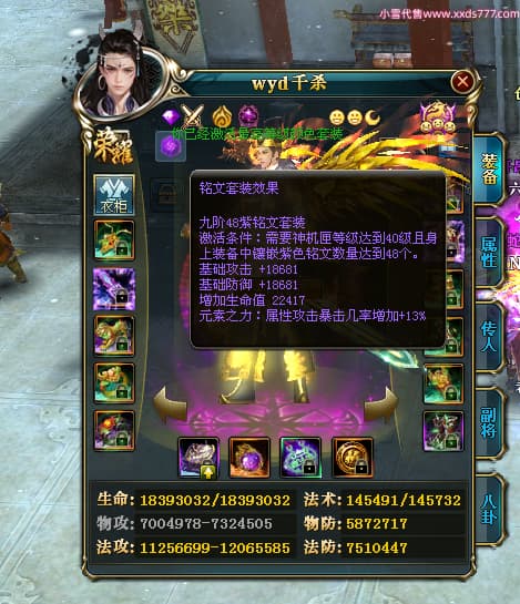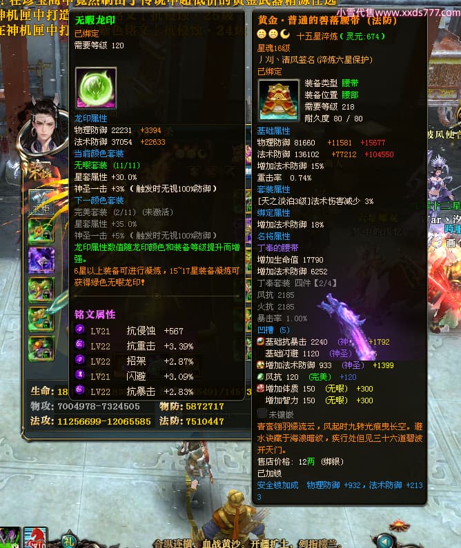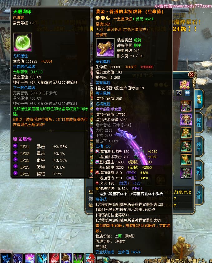 编号X24386 wyd千杀 龙啸风云 扬州 本国排名54名 16690W战力 人物黄金普通橙15X(1件18X4件混沌) 传人极品紫15X 副将精良紫12X 马史诗紫12X 极品紫15披风 人物星魂16级 传人星魂10级 副将星魂6级 马星魂13级 人物铭刻15级 点亮16星 马铭刻12级 点亮12星 人物绿龙印(2件紫龙印) 马黄龙印 六等单双属性神圣完美无暇石头 黄孔 已开3次永久15星套