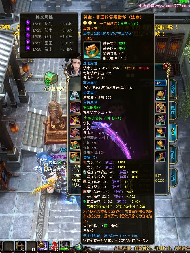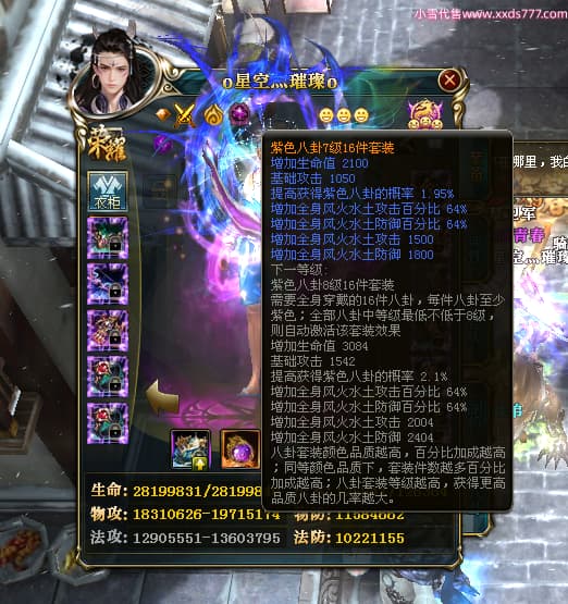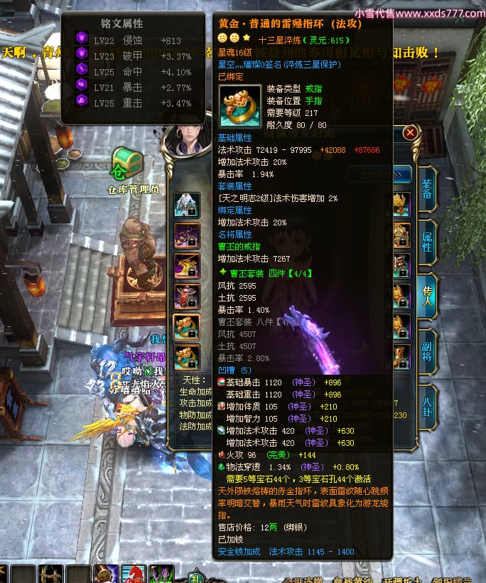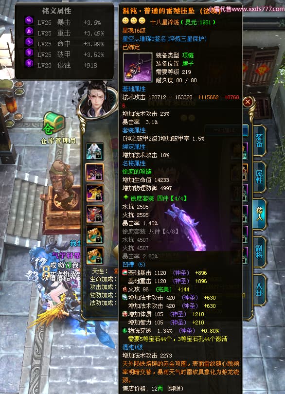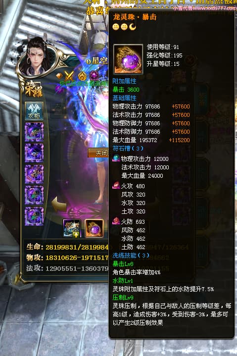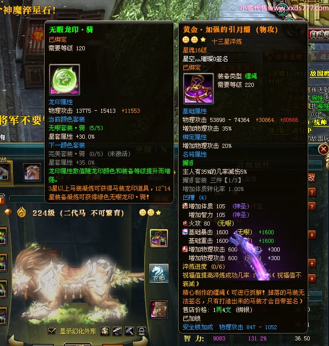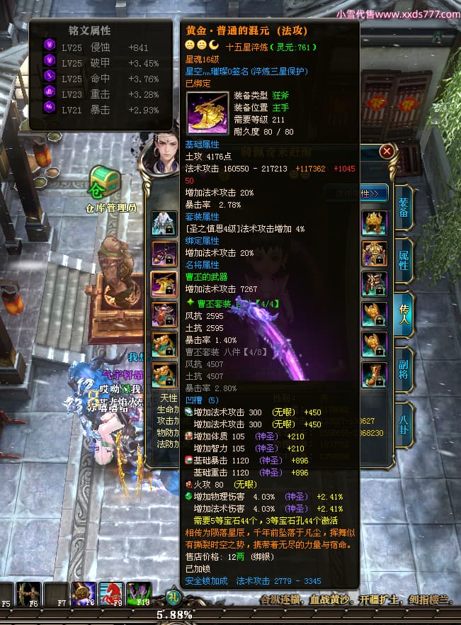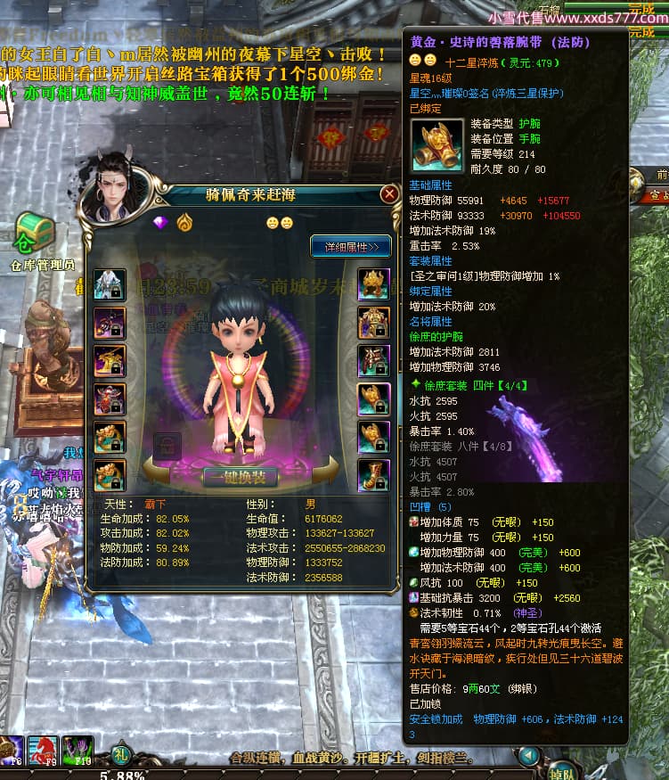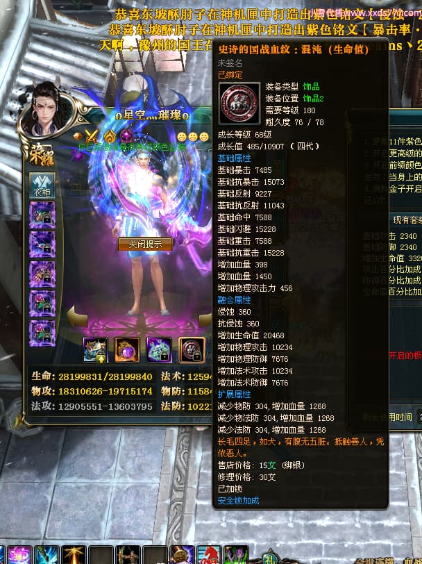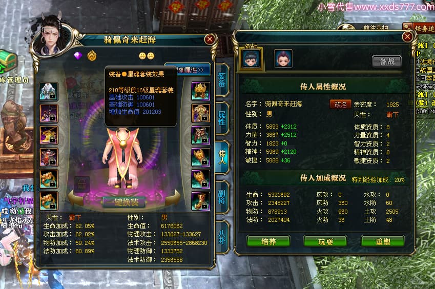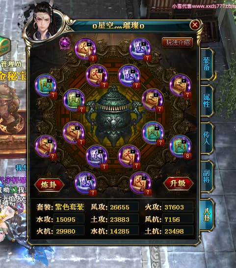 编号X24387 o星空灬璀璨o 龙啸风云 江州 世界排名30名 30128W战力 人物黄金极品橙18X(9件混沌) 传人黄金史诗紫12X(1件18X2件15X) 副将普通橙12X 马黄金加强橙13X 极品紫16披风 人物星魂16级 传人星魂16级 副将星魂12级 马星魂16级 人物铭刻7件18级1件17级其余16级 人物点亮4件18星其余16星 马铭刻15级 点亮14星 人物紫龙印 马绿龙印 六等单双属性神圣完美优秀石头 黄绿孔