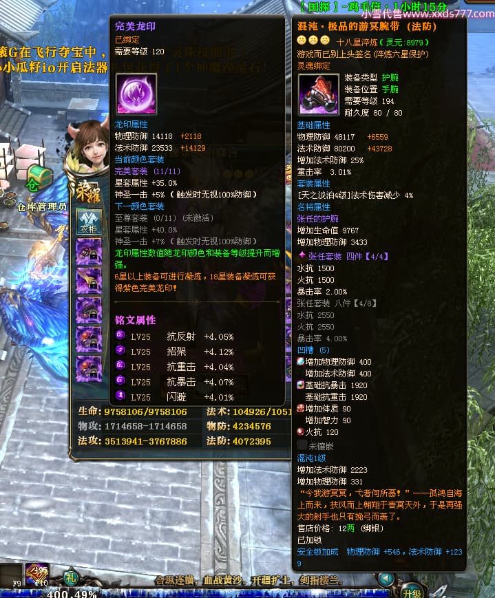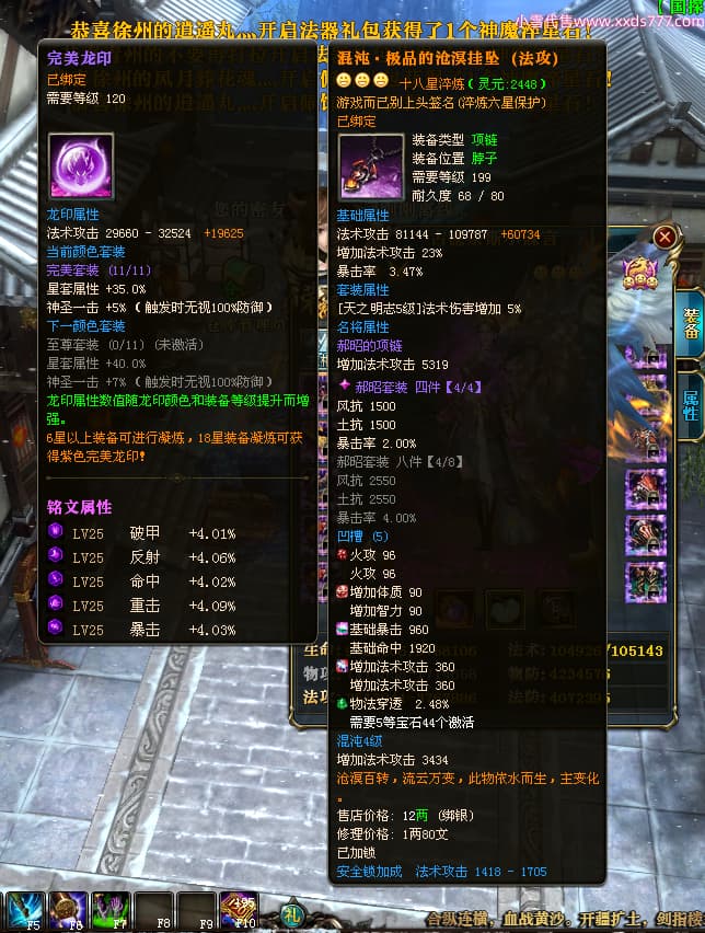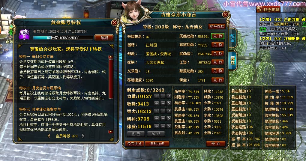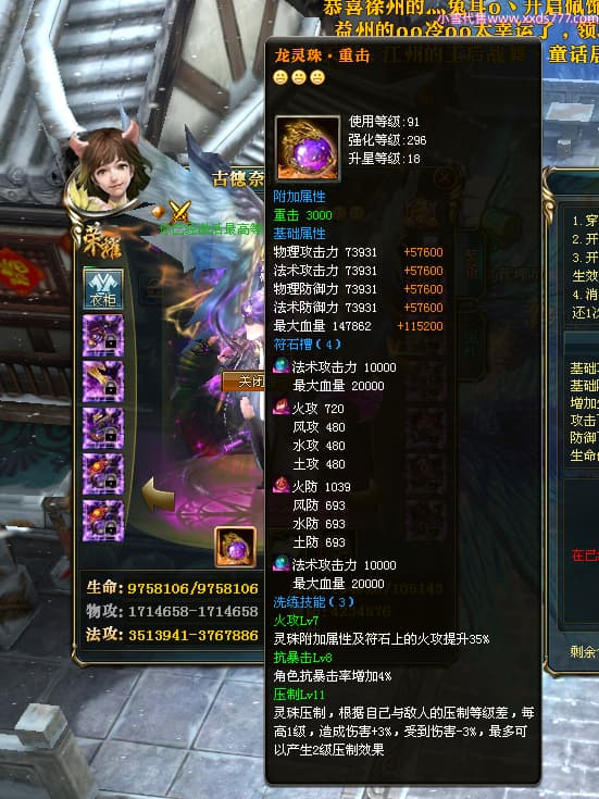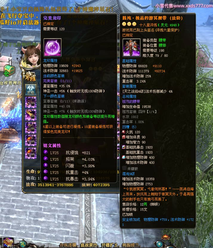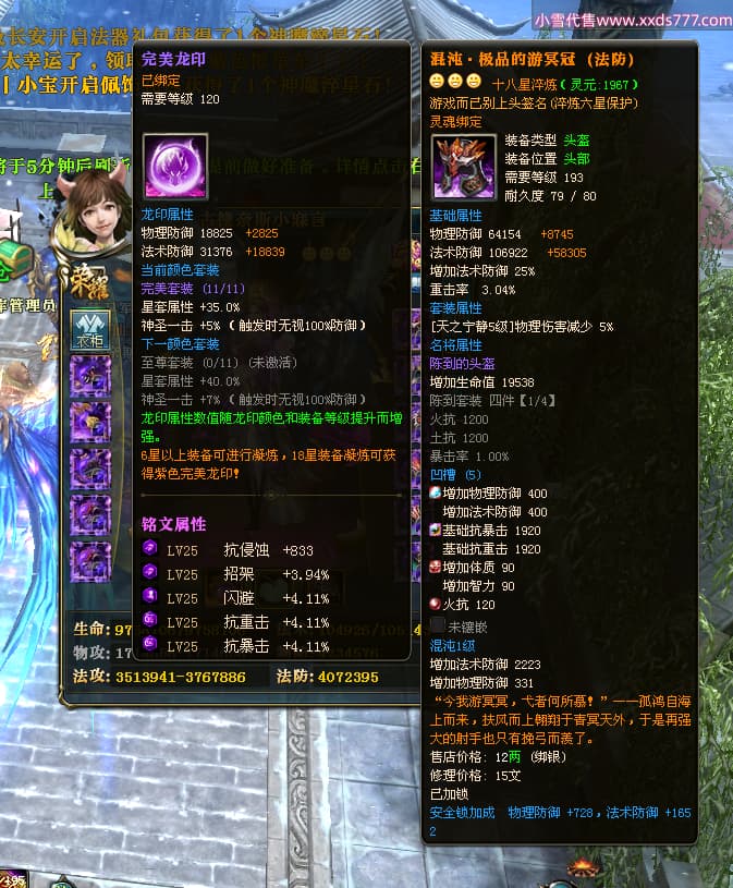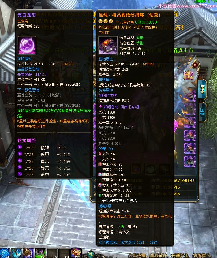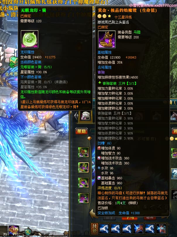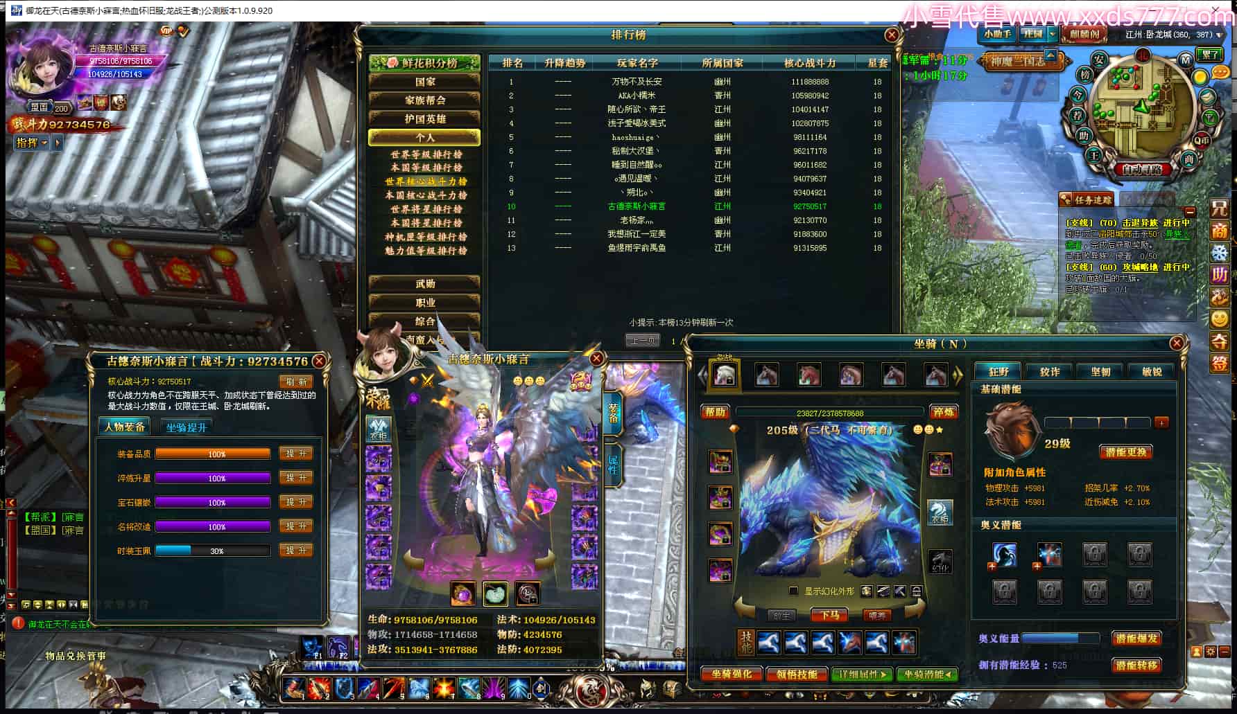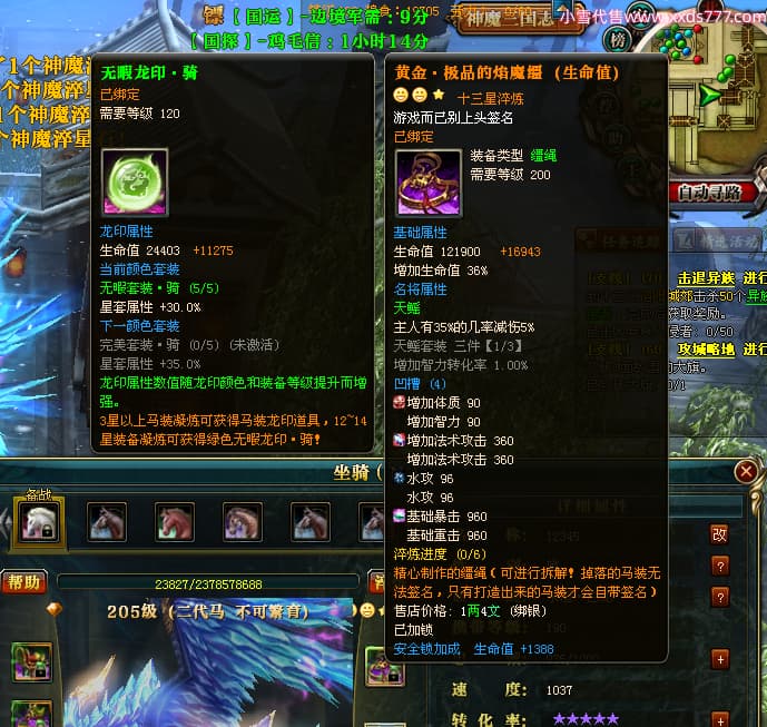 编号L24403 古德奈斯小寐言 龙战王者 江州 世界排名10名 9273W战力 人物黄金极品橙18X(9件混沌) 马黄金极品橙13X(双潜能50级29级) 人物紫龙印 马绿龙印 六等单双属性石头 已开3次永久18星套 可以转移百分百安全