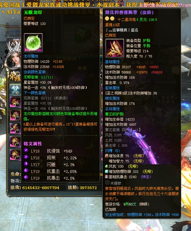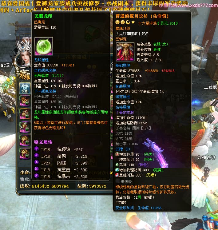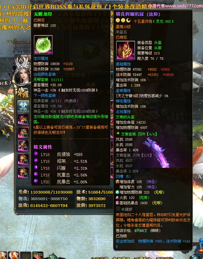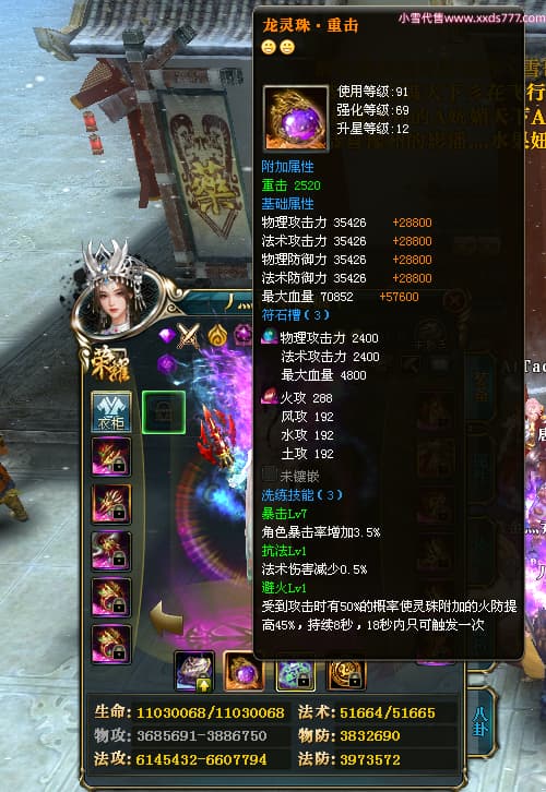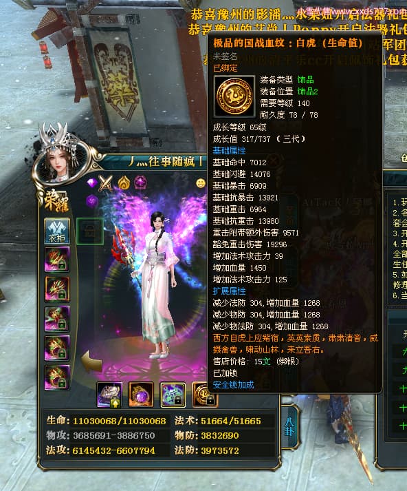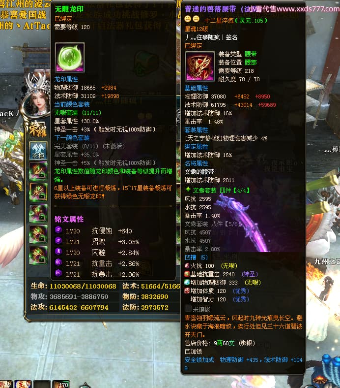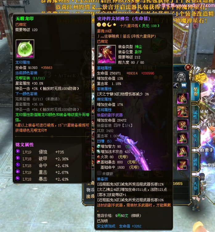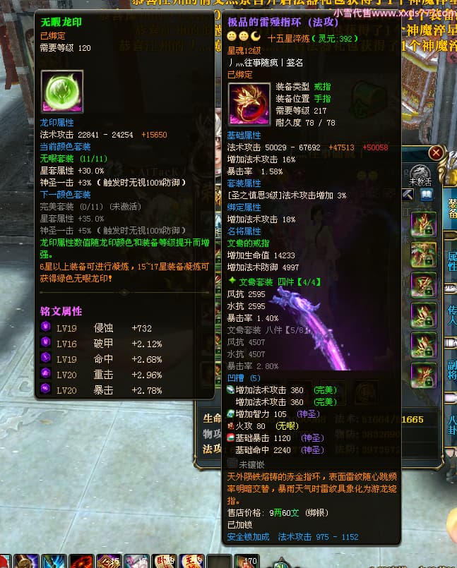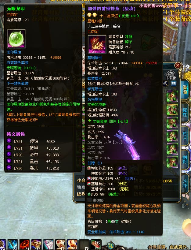 编号W24413 丿灬往事随疯丨 龙舞九州 扬州 7996W战力 人物精良紫12X(7件15X) 传人精良紫12X 副将精良紫12X 马精良紫9X 加强紫14披风 人物星魂12级 传人星魂6级 马星魂7级 人物铭刻2件15级1件14级其余12级 点亮2件14星其余12星 马铭刻12级 点亮10星 人物绿龙印 马蓝龙印 五等单双属性神圣完美无暇石头