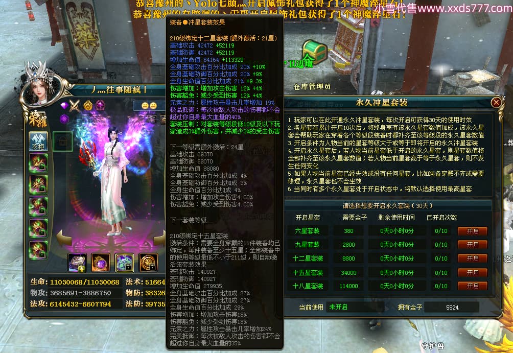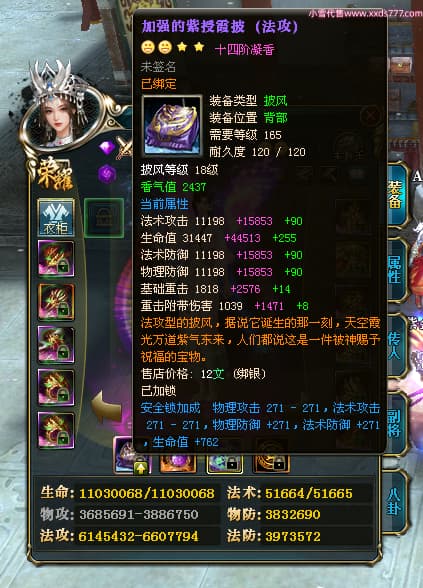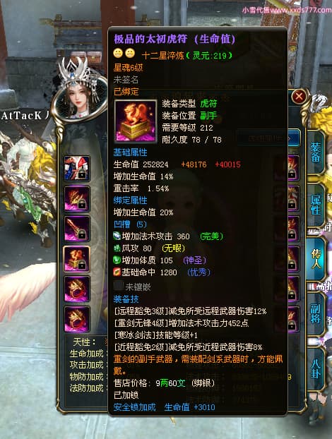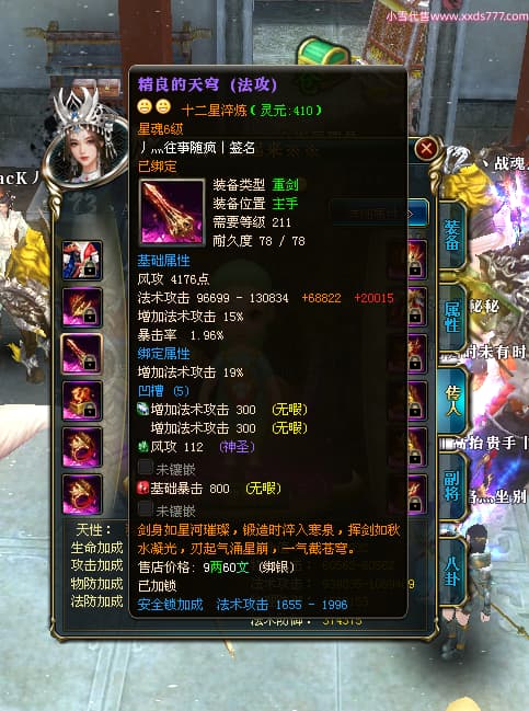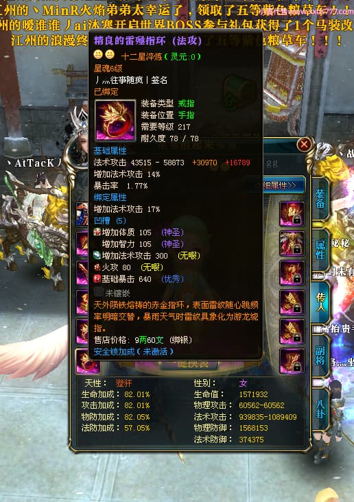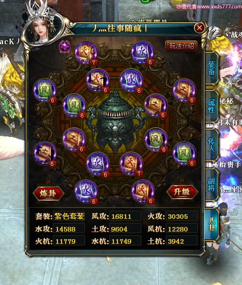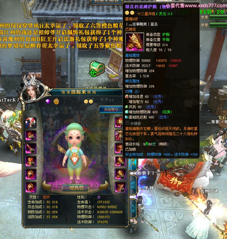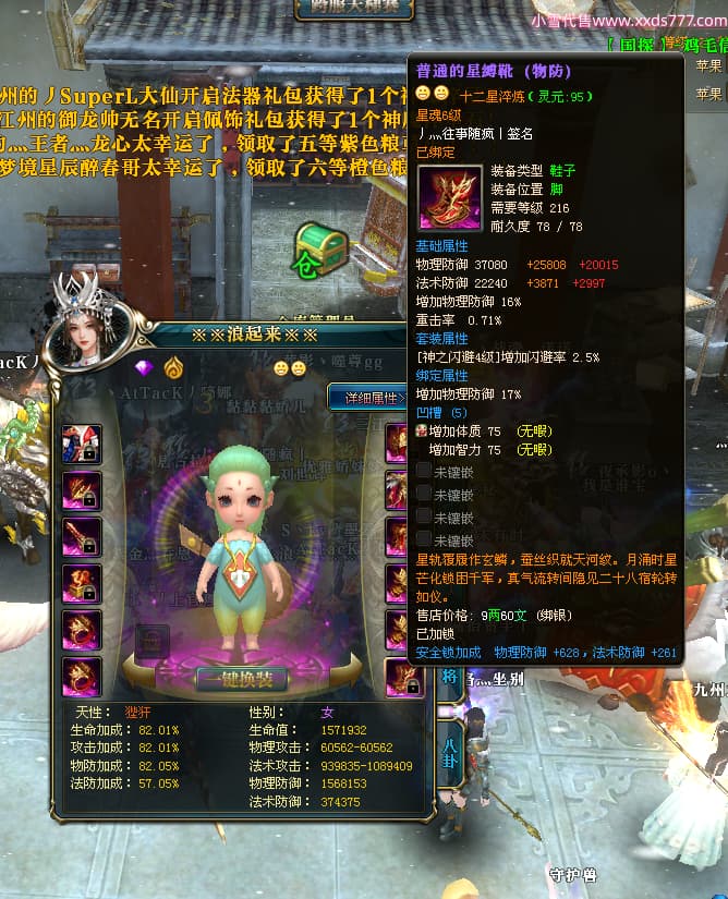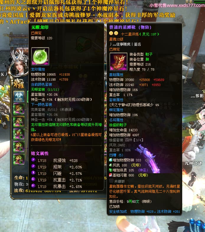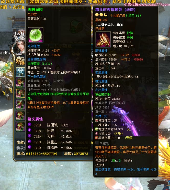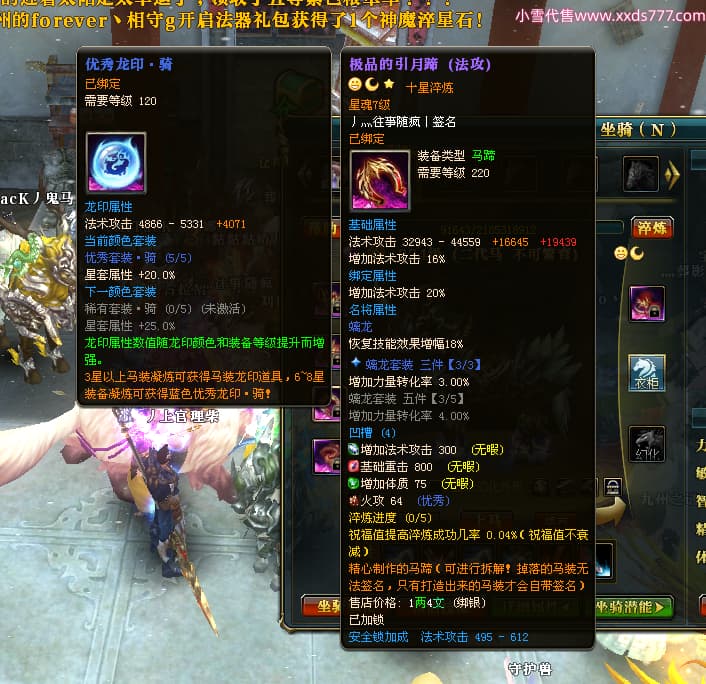 编号W24413 丿灬往事随疯丨 龙舞九州 扬州 7996W战力 人物精良紫12X(7件15X) 传人精良紫12X 副将精良紫12X 马精良紫9X 加强紫14披风 人物星魂12级 传人星魂6级 马星魂7级 人物铭刻2件15级1件14级其余12级 点亮2件14星其余12星 马铭刻12级 点亮10星 人物绿龙印 马蓝龙印 五等单双属性神圣完美无暇石头