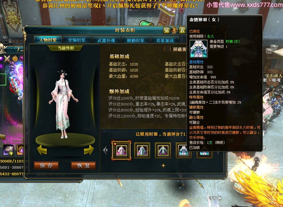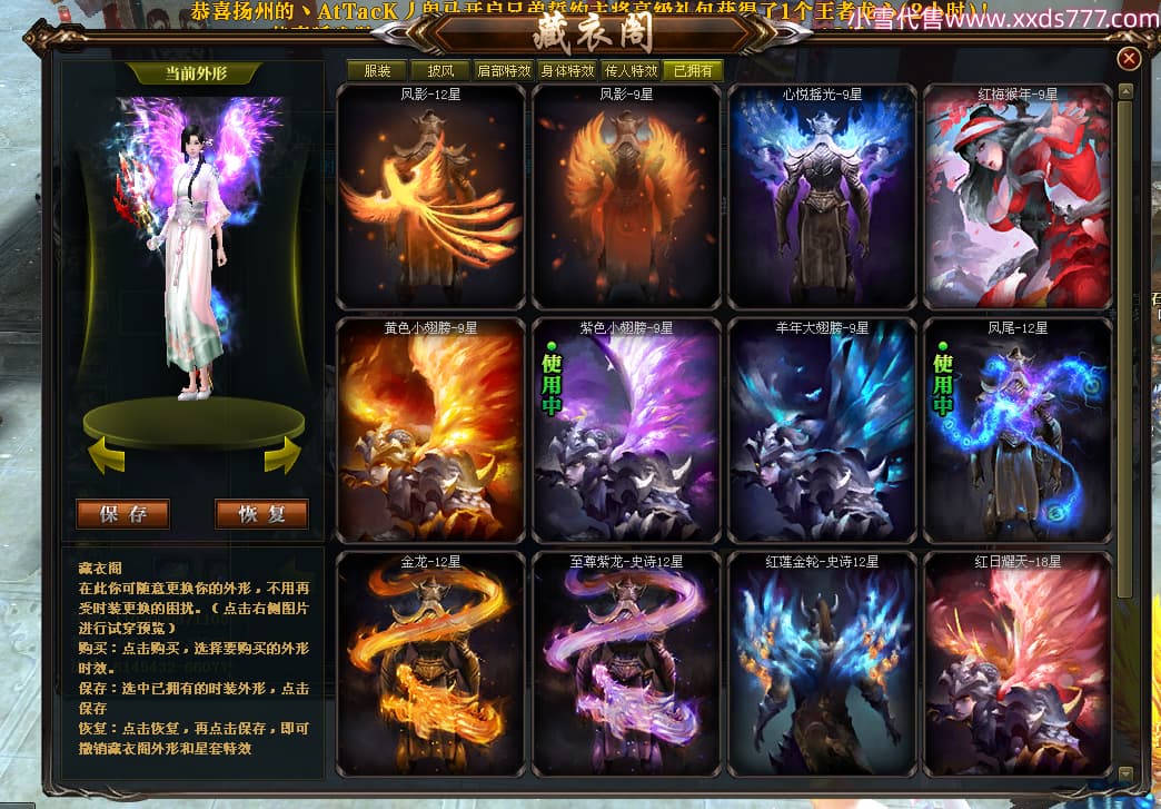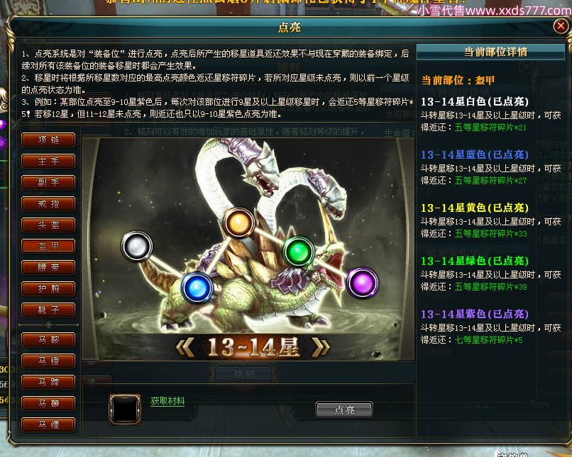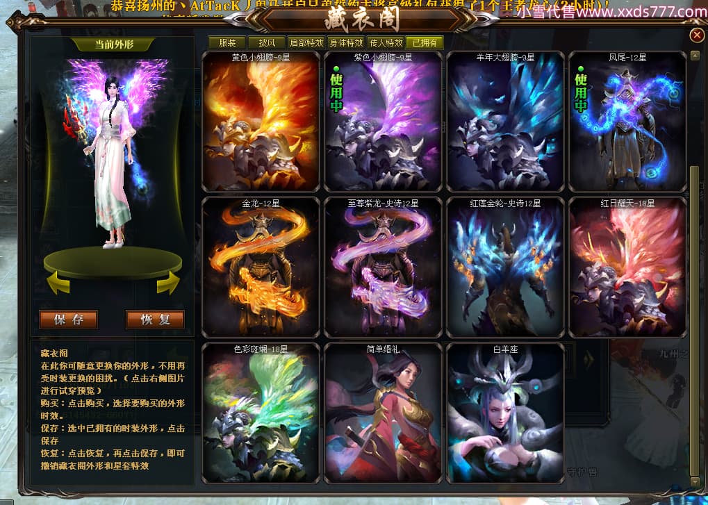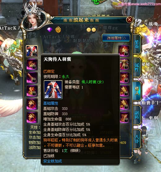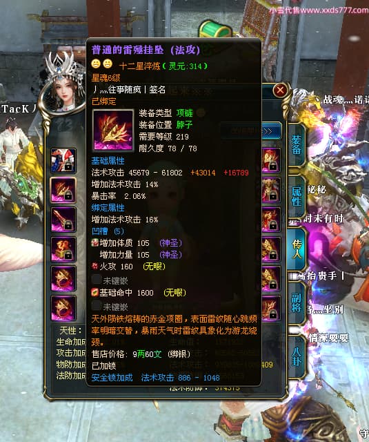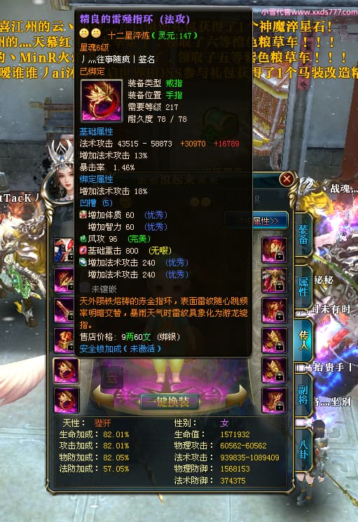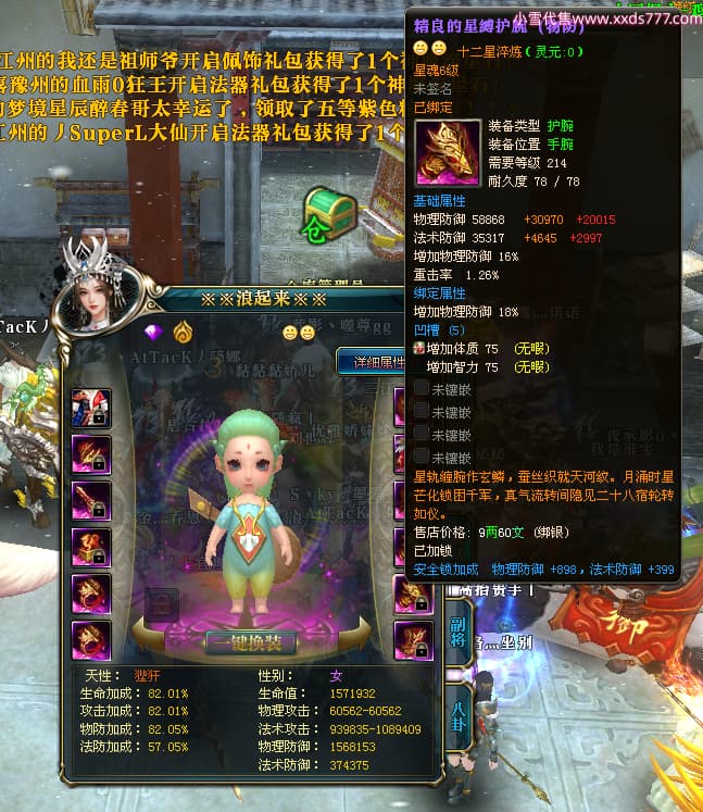 编号W24413 丿灬往事随疯丨 龙舞九州 扬州 7996W战力 人物精良紫12X(7件15X) 传人精良紫12X 副将精良紫12X 马精良紫9X 加强紫14披风 人物星魂12级 传人星魂6级 马星魂7级 人物铭刻2件15级1件14级其余12级 点亮2件14星其余12星 马铭刻12级 点亮10星 人物绿龙印 马蓝龙印 五等单双属性神圣完美无暇石头
