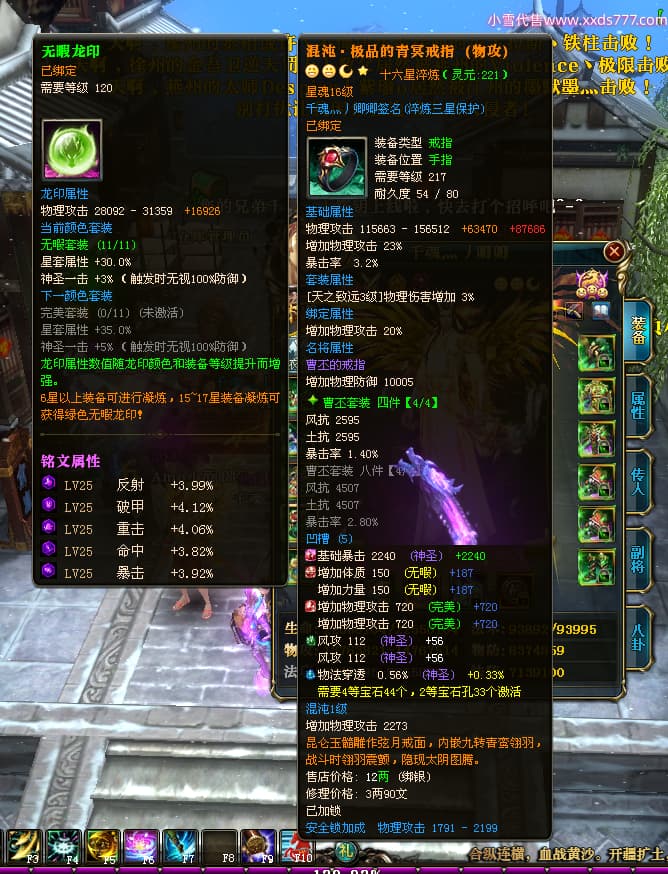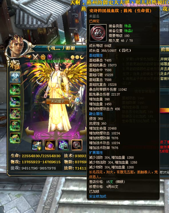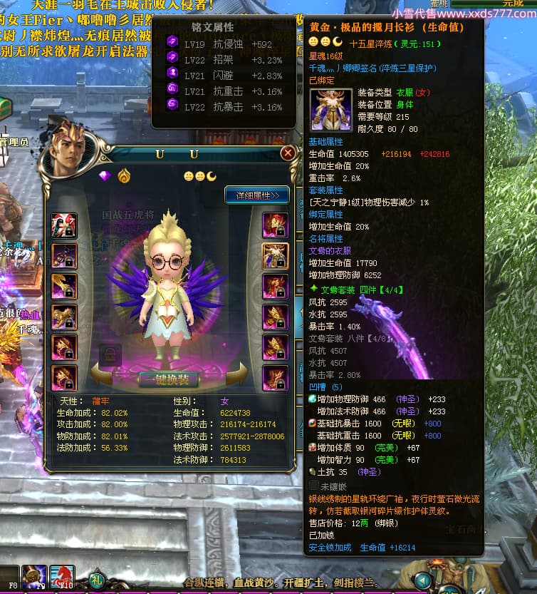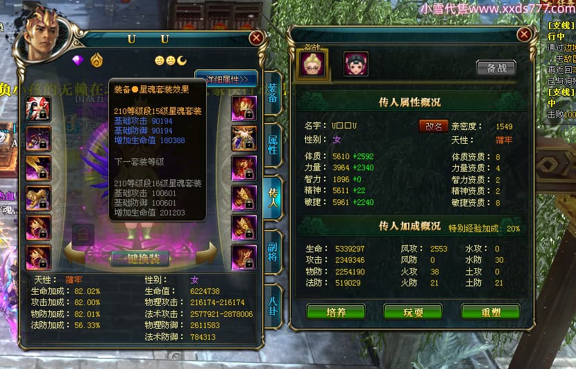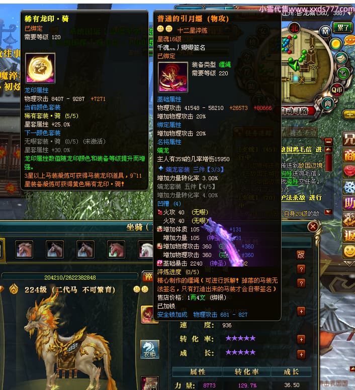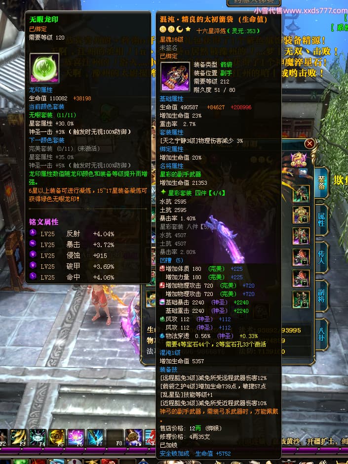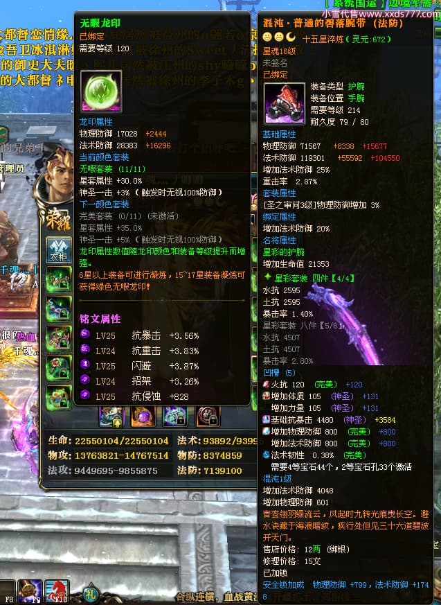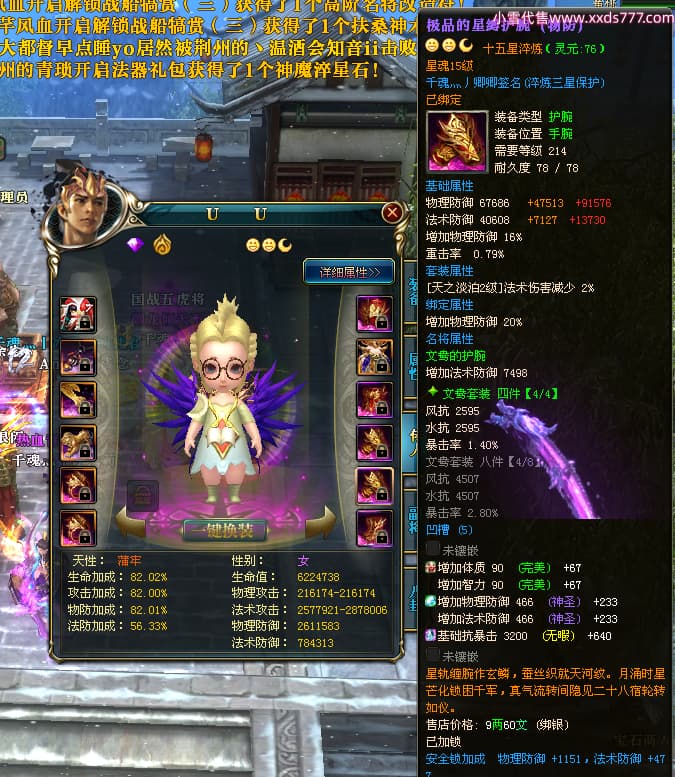 编号X24447 千魂灬丿卿卿 龙啸风云 江州 本国排名19名 20992W战力 人物黄金普通橙15X(8件混沌) 传人极品紫15X 副将精良紫12X 马普通橙12X 极品紫15披风 人物星魂16级 传人星魂15级 副将星魂6级 马星魂16级 人物铭刻15级 人物点亮16星 马铭刻12级 点亮12星 人物绿龙印 马黄龙印 五六等单双属性神圣完美优秀石头 黄蓝孔