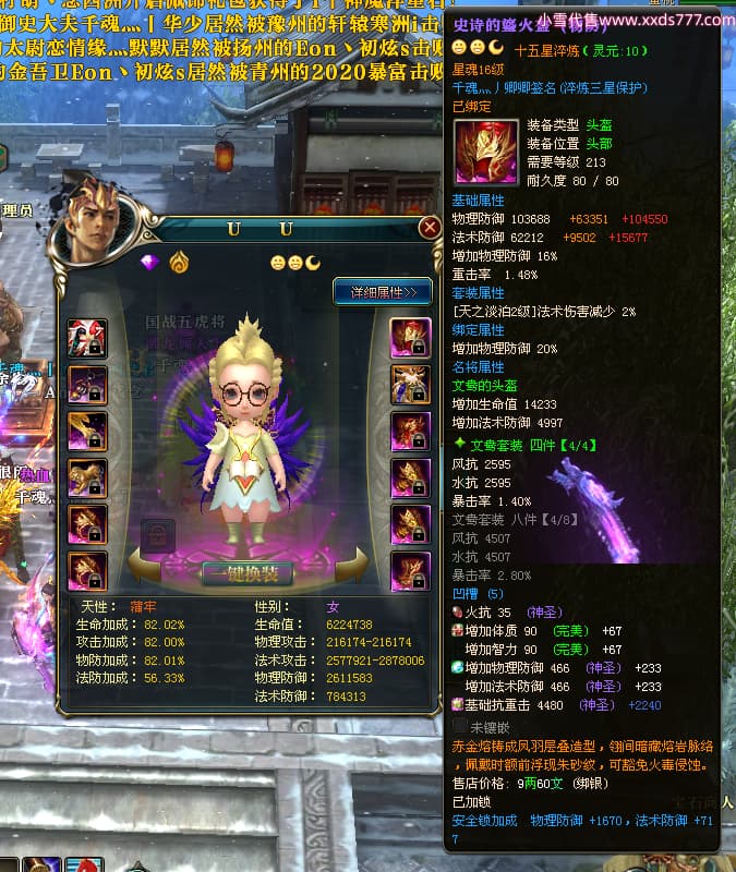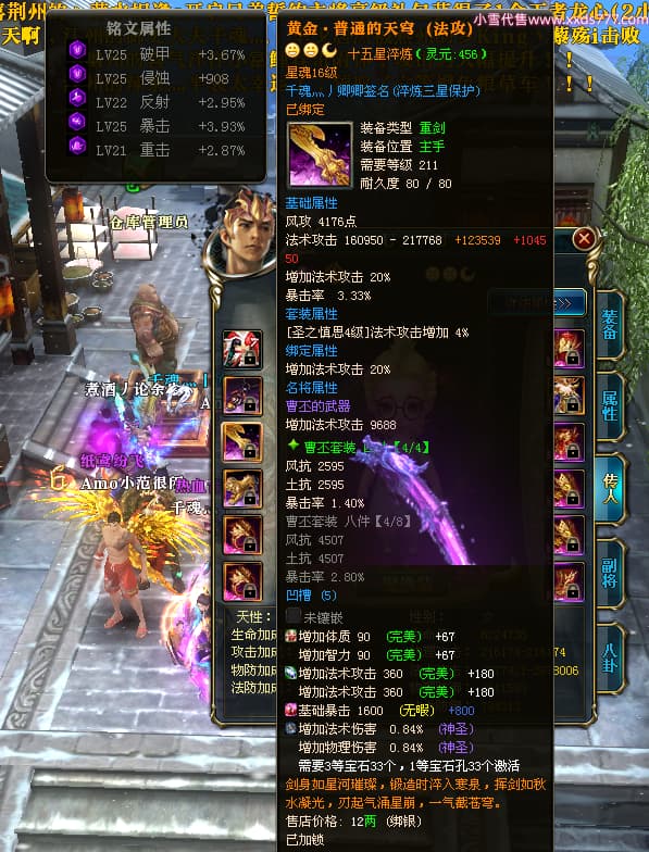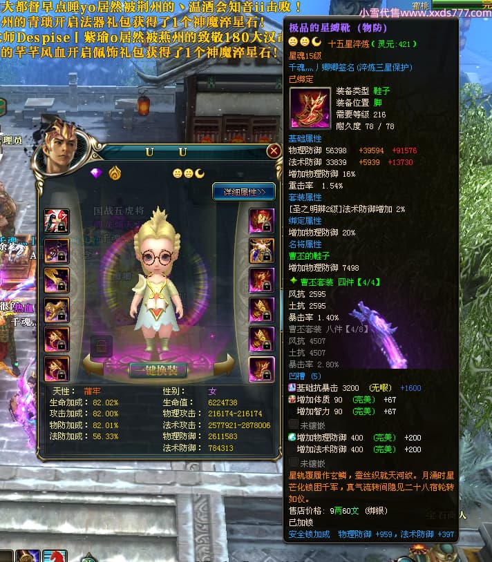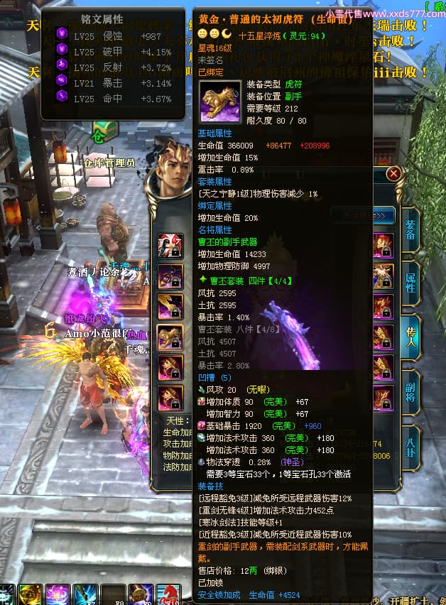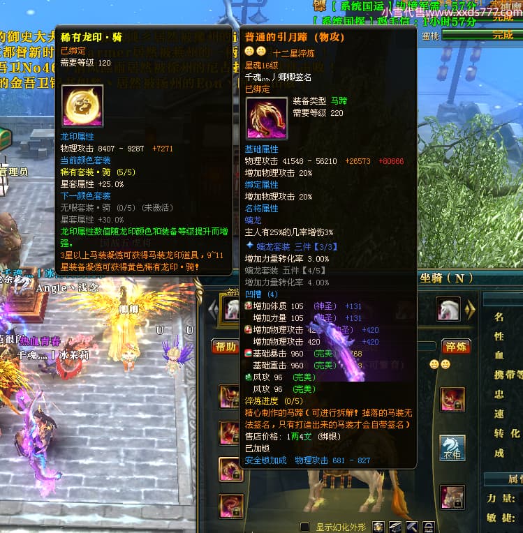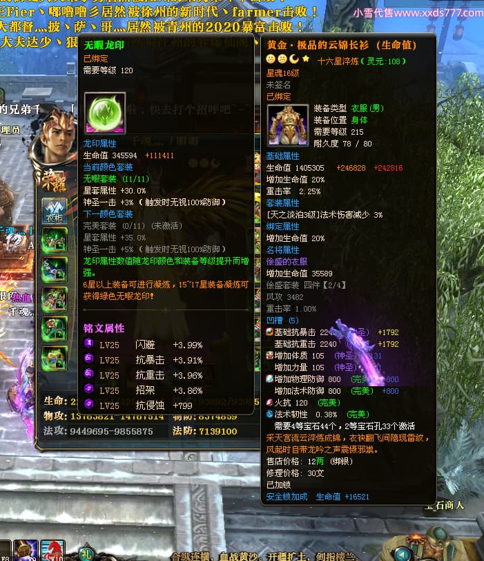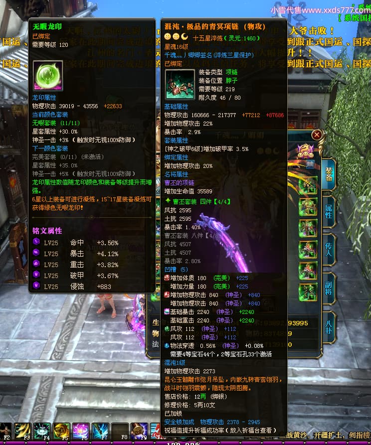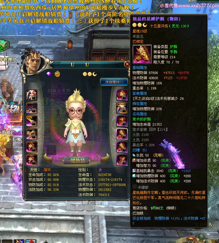 编号X24447 千魂灬丿卿卿 龙啸风云 江州 本国排名19名 20992W战力 人物黄金普通橙15X(8件混沌) 传人极品紫15X 副将精良紫12X 马普通橙12X 极品紫15披风 人物星魂16级 传人星魂15级 副将星魂6级 马星魂16级 人物铭刻15级 人物点亮16星 马铭刻12级 点亮12星 人物绿龙印 马黄龙印 五六等单双属性神圣完美优秀石头 黄蓝孔