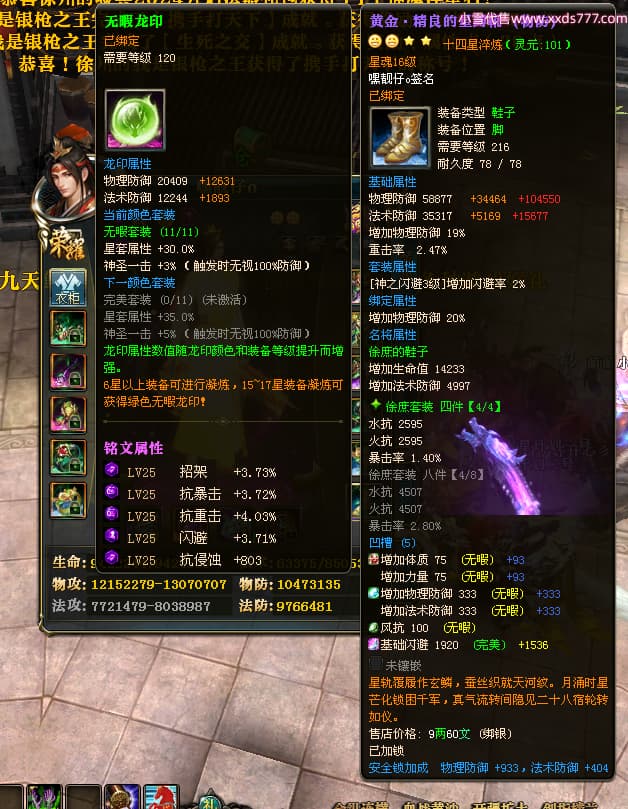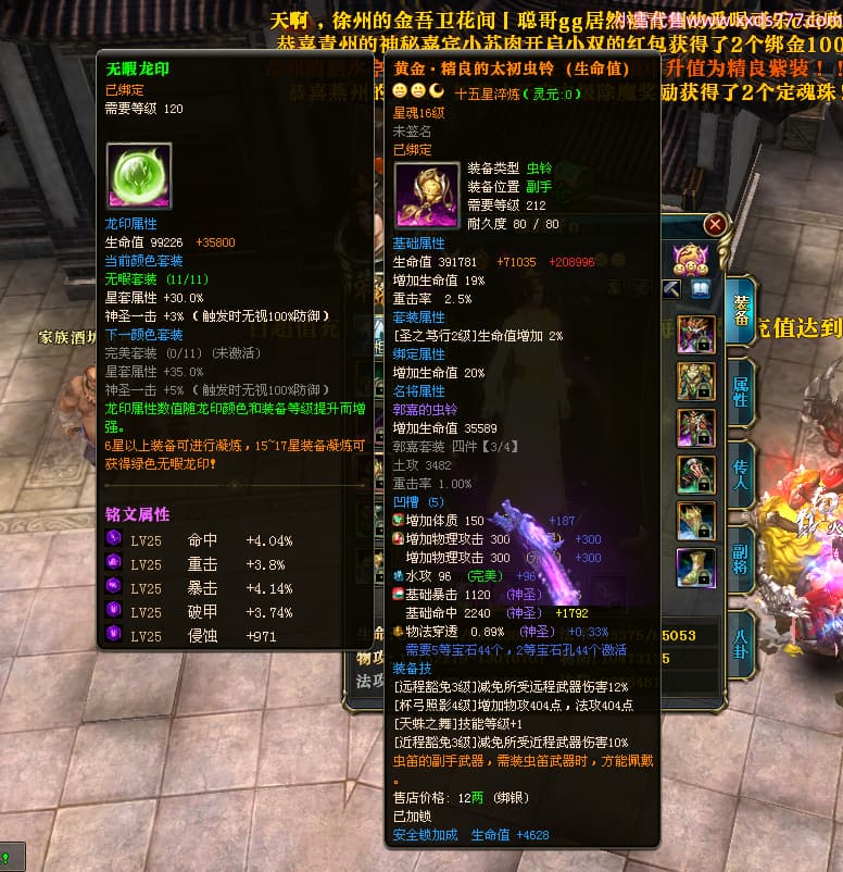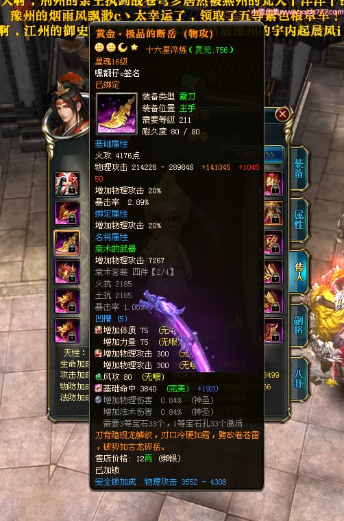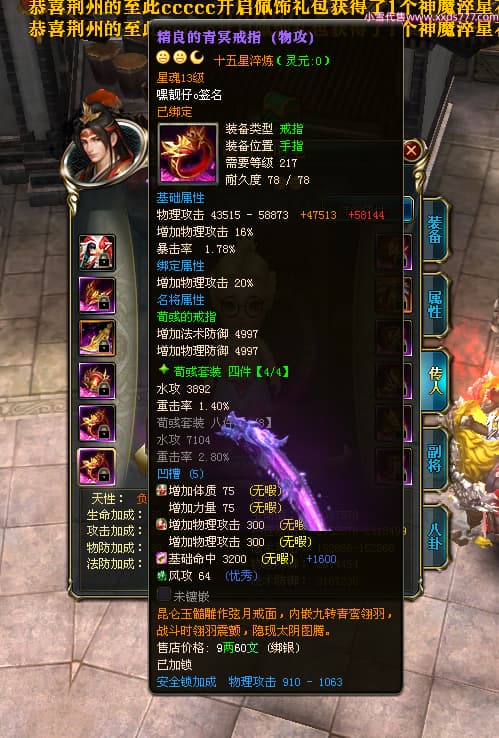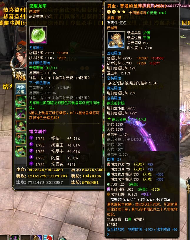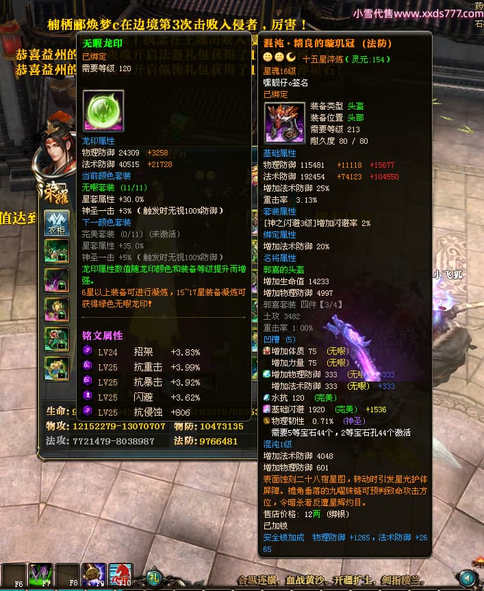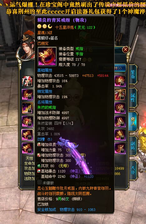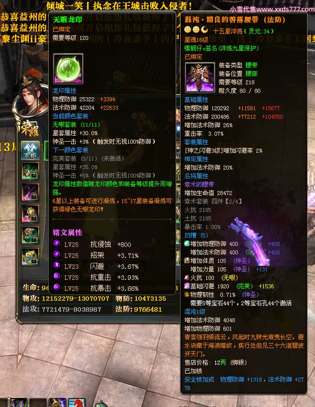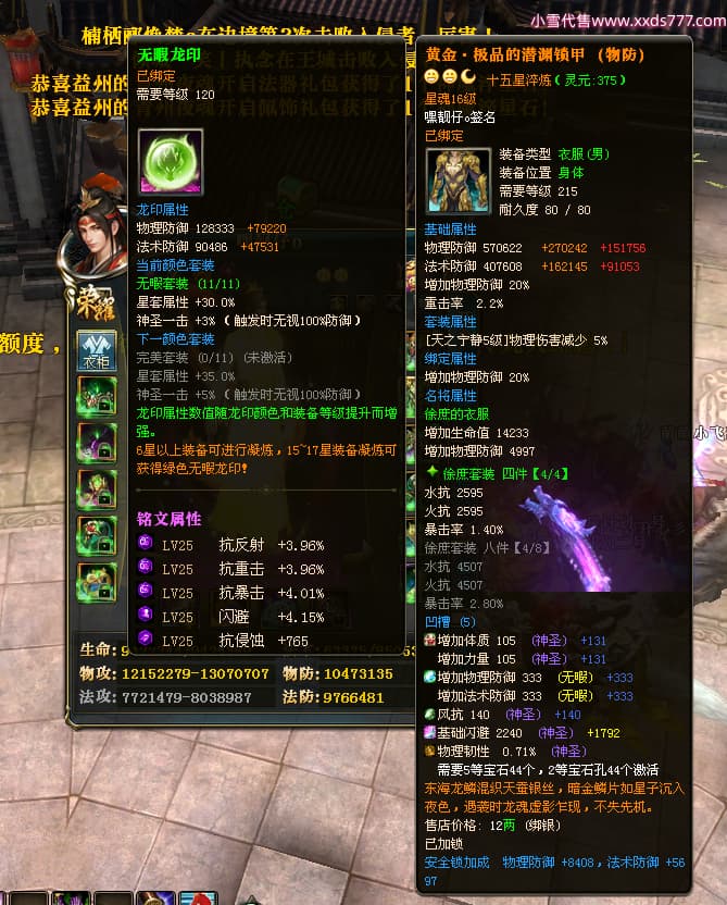 编号T24472 嘿靓仔o 龙腾问鼎 益州 本国排名25名 17435W战力 人物黄金普通橙14X(9件15X5件混沌) 传人精良紫12X 副将精良紫12X 马普通橙10X 精良紫15披风 人物星魂16级 传人星魂10级 副将星魂6级 马星魂16级 人物铭刻15级 点亮7件16星其余14星 马铭刻12级 点亮10星 人物绿龙印 马黄龙印 五等单双属性完美无暇神圣石头 黄蓝孔
