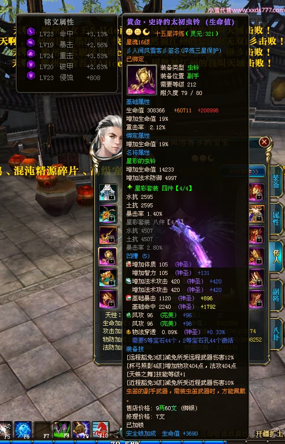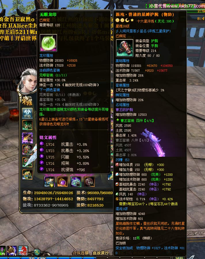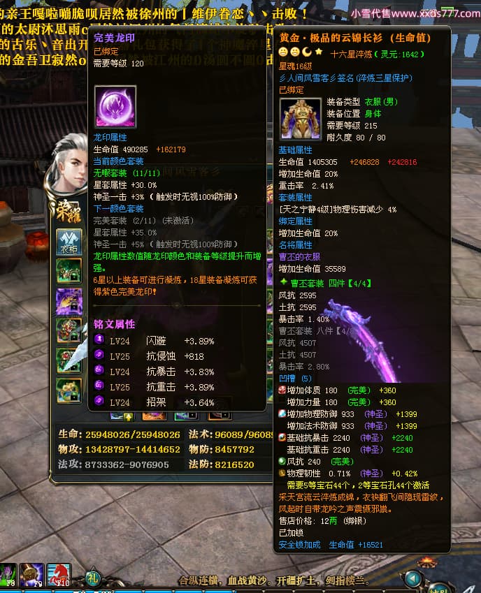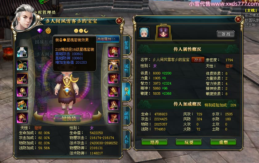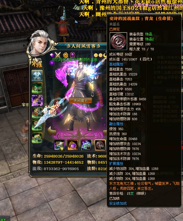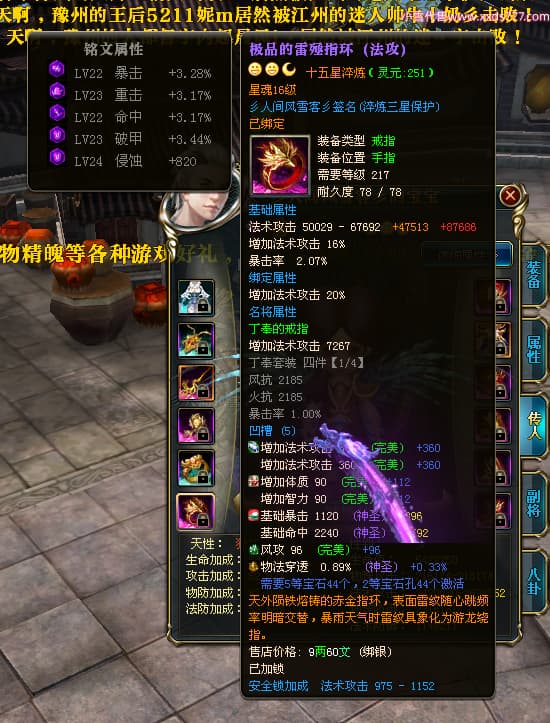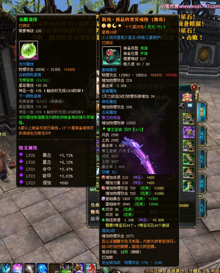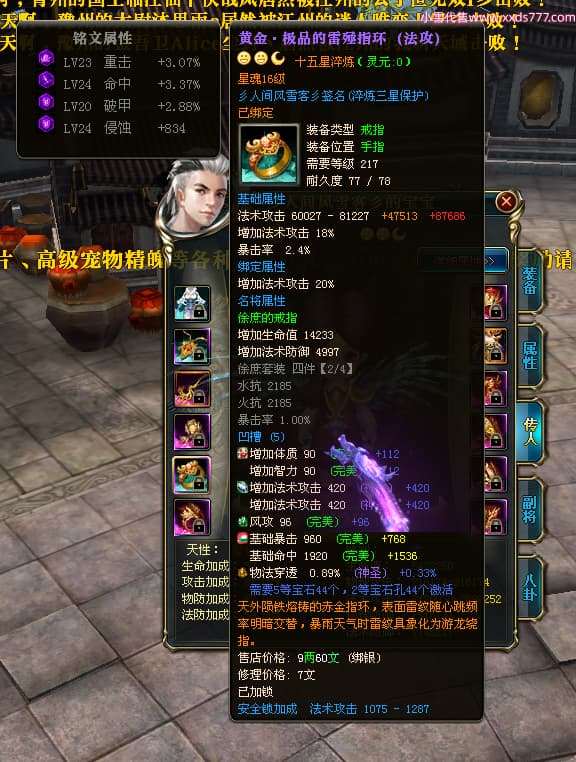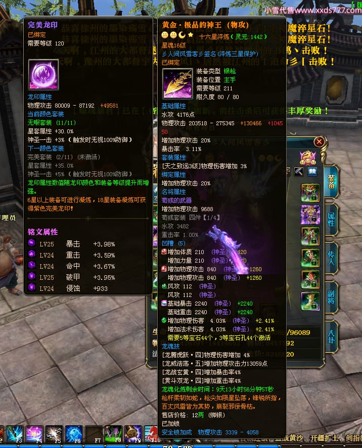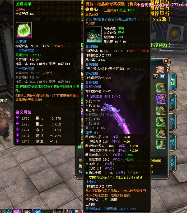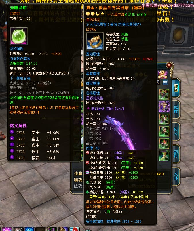 编号T24474 彡人间风雪客彡 龙腾问鼎 益州 本国排名第13名 22297W战力 人物黄金普通橙15X(7件混沌) 传人极品紫15X 副将史诗紫15X 马普通橙12X 极品紫15披风 人物星魂16级 传人星魂16级 副将星魂14级 马星魂15级 人物铭刻15级 点亮16星 马铭刻13级 点亮2件14星其余12星 人物绿龙印(2件紫龙印) 马黄龙印 六等单双属性神圣完美无瑕石头 黄绿孔 已开启永久15星套