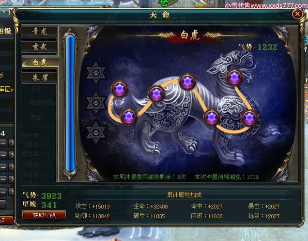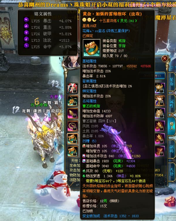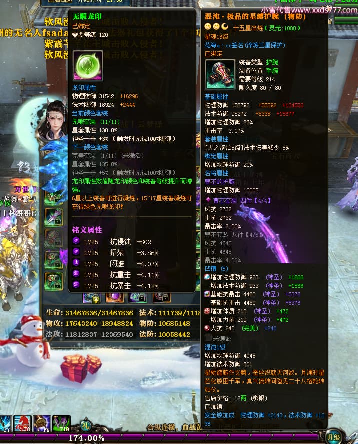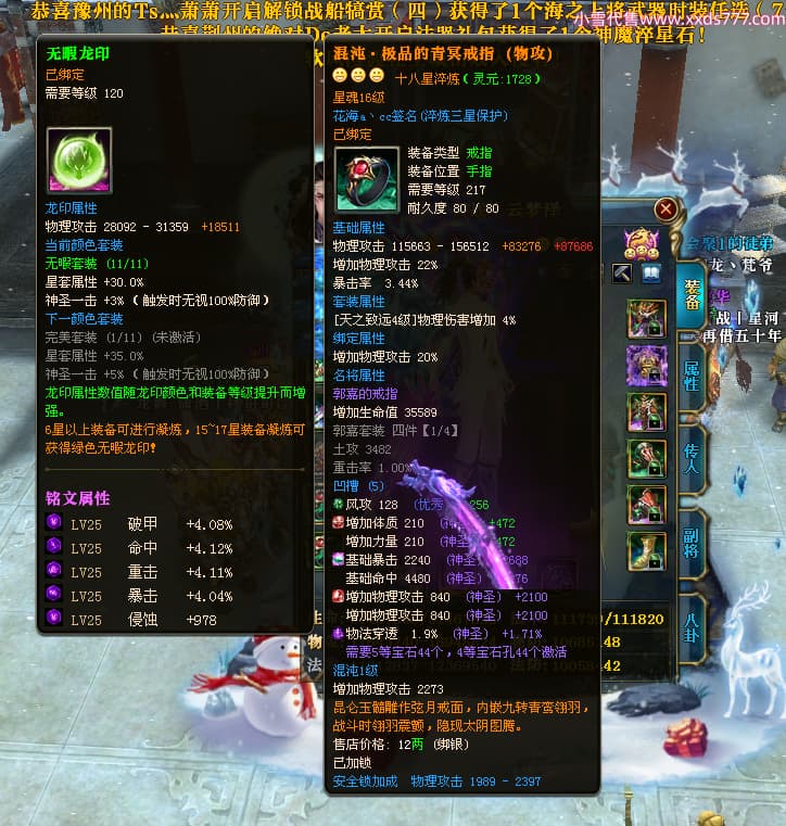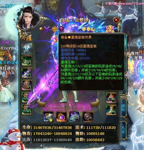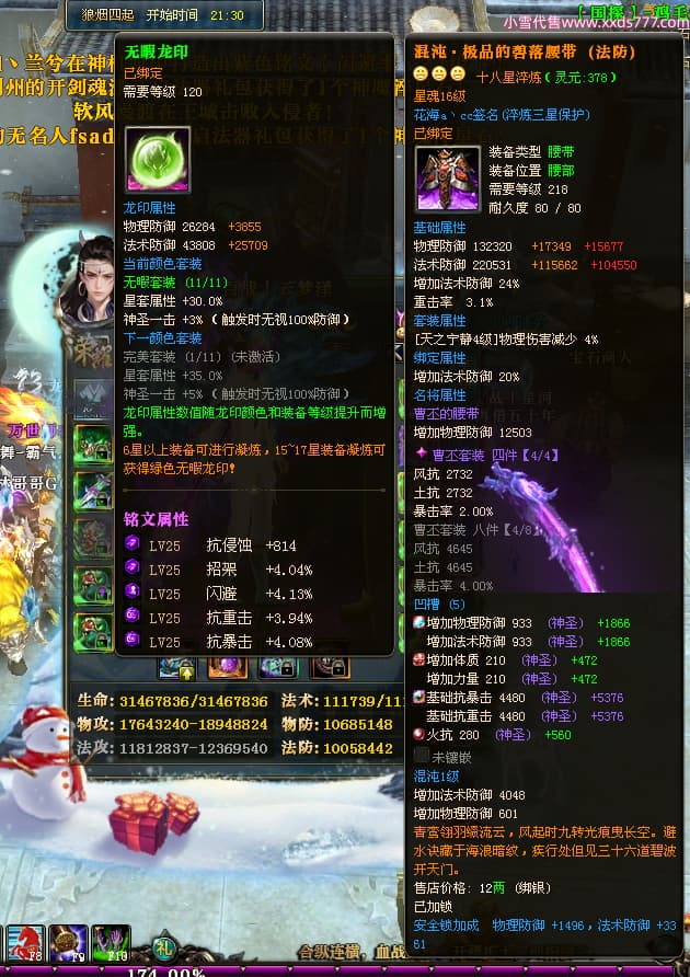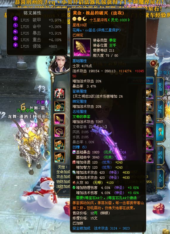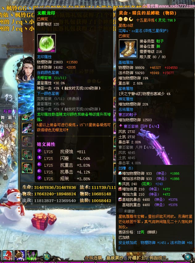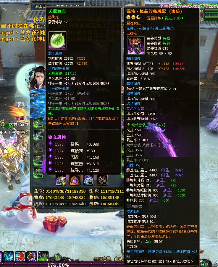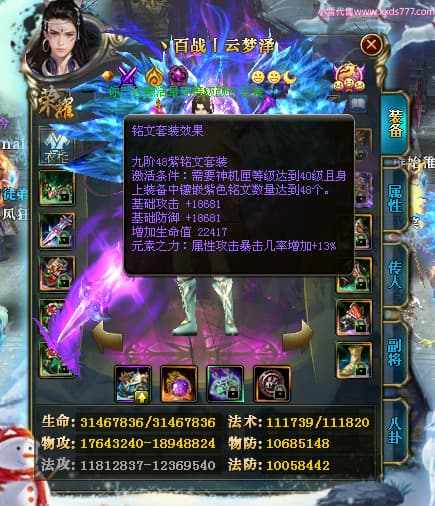 编号W24479 丶百战丨云梦泽 龙舞九州 荆州 世界排名40名 31210W战力 人物黄金极品橙15X(6件18X8件混沌) 传人史诗紫15X 副将精良紫15X 马黄金加强橙14X(双潜能66级65级) 史诗紫17披风 人物星魂16级 传人星魂16级 副将星魂9级 马星魂16级 人物铭刻2件18级1件16级其余15级 点亮16星 马铭刻15级 点亮14星 人物绿龙印(1件紫龙印) 马绿龙印 六等单双属性完美神圣石头 绿紫孔 已开启永久18星套