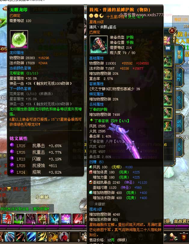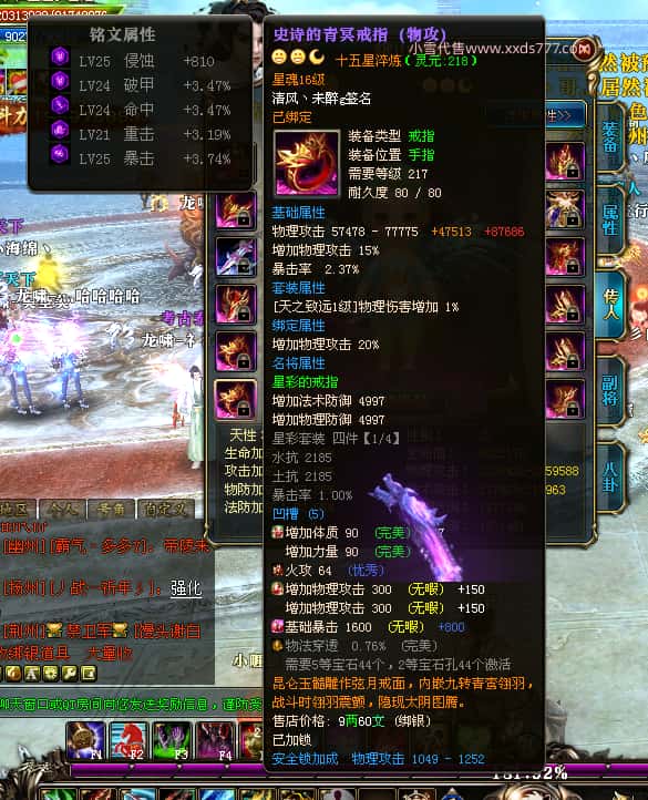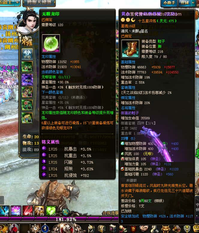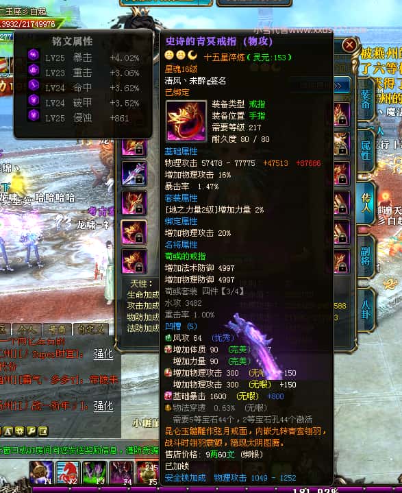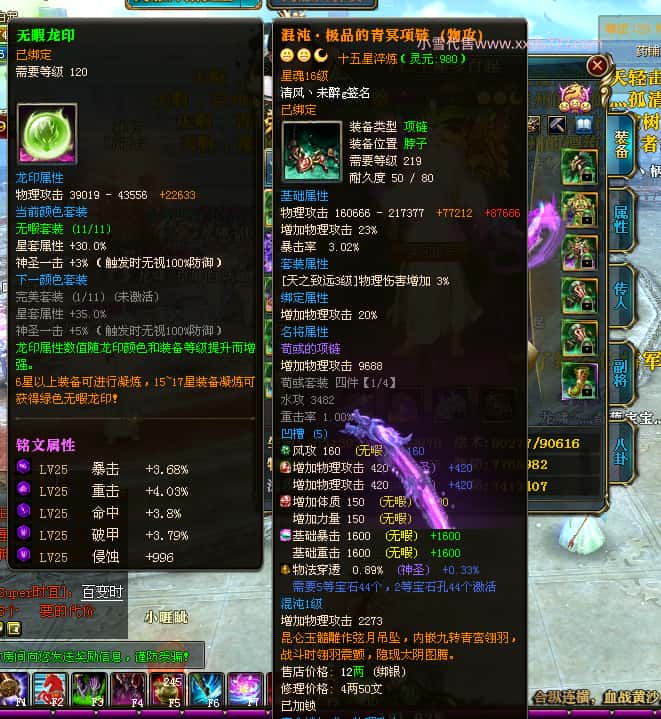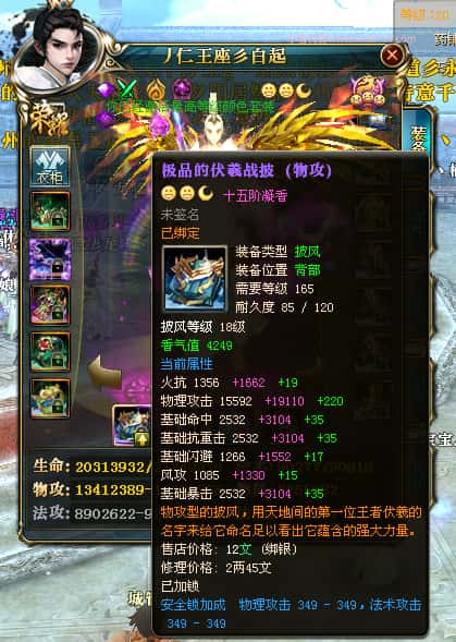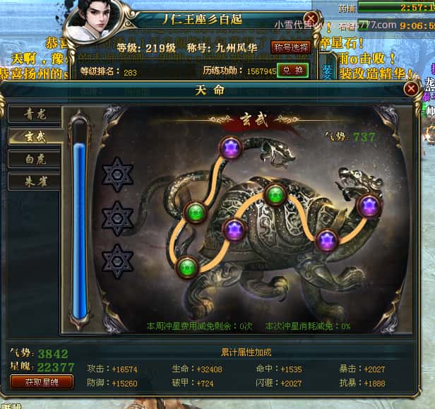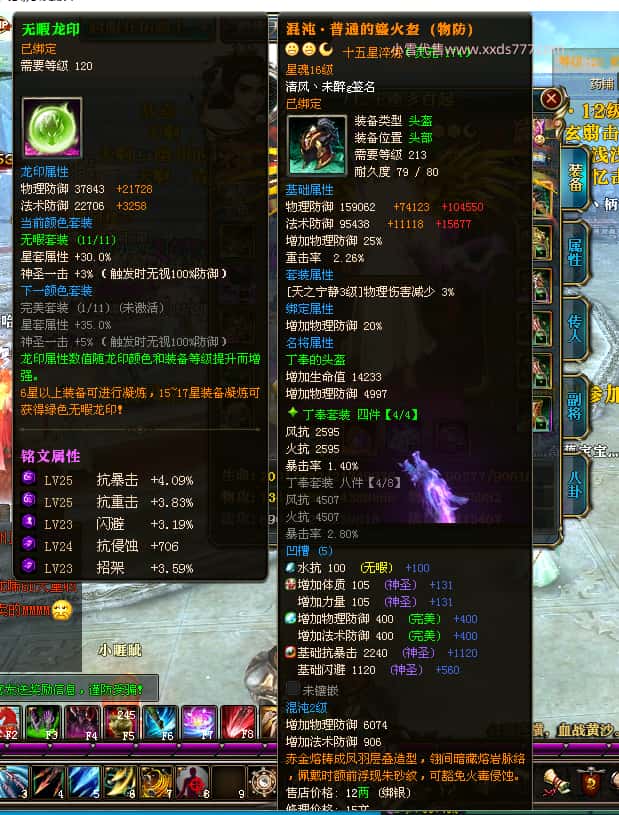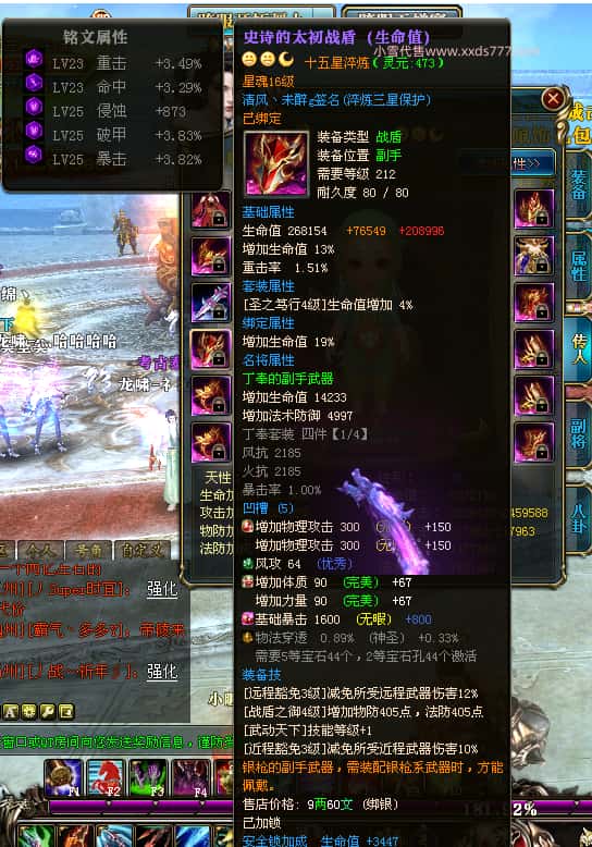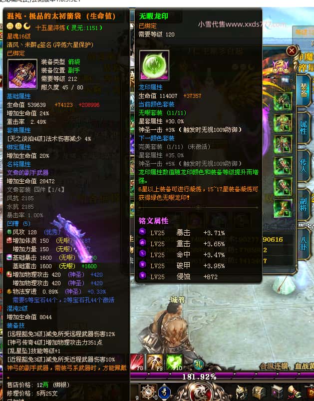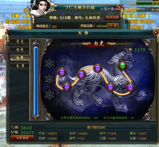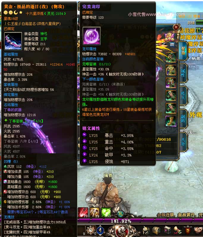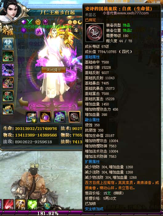 编号X24494 丿仁王座彡白起 龙啸风云 扬州 本国排名第39名 19597W战力 人物黄金史诗紫15X(7件混沌) 传人史诗紫15X 副将精良紫15X 马史诗紫12X 极品紫15披风 人物星魂16级 传人13级 副将6级 马星魂16级 人物铭刻7件16级(护腕/靴子15级) 点亮16星 马铭刻15级 点亮12星 人物1件紫+10件绿龙印 马黄龙印 五六等单双属性神圣完美无瑕石头 绿黄蓝孔 已开1次永久15星套