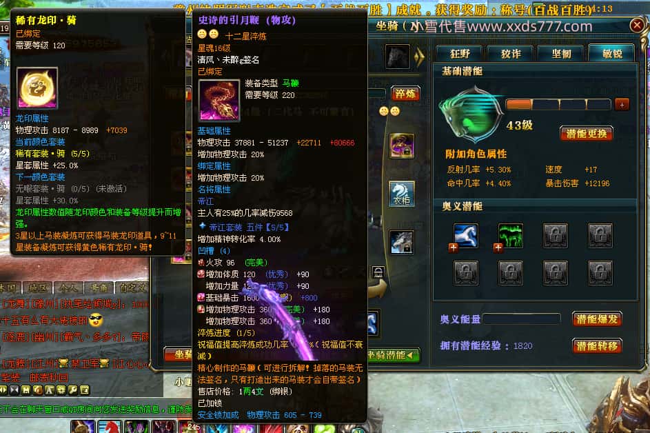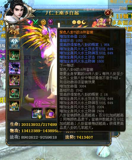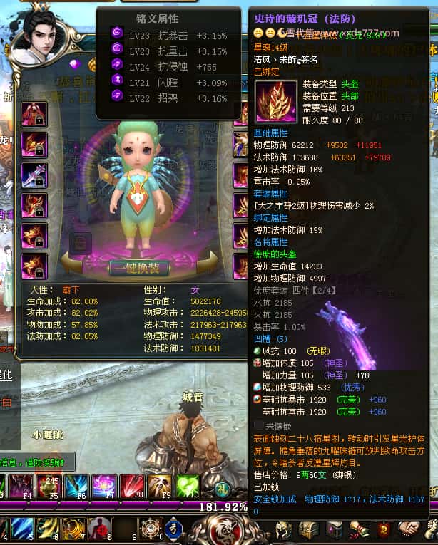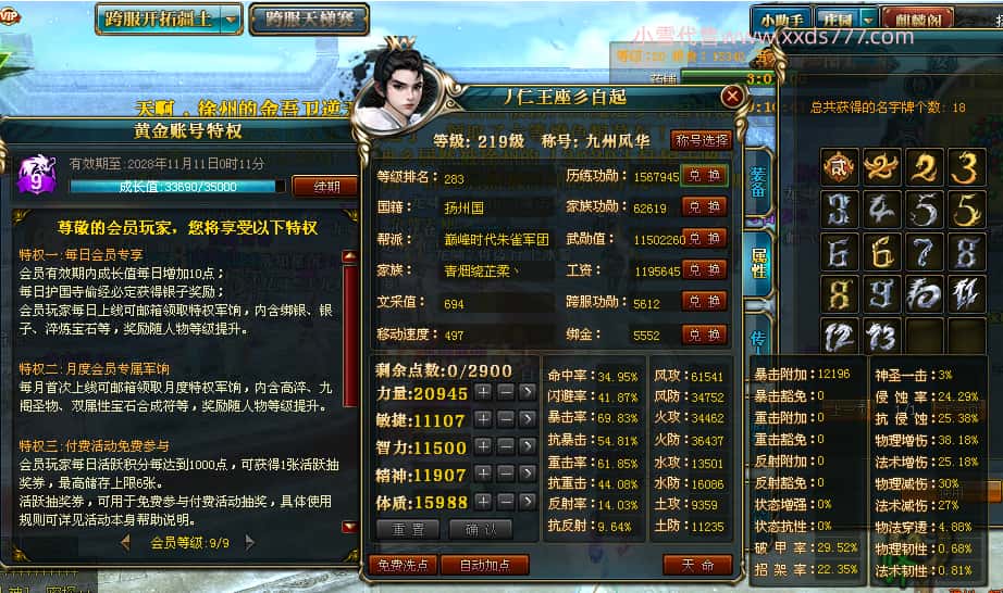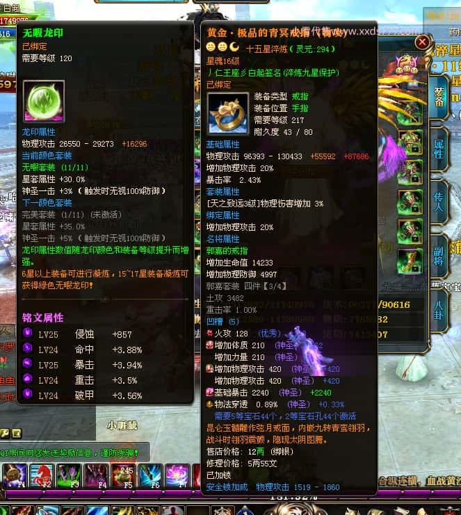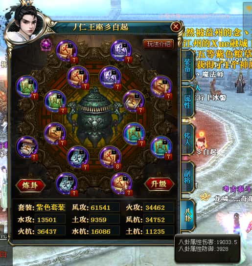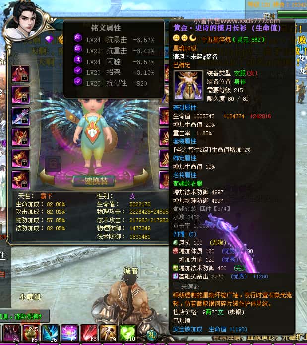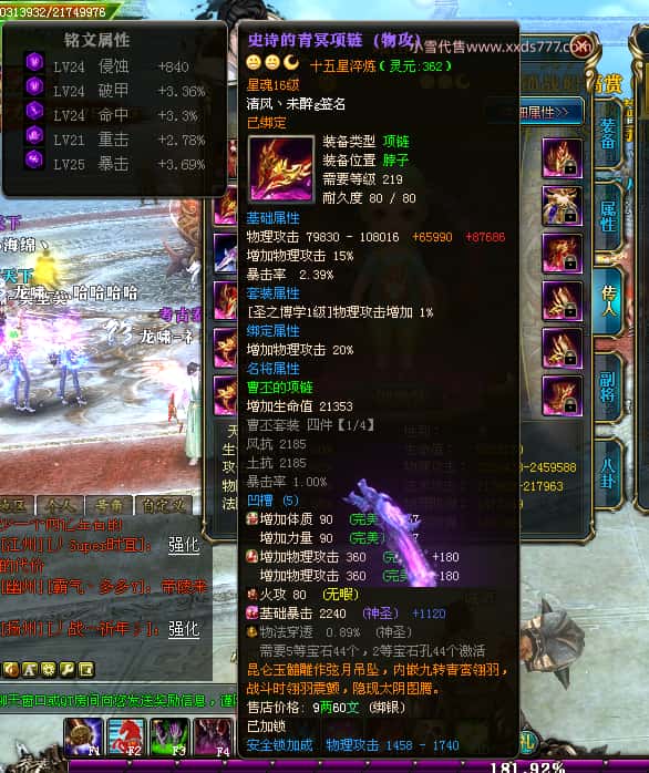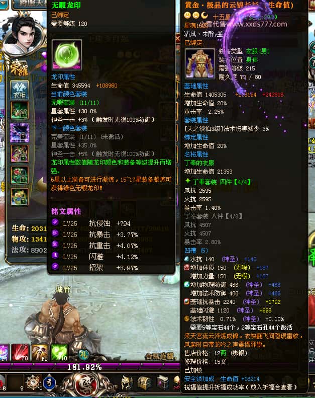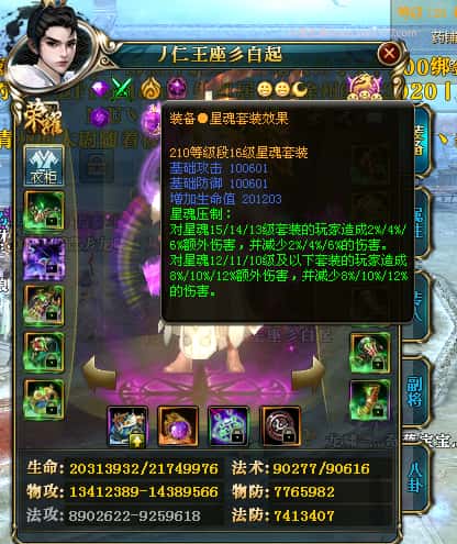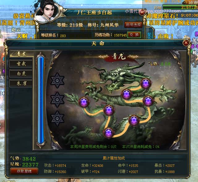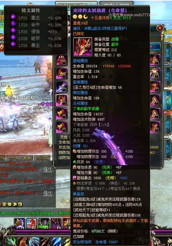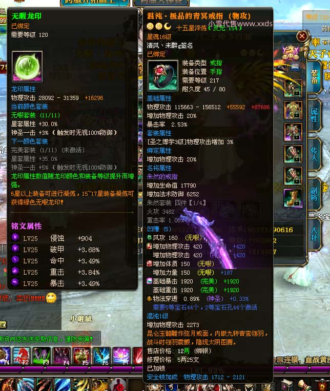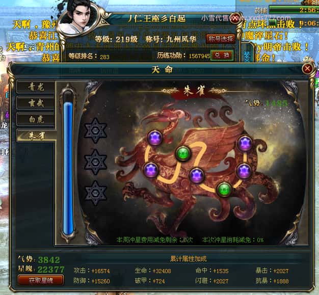 编号X24494 丿仁王座彡白起 龙啸风云 扬州 本国排名第39名 19597W战力 人物黄金史诗紫15X(7件混沌) 传人史诗紫15X 副将精良紫15X 马史诗紫12X 极品紫15披风 人物星魂16级 传人13级 副将6级 马星魂16级 人物铭刻7件16级(护腕/靴子15级) 点亮16星 马铭刻15级 点亮12星 人物1件紫+10件绿龙印 马黄龙印 五六等单双属性神圣完美无瑕石头 绿黄蓝孔 已开1次永久15星套