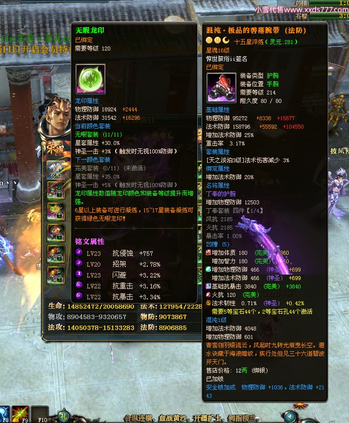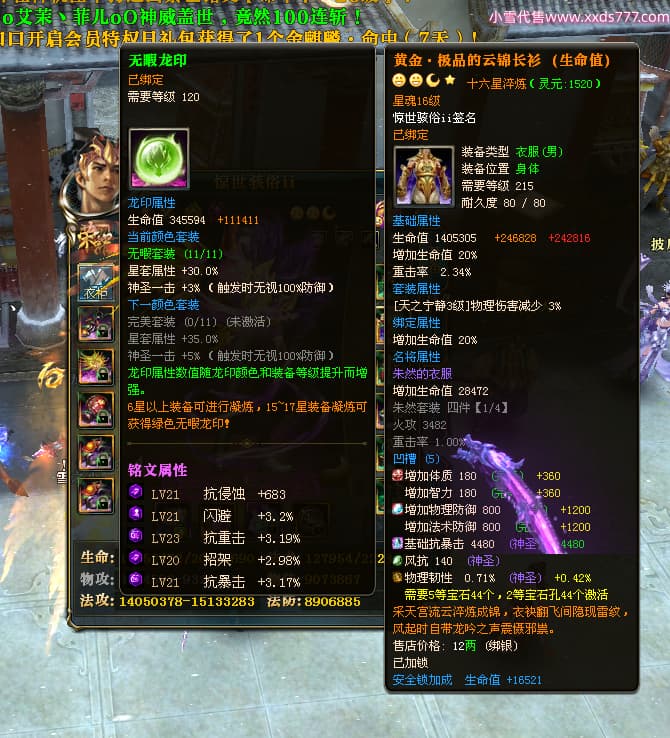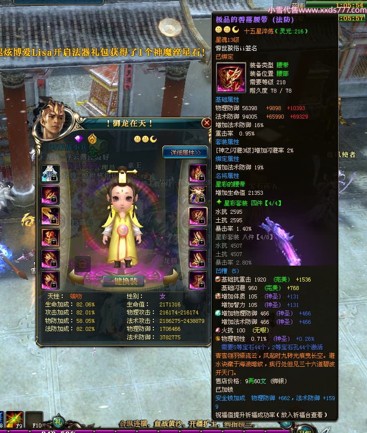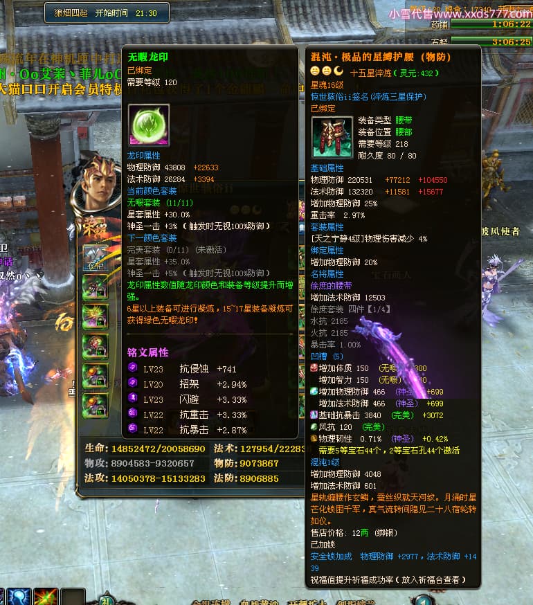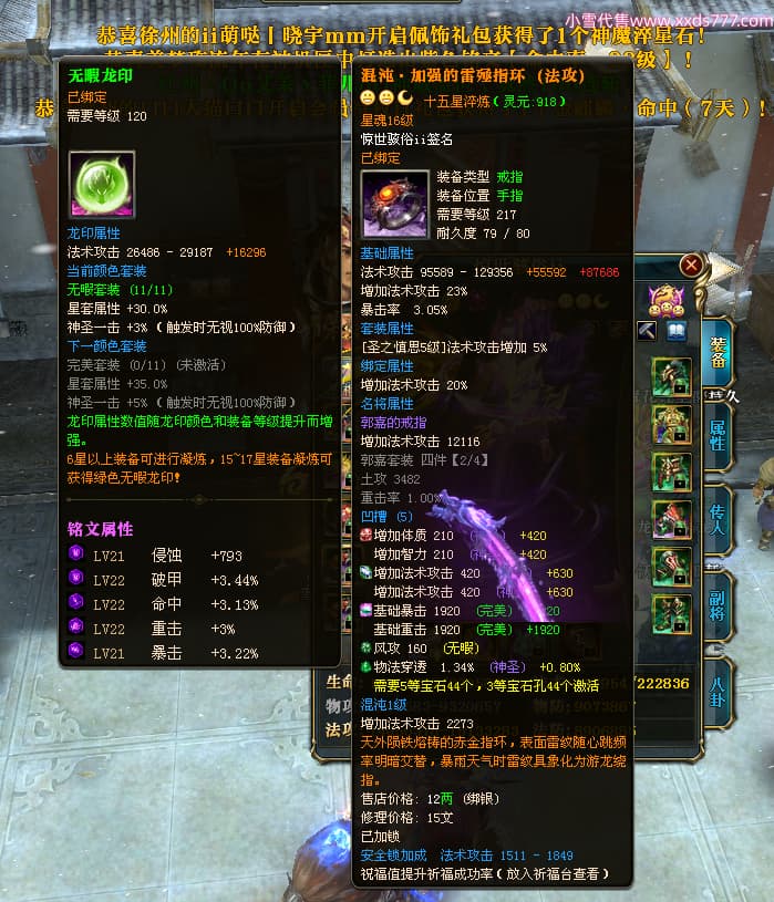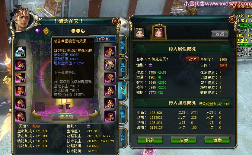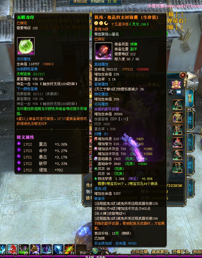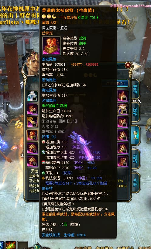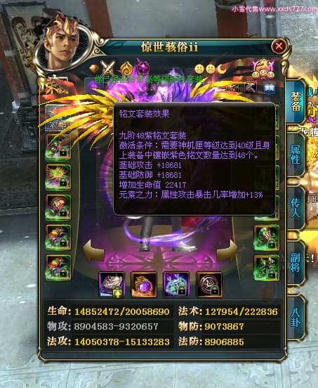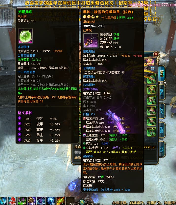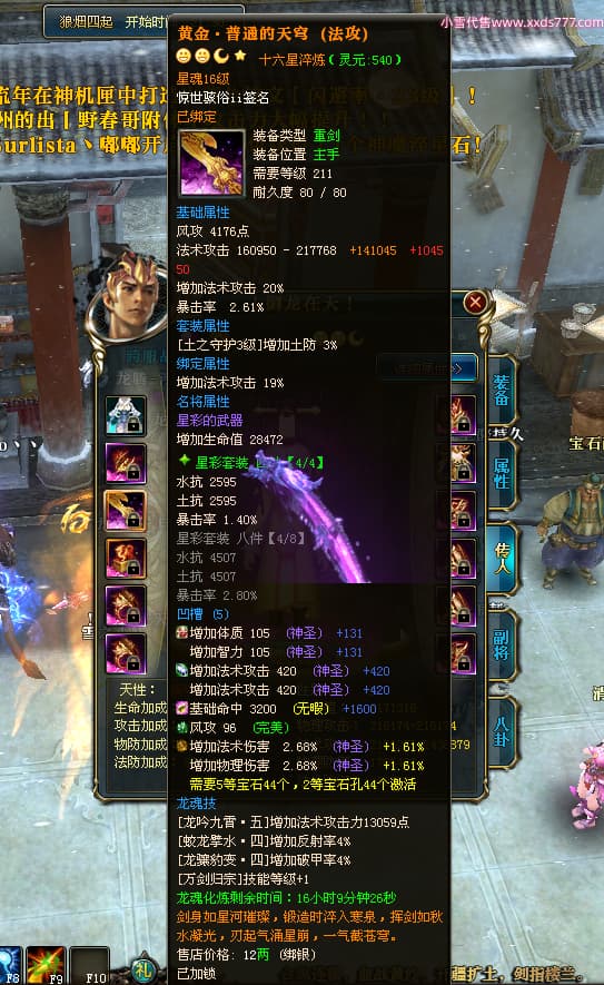 编号T24500 惊世骇俗ii 龙腾问鼎 幽州 本国排名14名 20943W战力 人物黄金普通橙15X(9件混沌) 传人极品紫15X 副将史诗紫15X 马普通橙12X 精良紫15披风 人物星魂16级 传人星魂13级 副将星魂7级 马星魂15级 人物铭刻2件16级其余15级 人物点亮16星 马铭刻3件13级其余12级 点亮12星 人物绿龙印 马黄龙印 六等单双属性完美无暇神圣石头 黄绿孔 可以转移百分百安全