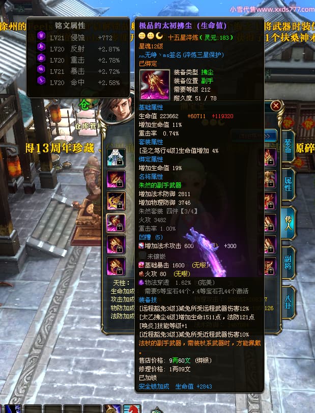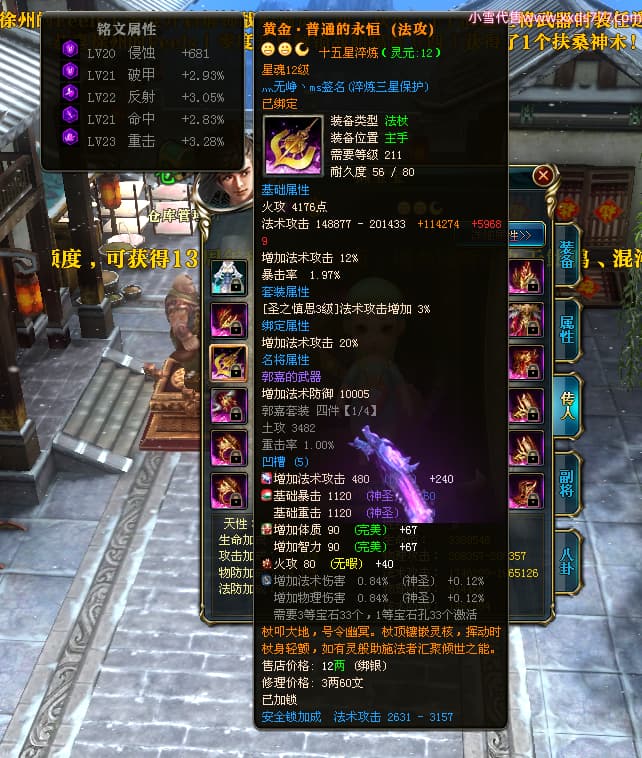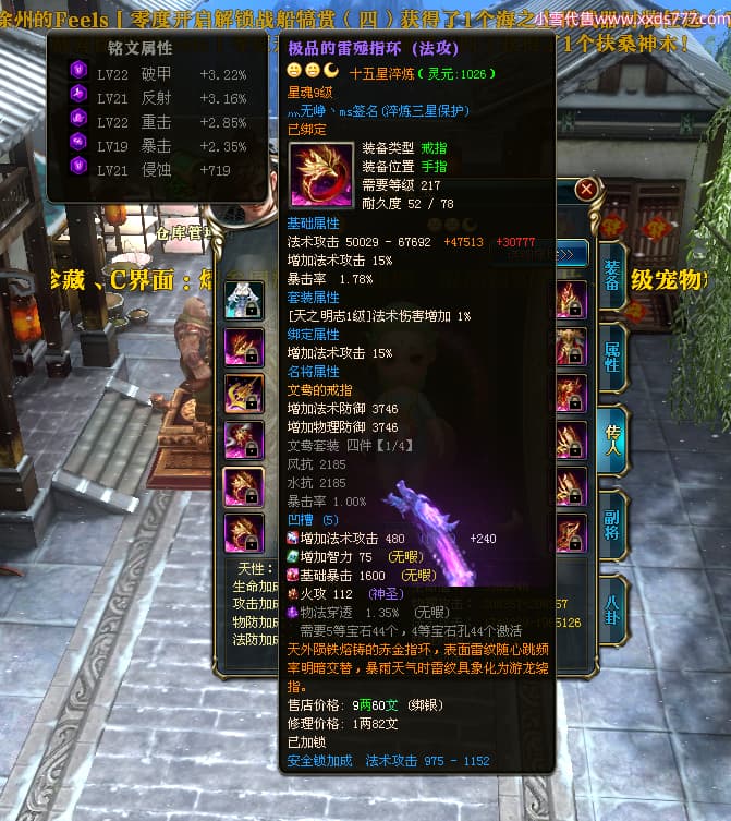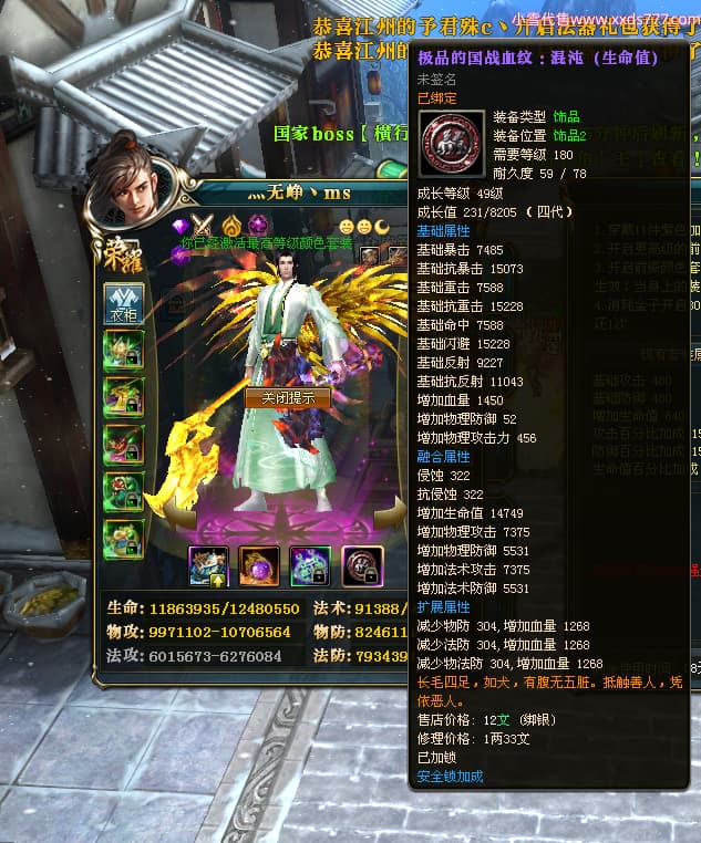 编号Z24502 灬无峥丶ms 逐鹿天下 豫州 本国排名32名 14395W战力 人物极品紫15X(3件混沌) 传人极品紫15X 副将极品紫15X 马史诗紫12X 精良紫14披风 人物星魂16级 传人星魂6级 副将星魂6级 马星魂10级 人物铭刻15级 人物点亮16星 马铭刻12级 点亮12星 人物绿龙印 马黄龙印 五六等单双属性完美无暇石头 黄蓝孔