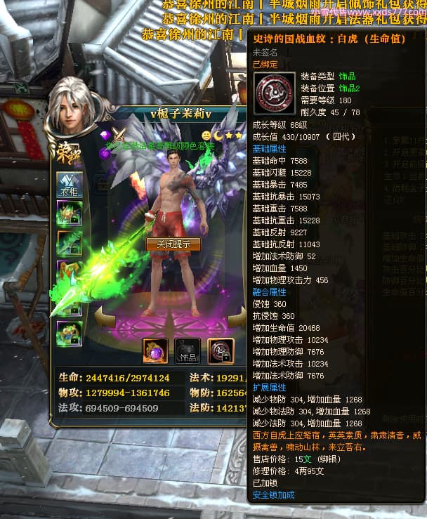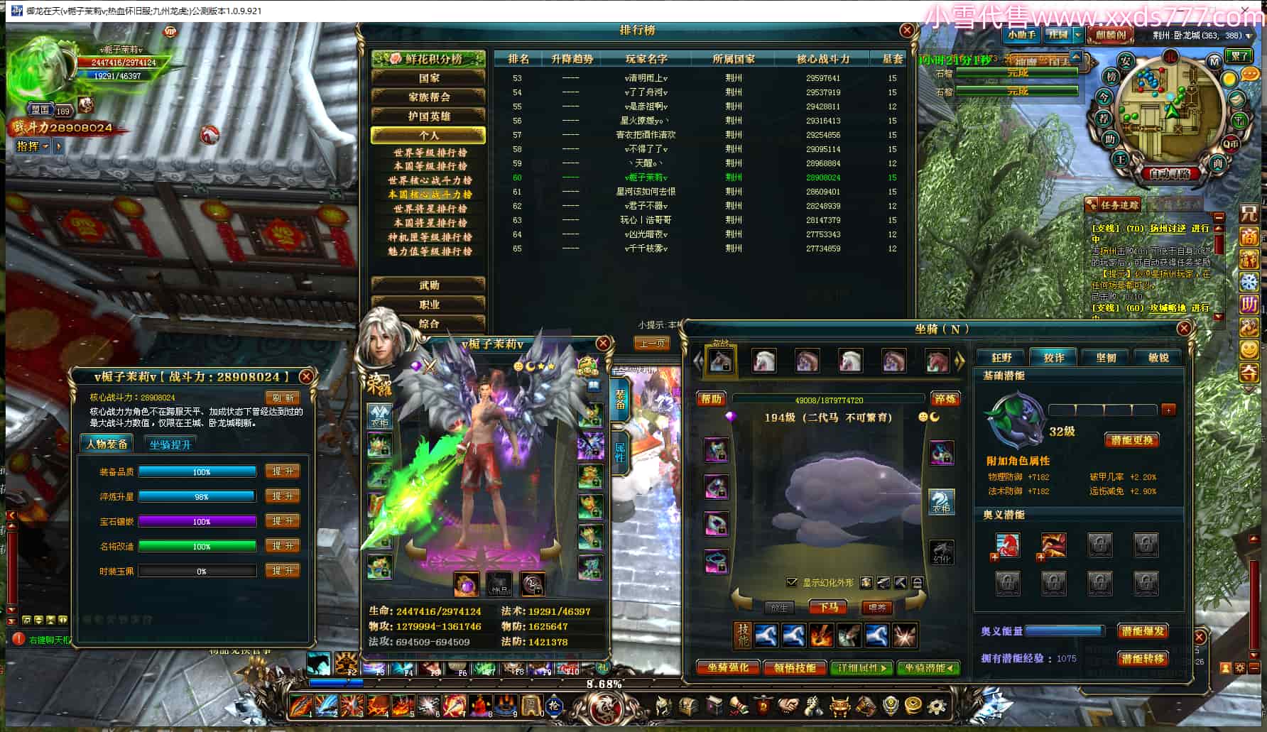 编号J24515 v栀子茉莉v 九州龙虎 荆州 本国排名60名 2890W战力 人物黄金极品紫11X 马精良紫9X 人物绿龙印(1件紫龙印) 马黄龙印 六等单双属性石头 已开完永久15星套 可以转移百分百安全