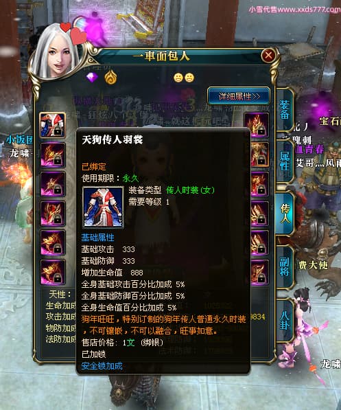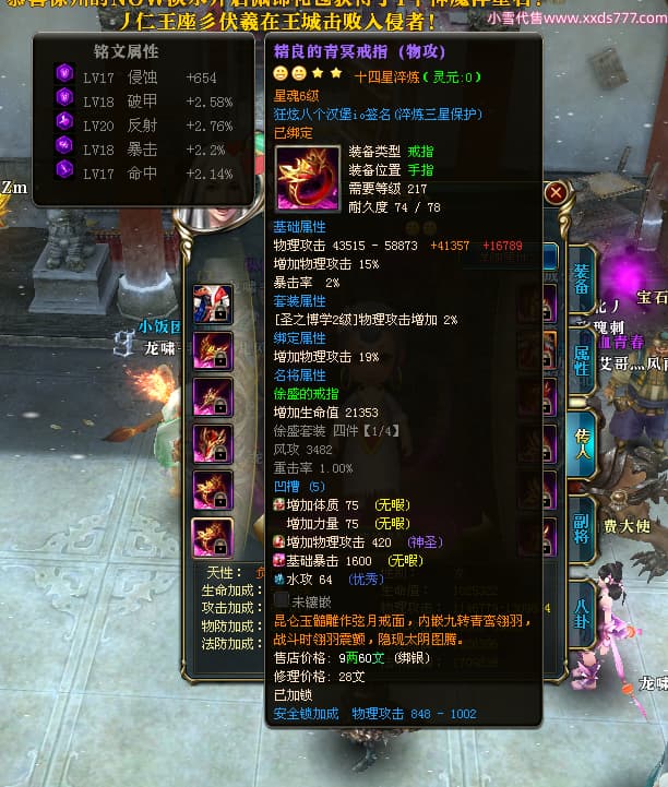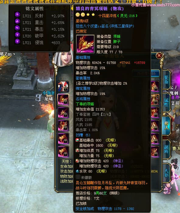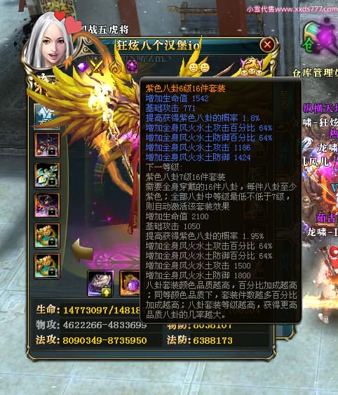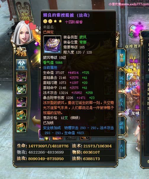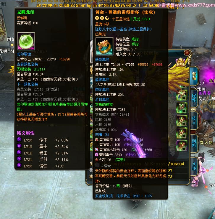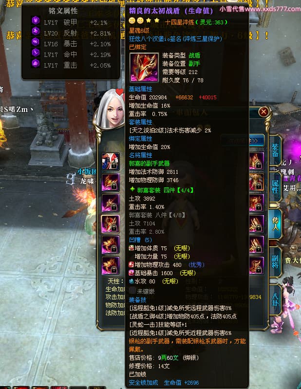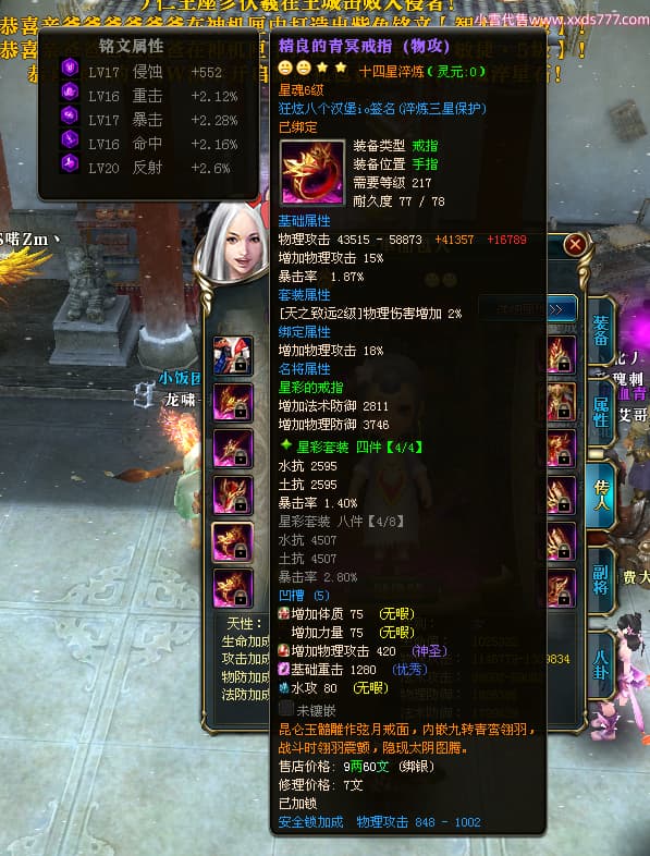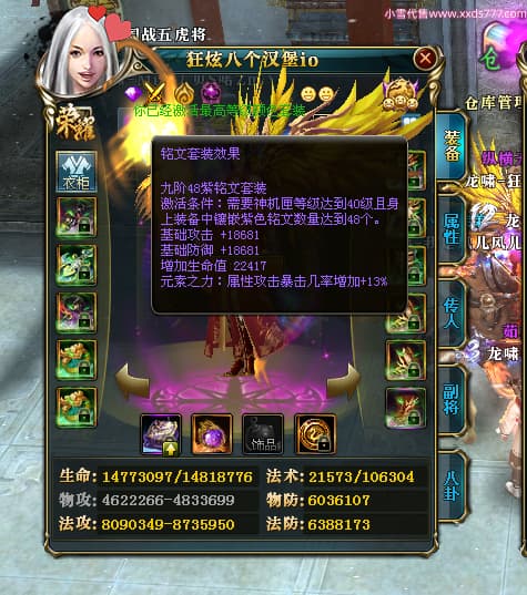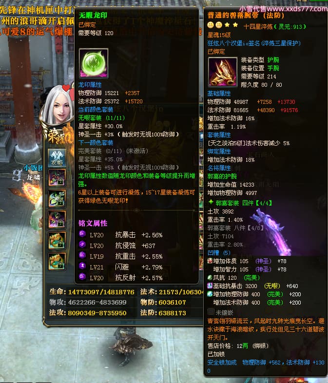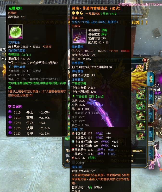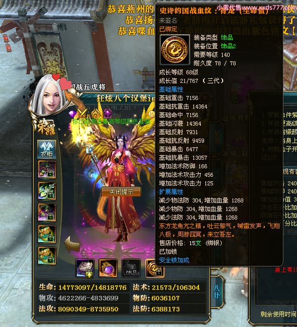 编号X24516 狂炫八个汉堡io 龙啸风云 幽州 本国排名58名 12213W战力 人物普通橙14X(7件15X4件混沌) 传人精良紫12X 副将精良紫12X 马史诗紫11X 精良紫14披风 人物星魂15级 传人星魂6级 副将星魂6级 马星魂8级 人物铭刻15级 人物点亮14星 马铭刻12级 点亮12星 人物绿龙印 马蓝龙印 五等单双属性神圣完美优秀石头 蓝白孔