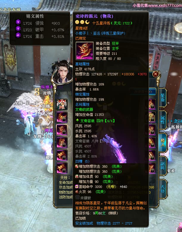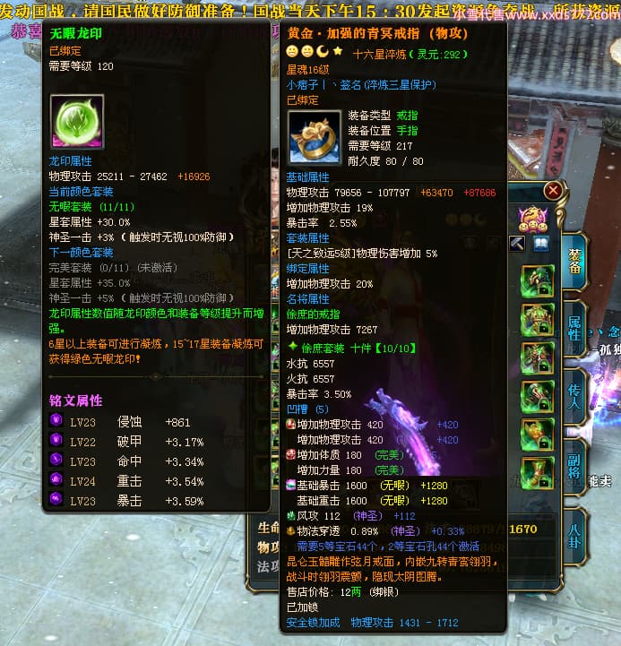 编号T24518 武丶唐旭 龙腾问鼎 幽州 本国排名24名 16949W战力 人物黄金普通橙15X(2件17X5件16X5件混沌) 传人史诗紫15X 副将精良紫15X 马普通橙11X 精良紫15披风 人物星魂16级 传人星魂7级 副将星魂6级 马星魂10级 人物铭刻15级 人物点亮16星 马铭刻12级 点亮12星 人绿龙印 马黄龙印 六等单双属性神圣完美无瑕石头 黄蓝孔