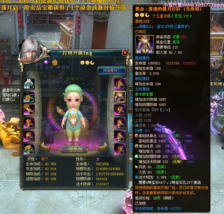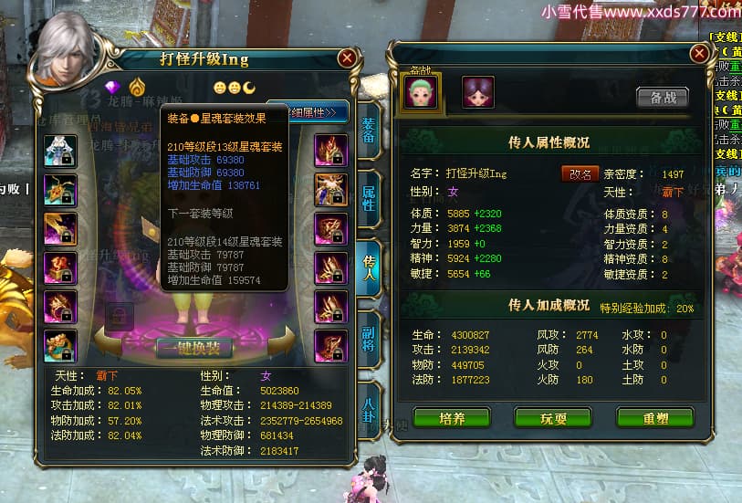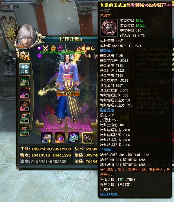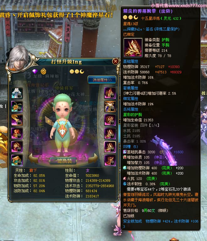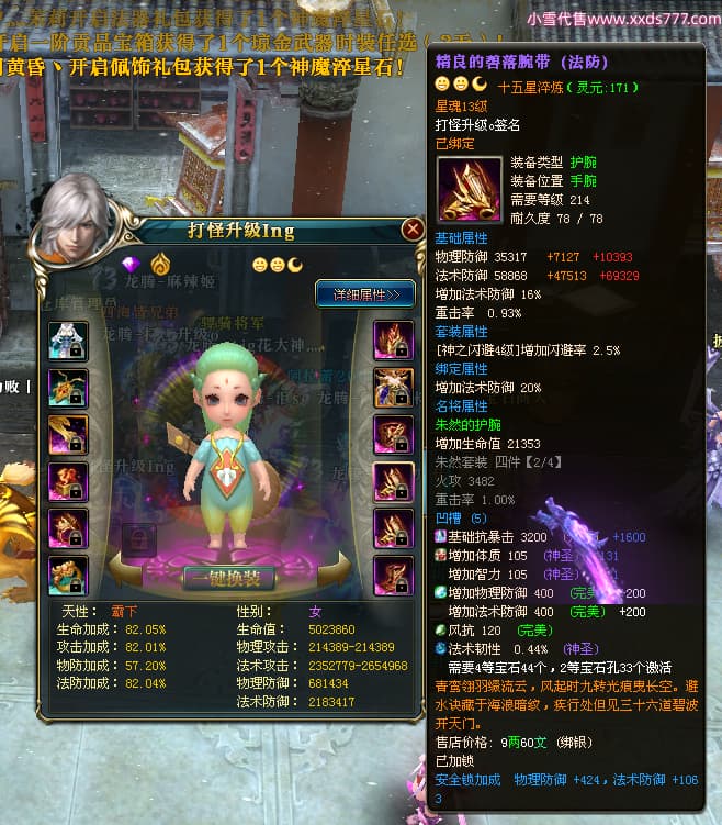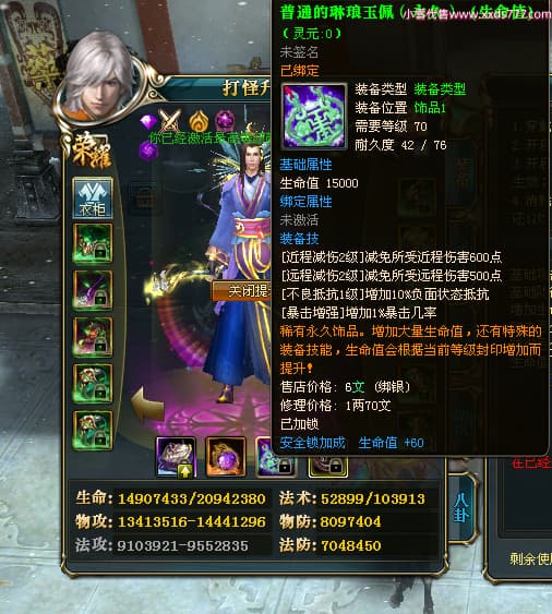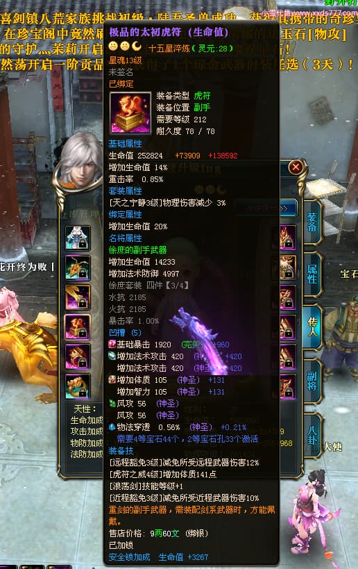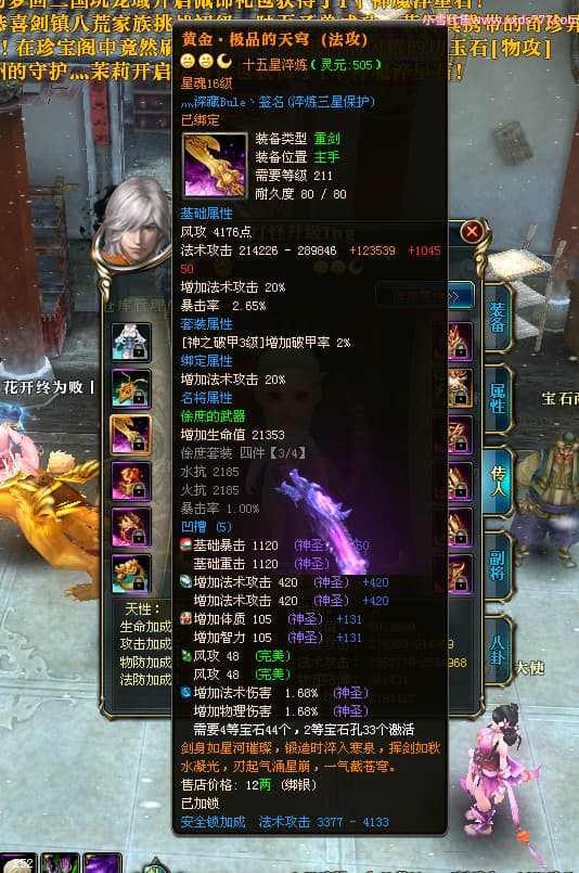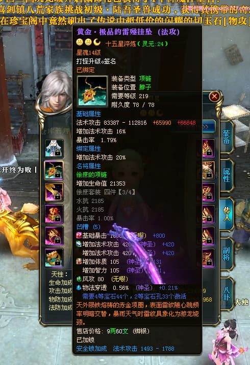 编号T24524 打怪升级o 龙腾问鼎 益州 本国排名14名 20421W战力 人物黄金普通橙15X(8件混沌) 传人精良紫15X 副将精良紫15X 马加强橙12X 精良紫15披风 人物星魂16级 传人星魂13级 副将星魂6级 马星魂15级 人物铭刻15级 人物点亮16星 马铭刻12级 点亮12星 人物绿龙印 马黄龙印 六等单双属性完美无暇神圣石头 黄孔