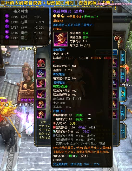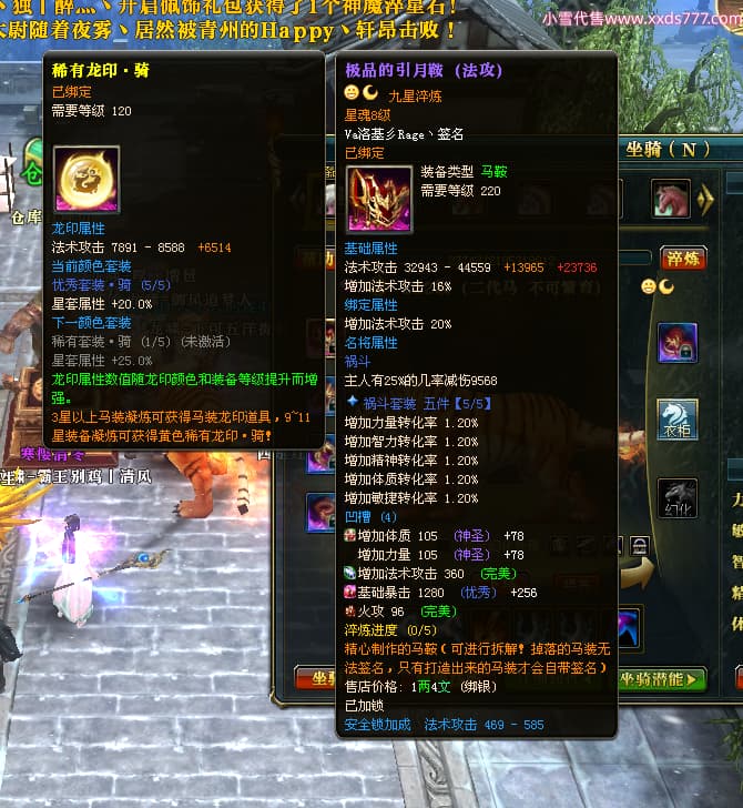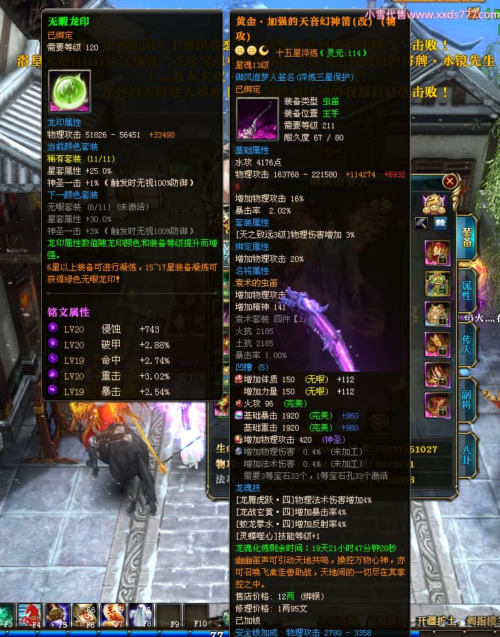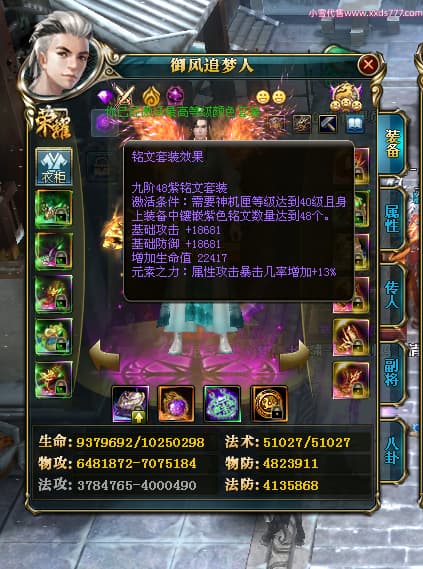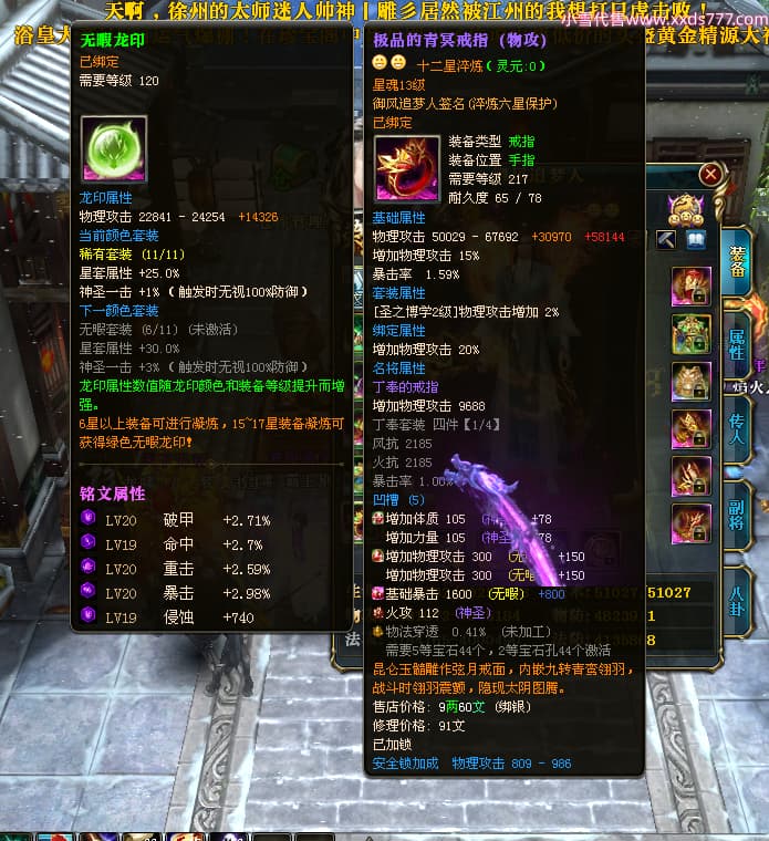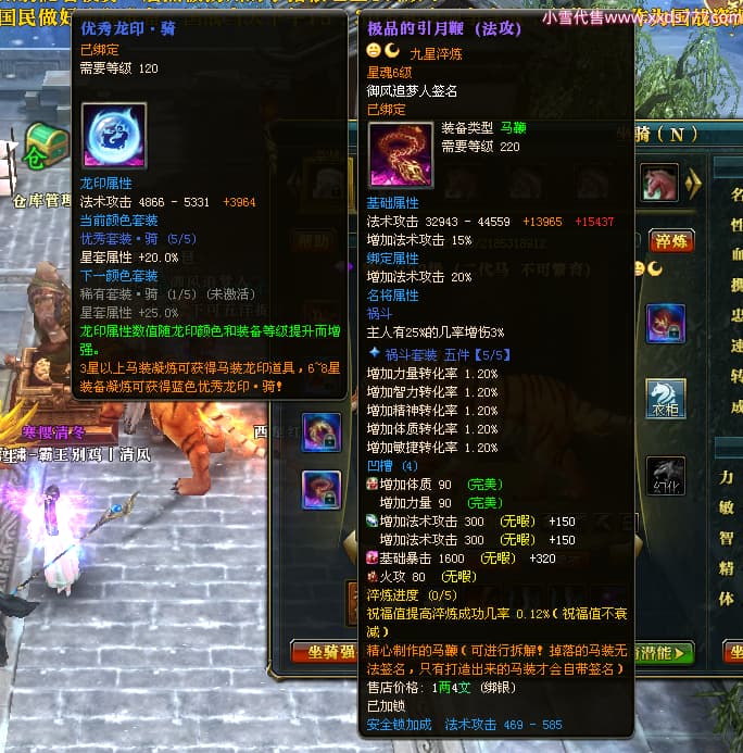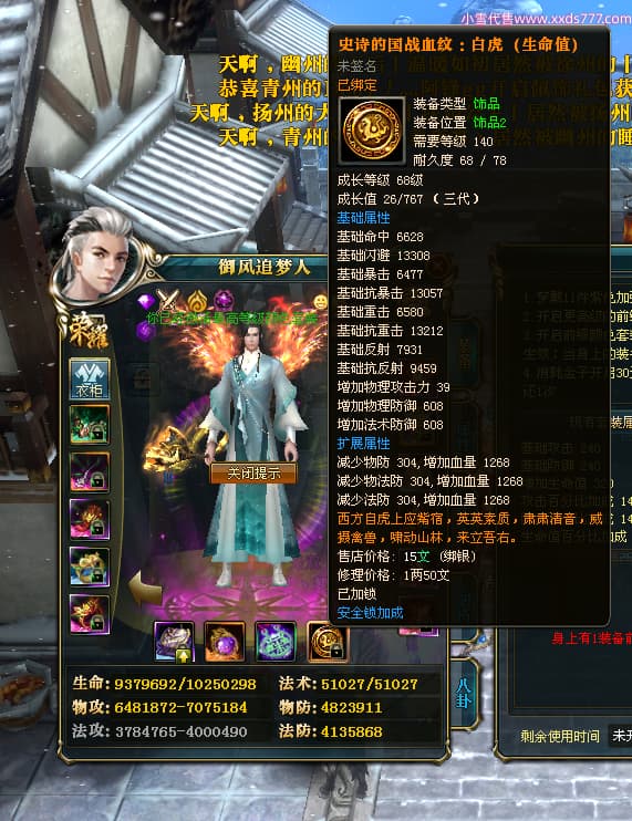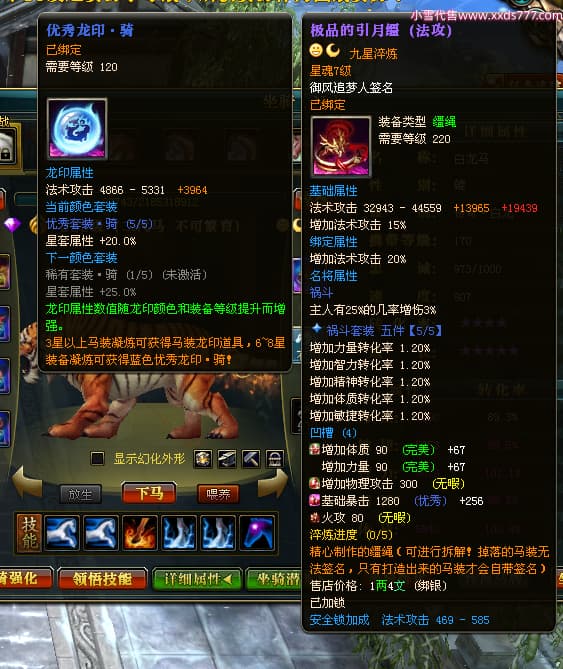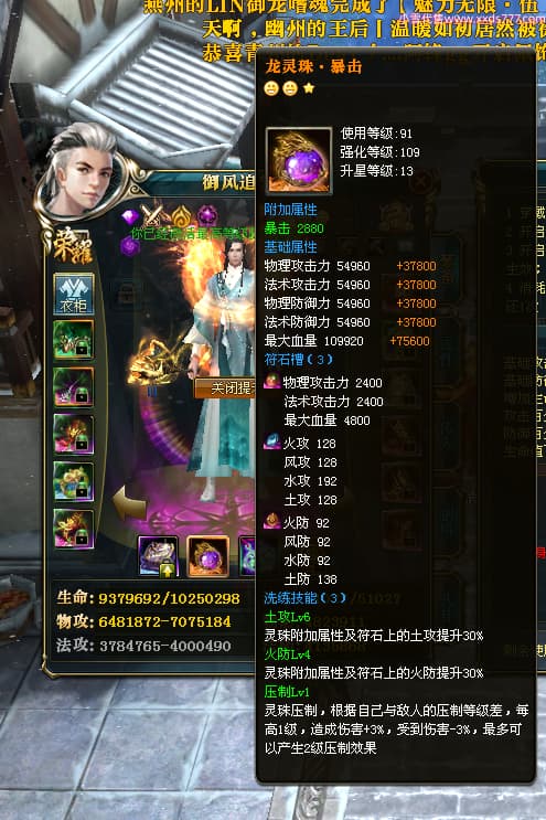 编号X24564 御风追梦人 龙啸风云 江州 8728W战力 人物精良紫12X(2件15X) 传人精良紫12X 马极品紫9X 加强紫14X披风 人物星魂12级 传人6级 马6级 人物铭刻3件15级1件14级1件13级其余12级 点亮2件16星3件14星其余12星 马铭12级 点亮10星 人物黄龙印(6件绿龙印) 马蓝龙印(1件黄龙印) 五等单双属性神圣完美无暇石头 白孔