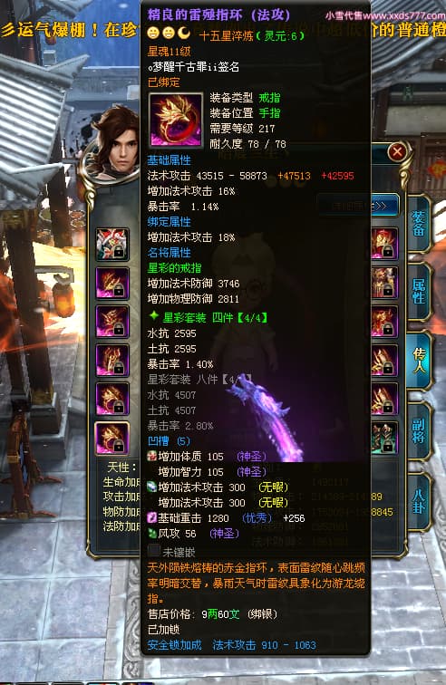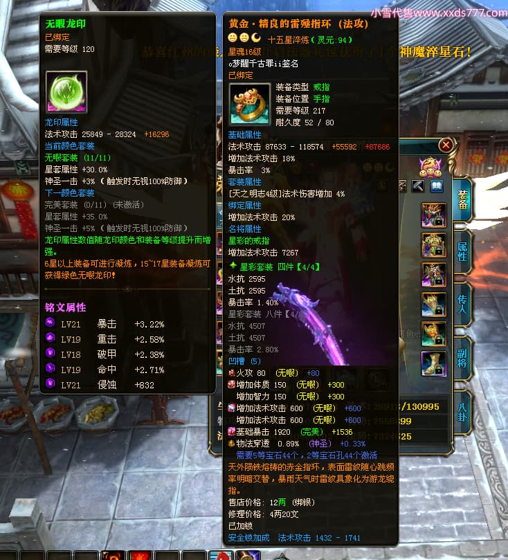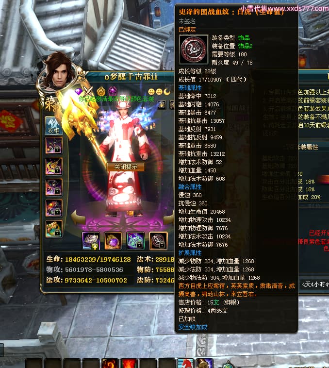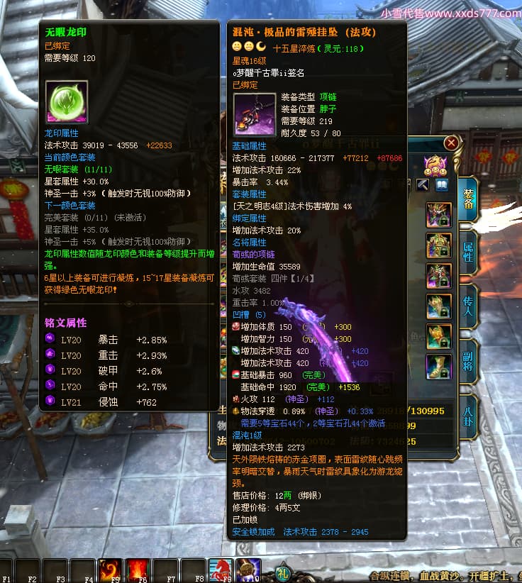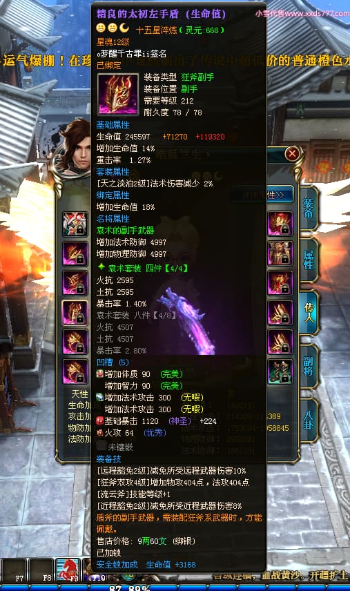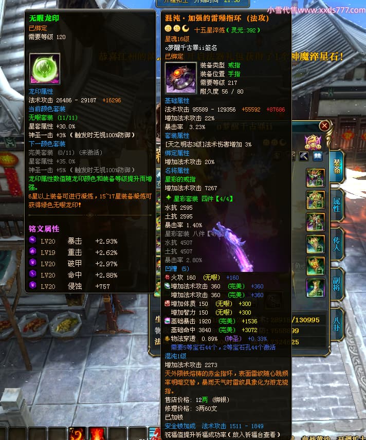 编号T24577 o梦醒千古罪ii 龙腾问鼎 豫州 本国排名25名 15772W战力 人物黄金普通橙15X(5件混沌) 传人精良紫15X 副将精良紫12X 马普通橙10X 精良紫15披风 人物星魂16级 传人星魂11级 副将星魂6级 马星魂11级 人物铭刻15级 点亮16星 马铭刻12级 点亮10星 人物绿龙印 马黄龙印 六等单双属性完美无暇神圣石头 黄蓝孔