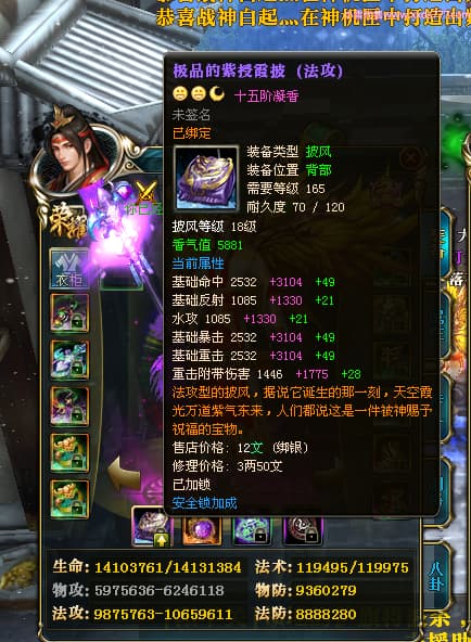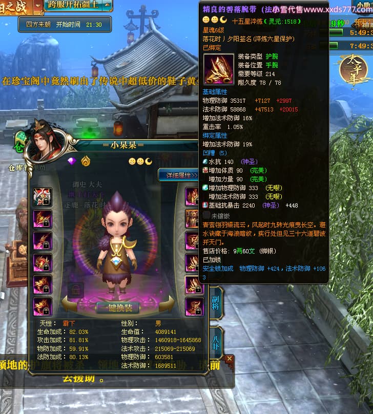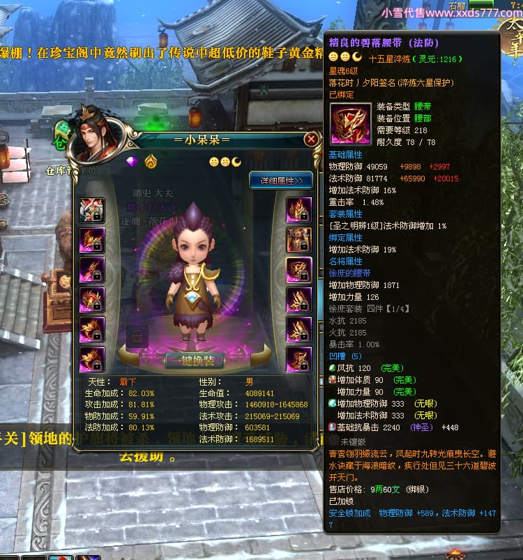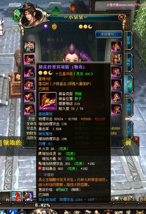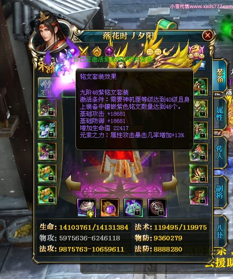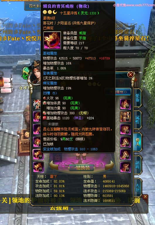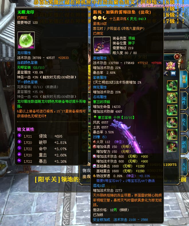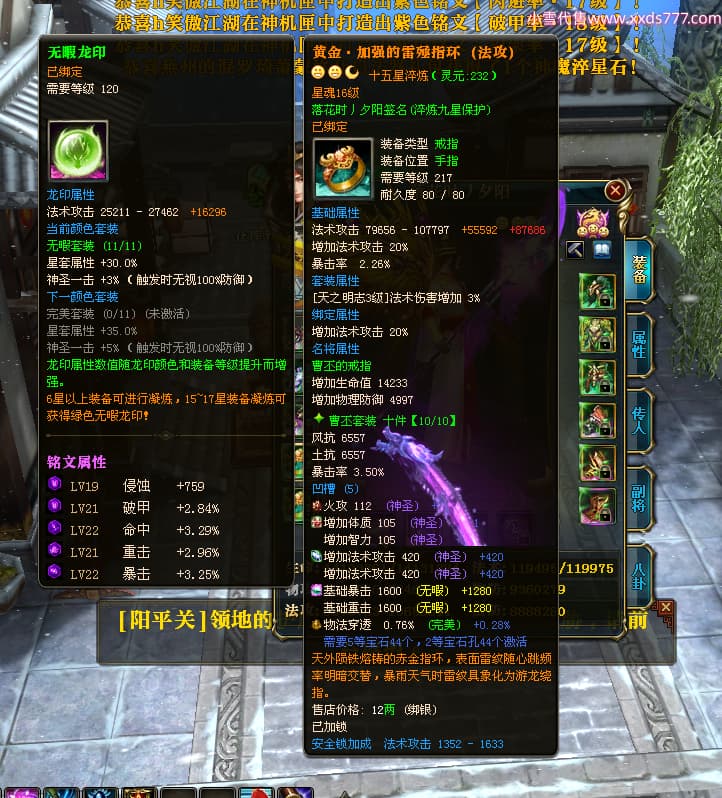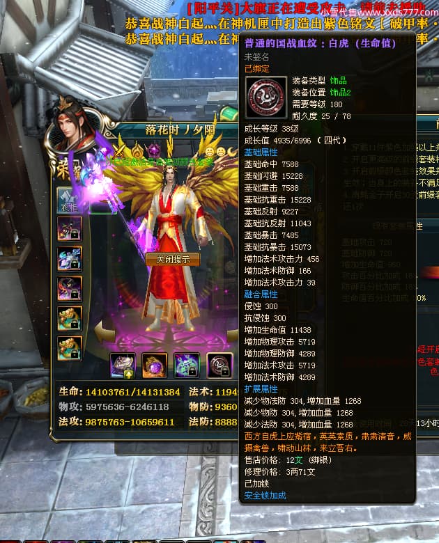 编号Z24624 落花时丿夕阳 逐鹿天下 益州 本国排名24名 15759W战力 人物黄金普通橙15X(5件混沌) 传人精良紫15X 副将精良紫12X 马史诗紫12X 极品紫15披风 人物星魂16级 传人星魂6级 副将星魂6级 马星魂10级 人物铭刻15级 差一件戒指点亮16星 马铭刻12级 点亮12星 人物绿龙印 马黄龙印 五六等单双属性神圣完美无暇石头 蓝黄孔