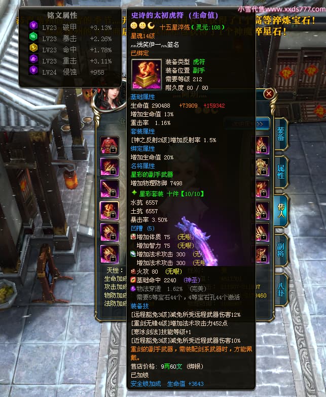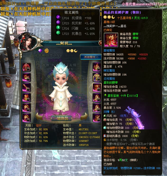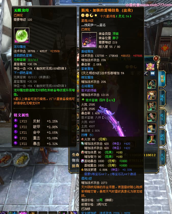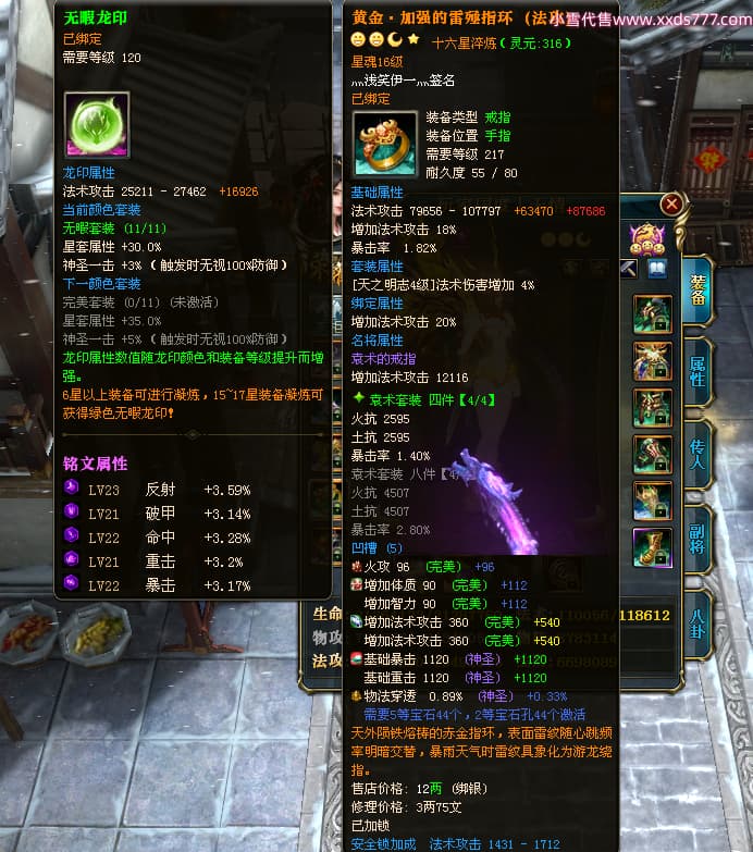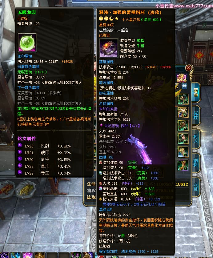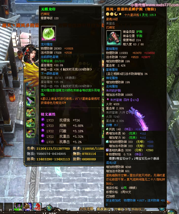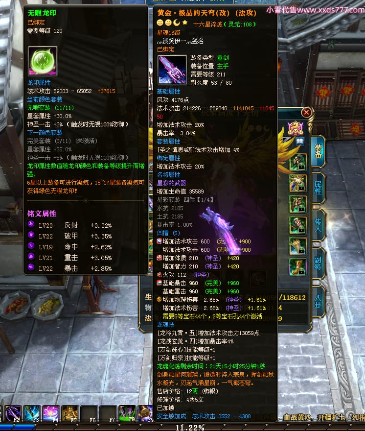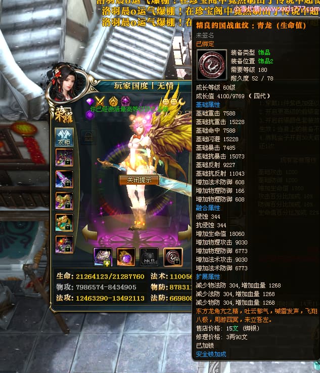 编号W24628 玩家国度丨无情 龙舞九州 益州 本国排名9名 18720W战力 人物黄金加强橙16X(5件混沌) 传人极品紫15X 副将精良紫12X 马加强橙12X 精良紫15披风 人物星魂16级 传人星魂13级 副将星魂6级 马星魂12级 人物铭刻16级 人物点亮16星 马铭刻12级 点亮12星 人物绿龙印 马黄龙印 五六等单双属性完美无暇神圣石头 蓝黄孔