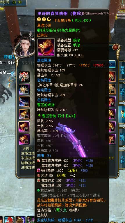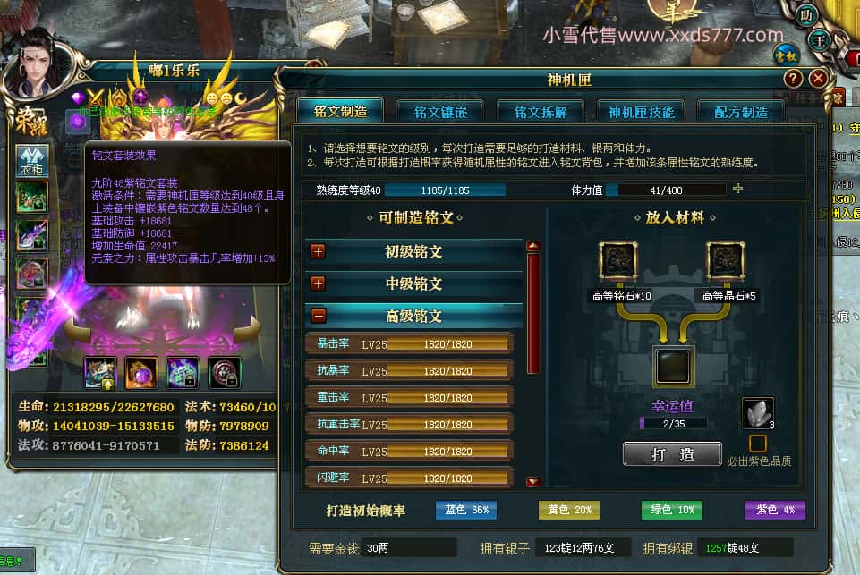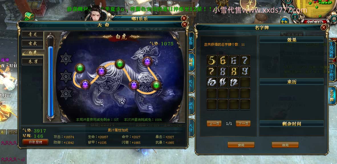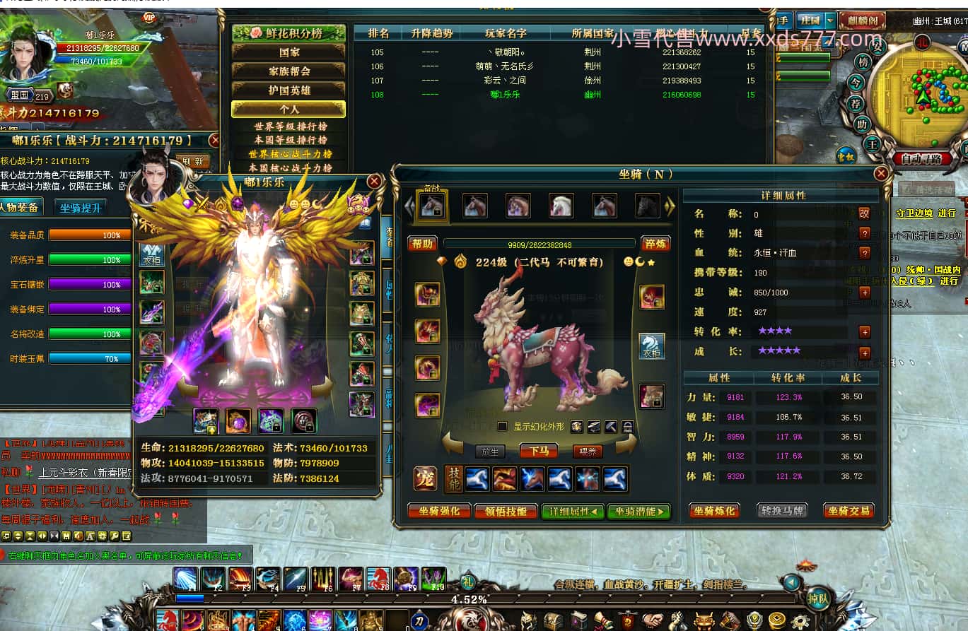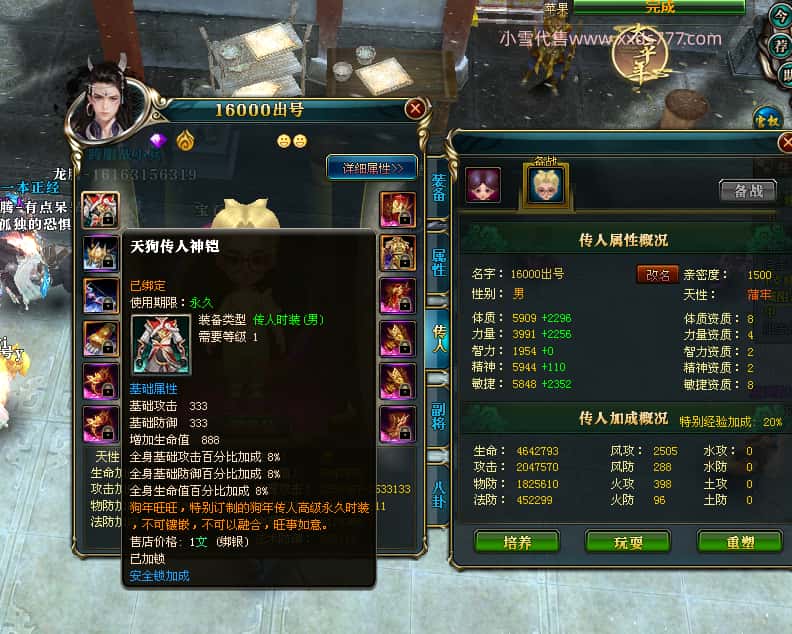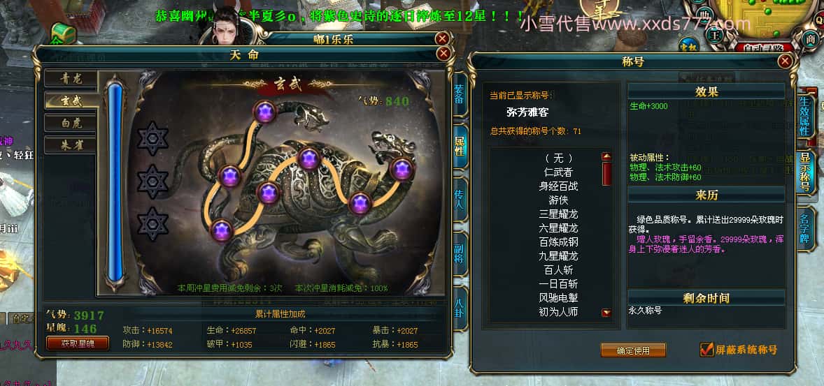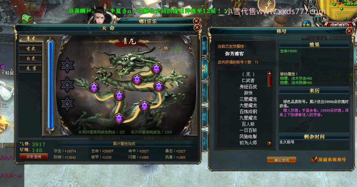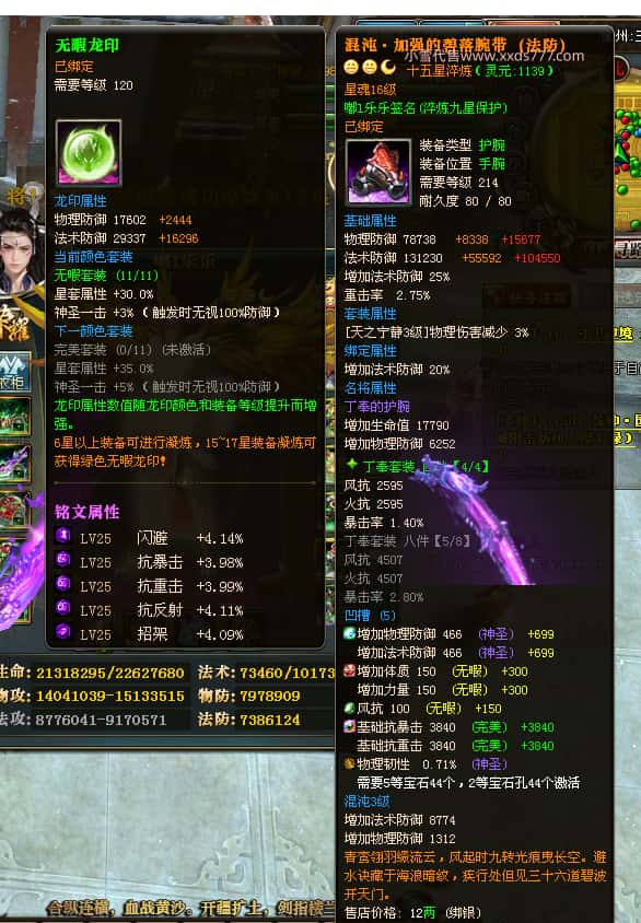 编号T24647 嘟l乐乐 龙腾问鼎 幽州 本国排名11名 21471W战力 人物黄金极品紫15X(武器18X 8件混沌) 传人极品紫12X 副将史诗10X 马普通橙10X 极品紫15披风 人物星魂16级 传人星魂13级 副将星魂6级 马星魂16级 人物铭刻1件17级其余16级 点亮16星 马铭刻15级 点亮12星 人物绿龙印 马黄龙印 五六等单双属性完美神圣石头 黄绿孔 可以转移百分百安全
