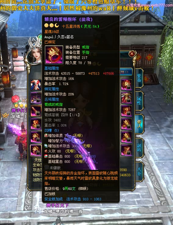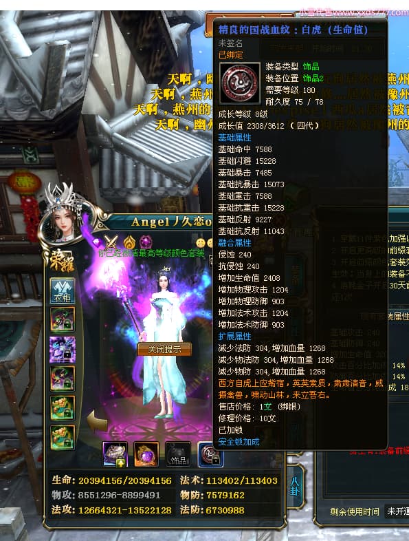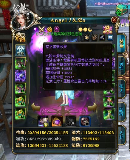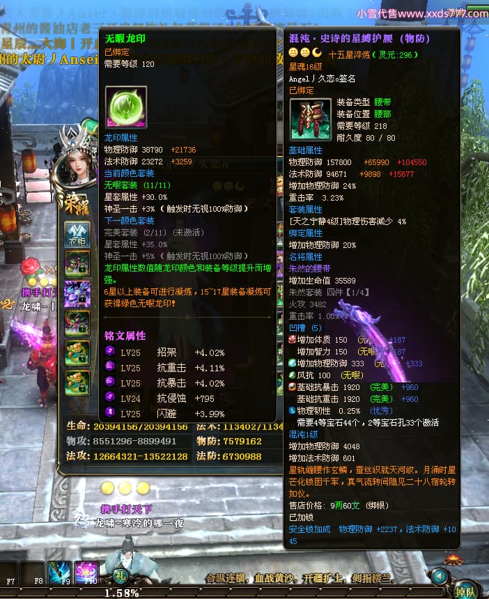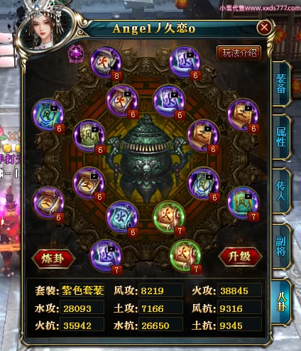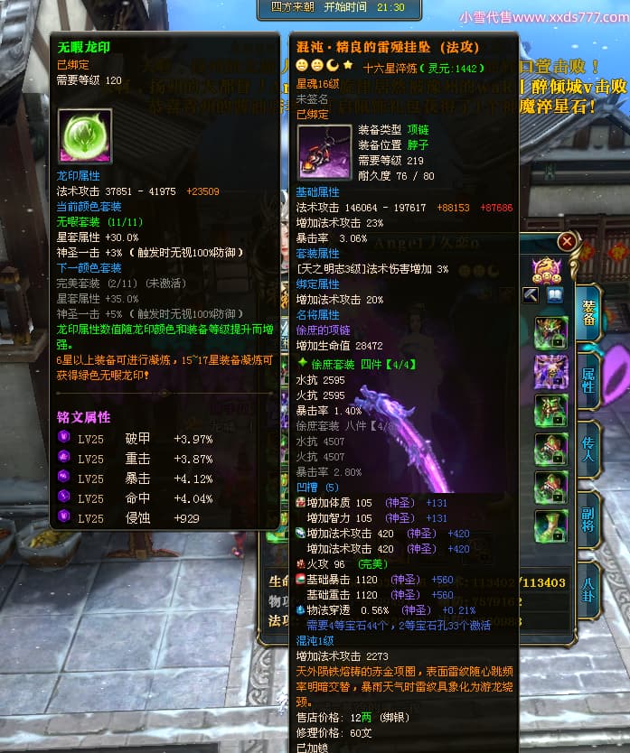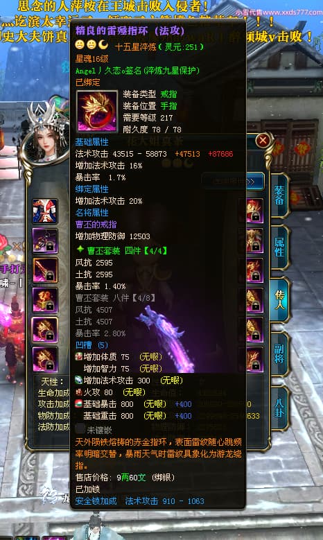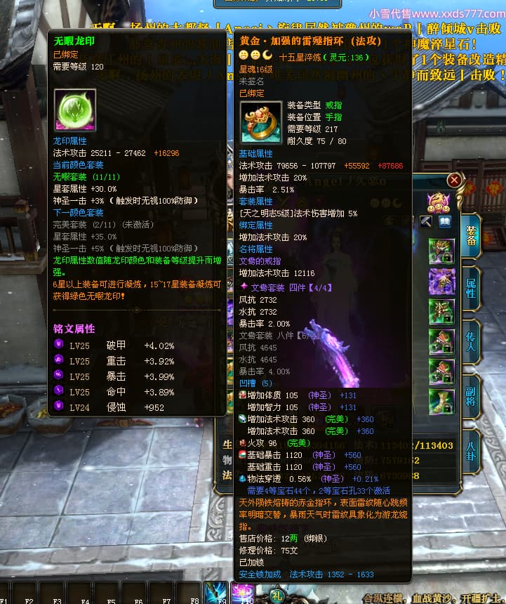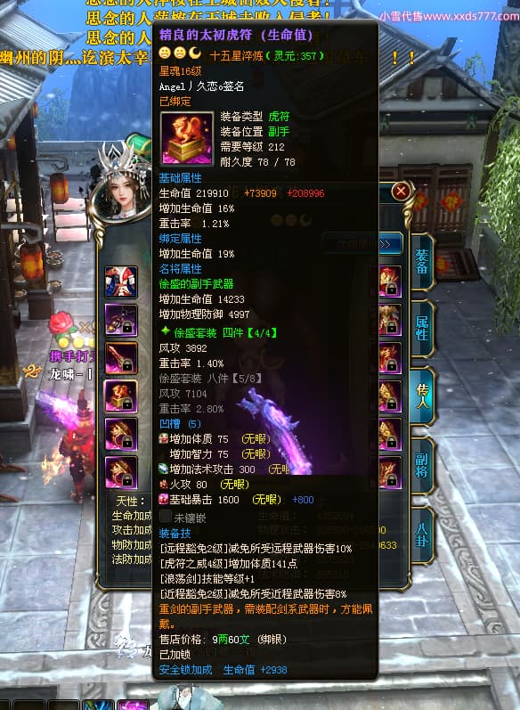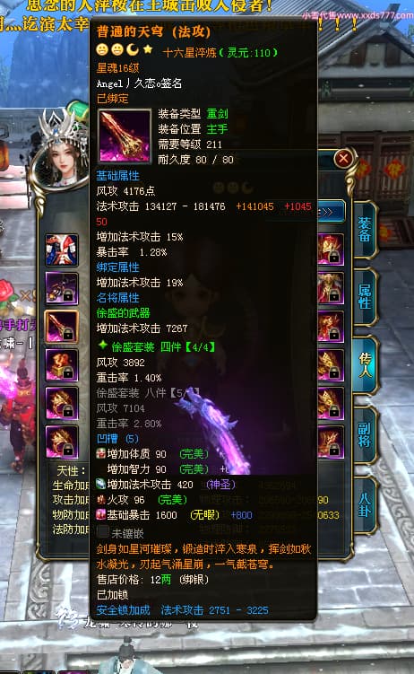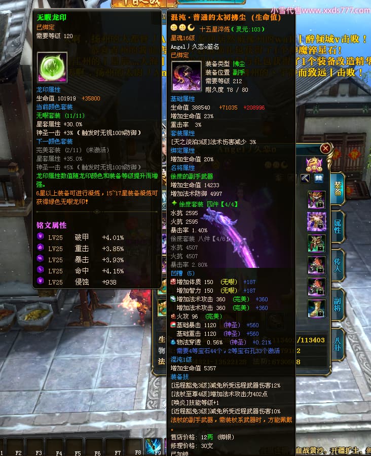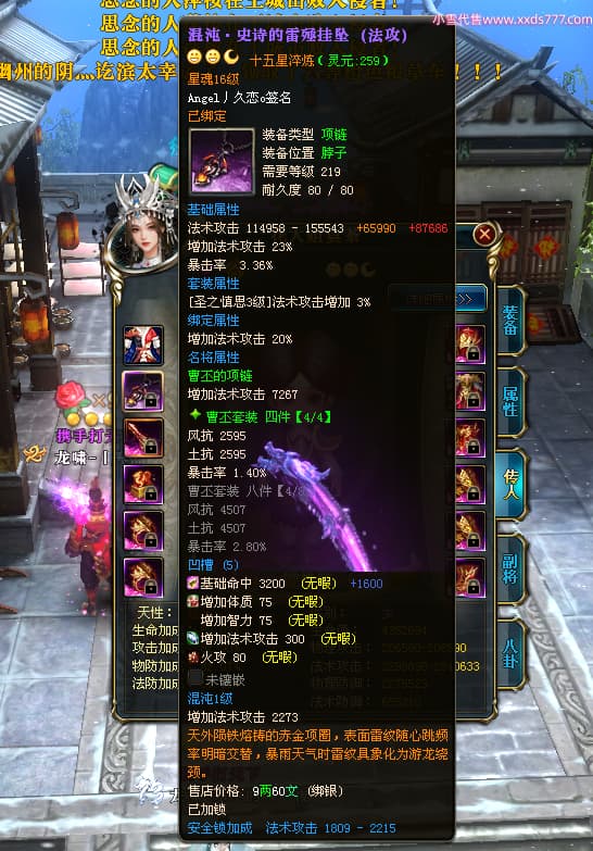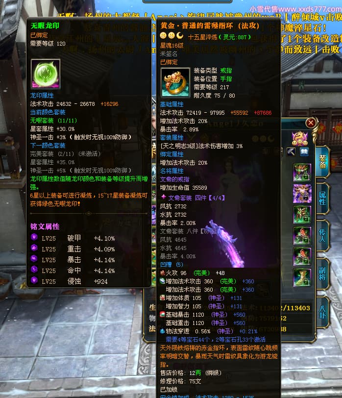 编号X24651 Angel丿久恋o 龙啸风云 益州 本国排名42名 19311W战力 人物黄金极品紫15X(2件18X6件混沌) 传人精良紫15X 副将精良紫12X 马史诗紫12X 精良紫15披风 人物星魂16级 传人星魂14级 副将星魂6级 马星魂16级 人物铭刻1件17级3件16级其余15级 点亮6件16星其余14星 马铭刻12级 点亮12星 人物绿龙印(2件紫龙印) 马黄龙印 五六等单双属性神圣完美无暇石头 蓝孔