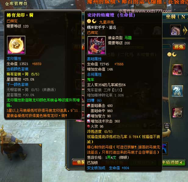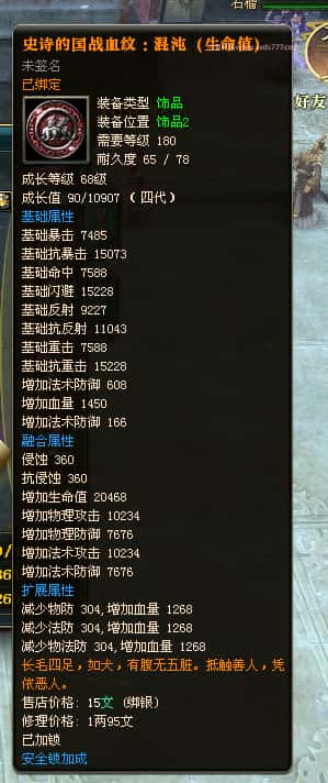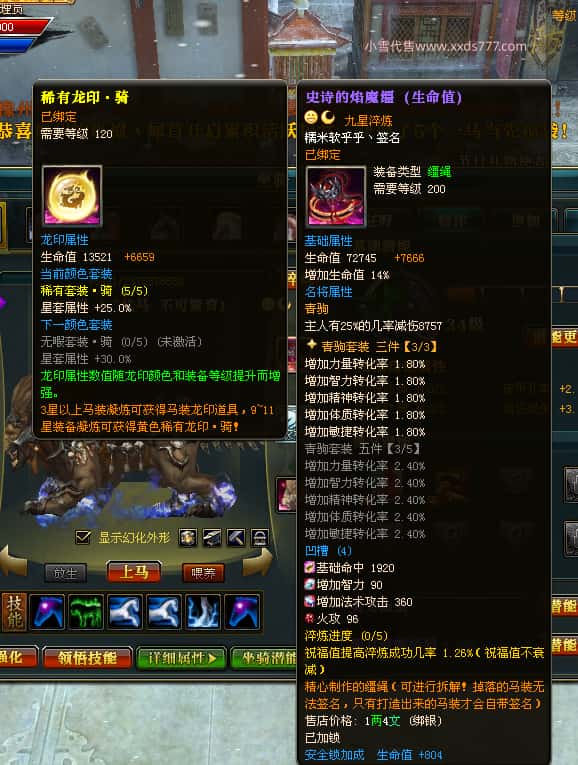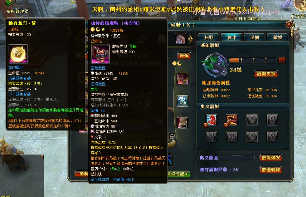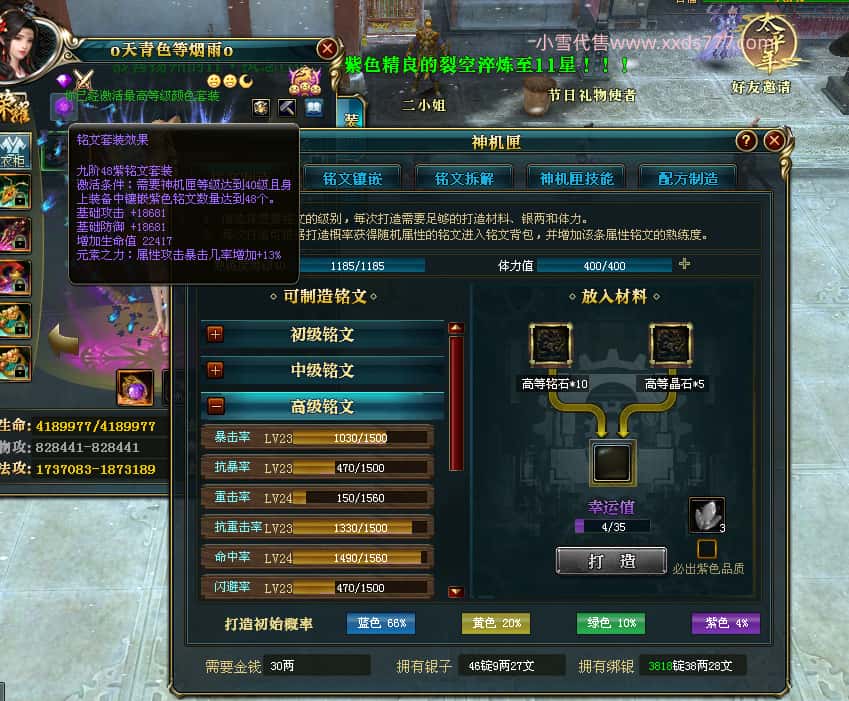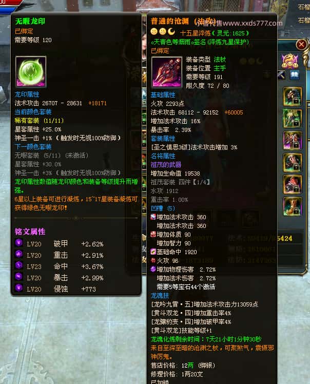 编号L24661 o天青色等烟雨o 龙战王者 扬州 本国排名32名 4003W战力 人物普通紫15X(4件混沌) 马史诗紫9X 人物黄龙印(5件绿龙印) 马黄龙印 六等单双属性石头
