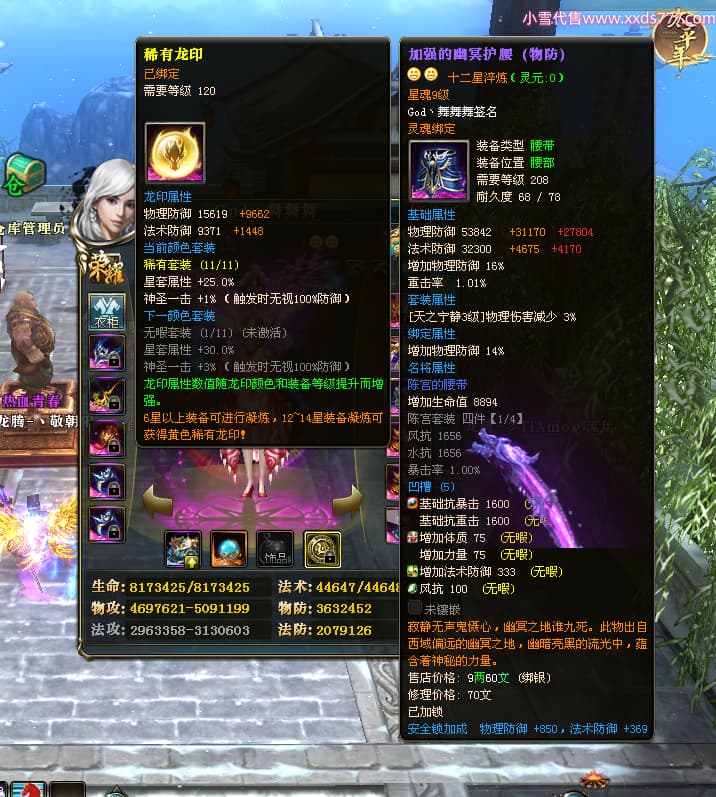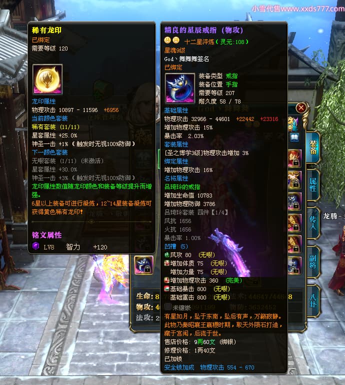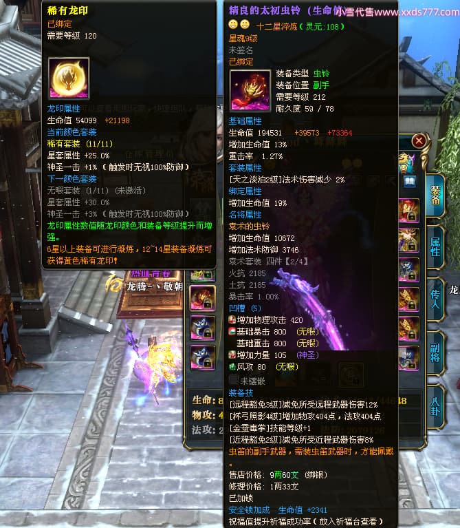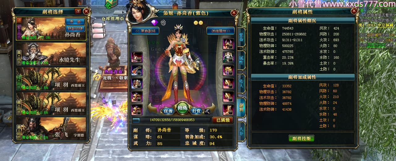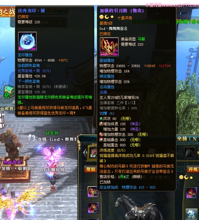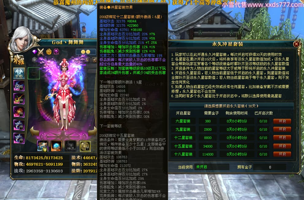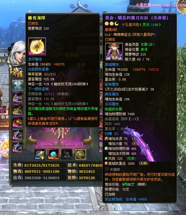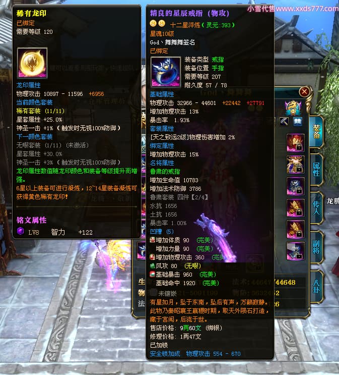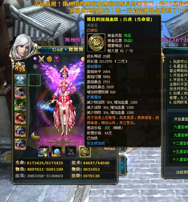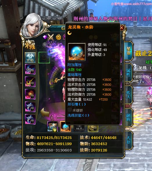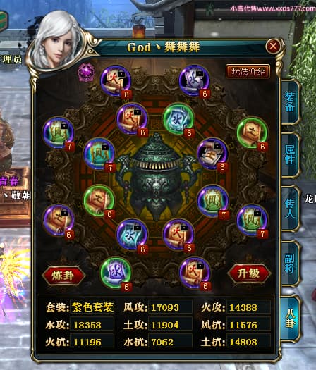 编号T24673 God丶舞舞舞 龙腾问鼎 荆州 5332W战力 人物加强紫12X(2件15X) 传人普通紫12X 副将加强紫12X 马加强紫10X 加强紫13披风 人物星魂8级 马星魂4级 人物铭刻4件13级其余12级 点亮12星 马铭刻1件12级其余10级 点亮10星 人物黄龙印(1件绿龙印) 马蓝龙印 五等单双属性完美无暇神圣石头