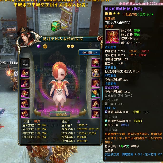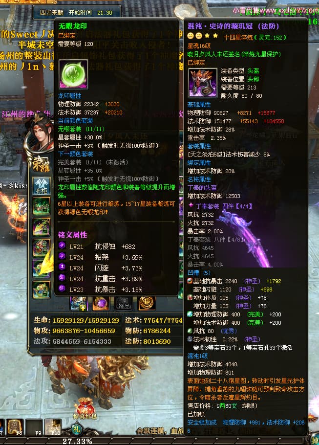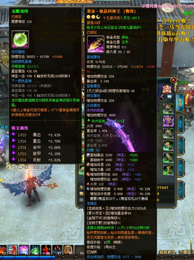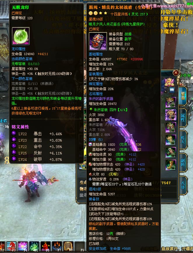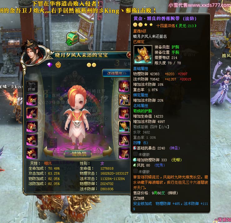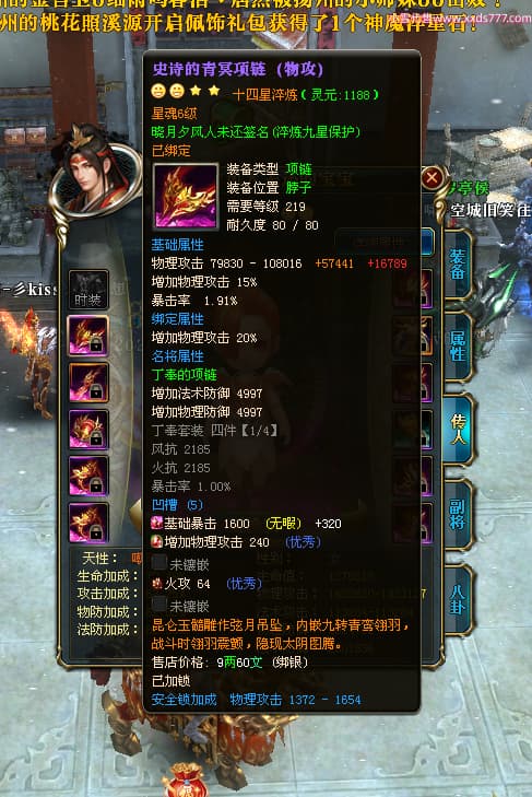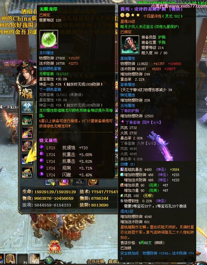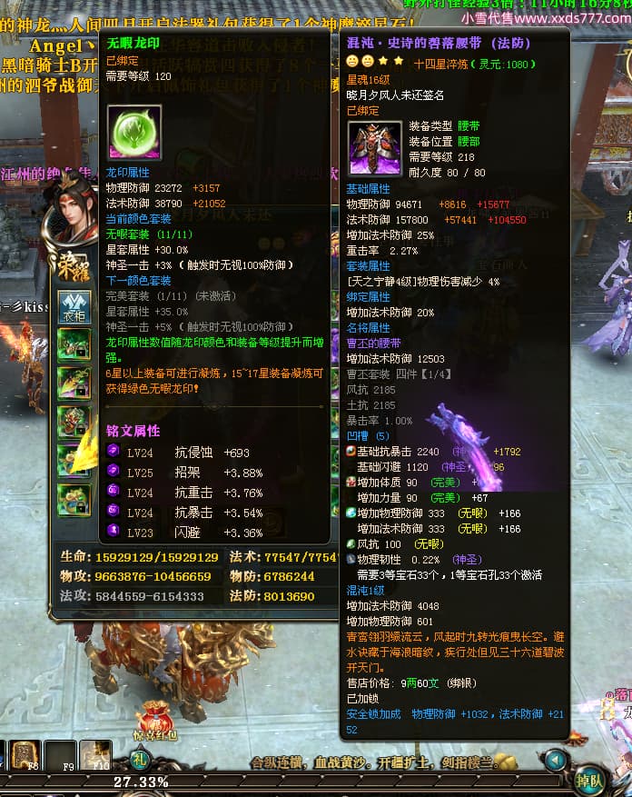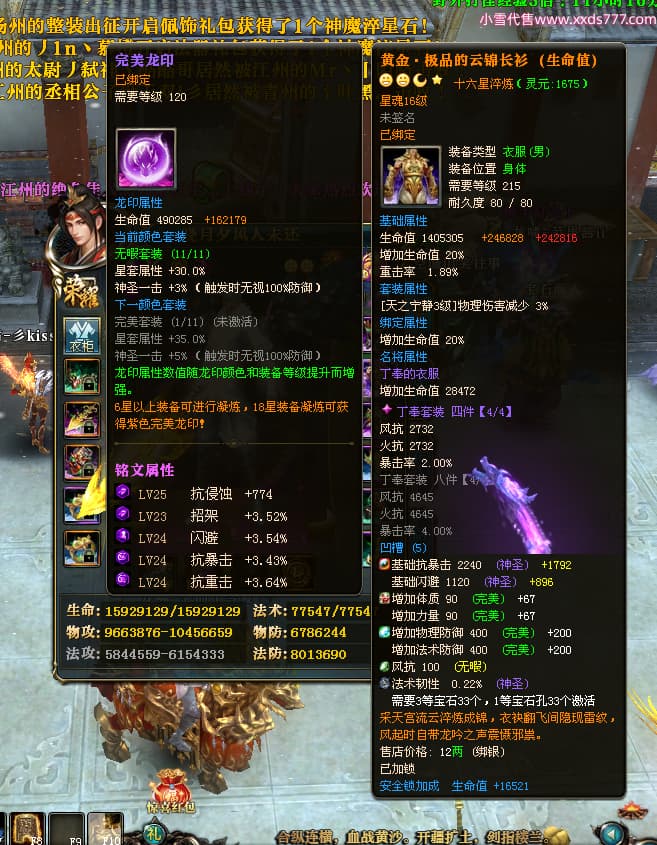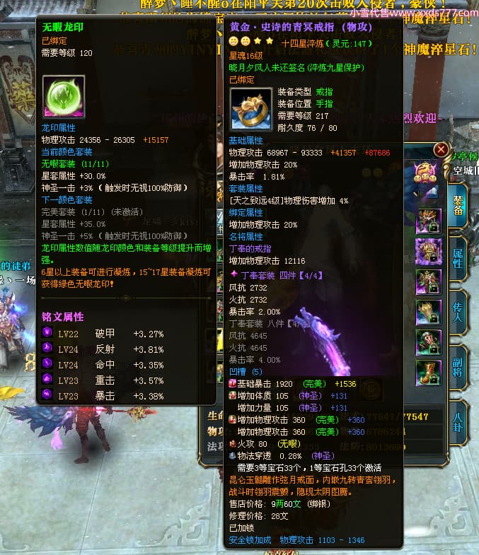 编号X24678 晓月夕风人未还 龙啸风云 益州 本国排名81名 15382W战力 人物黄金史诗紫14X(2件15X5件混沌) 传人精良紫12X 副将精良紫12X 马普通橙10X 精良紫14披风 人物星魂16级 传人星魂6级 副将星魂6级 马星魂11级 人物铭刻15级 点亮1件16星7件14星1件12星 马铭刻15级 点亮10星 人物绿龙印(1件紫龙印) 马蓝龙印 五等单双属性神圣完美无暇石头 黄蓝白孔