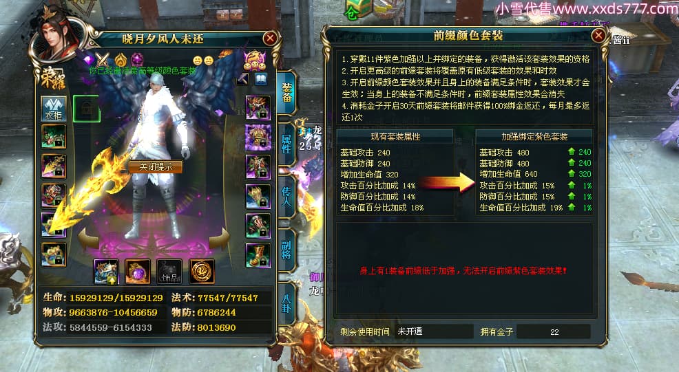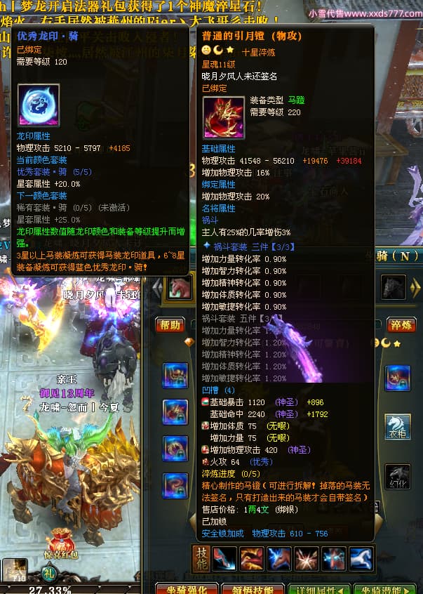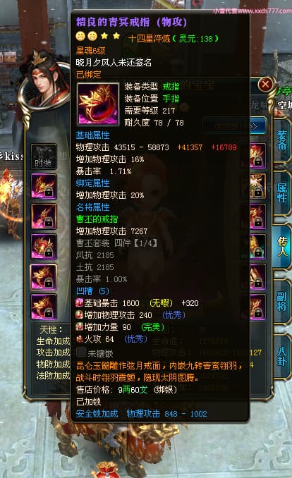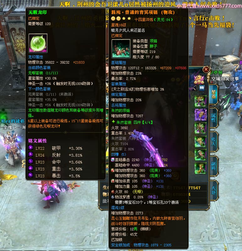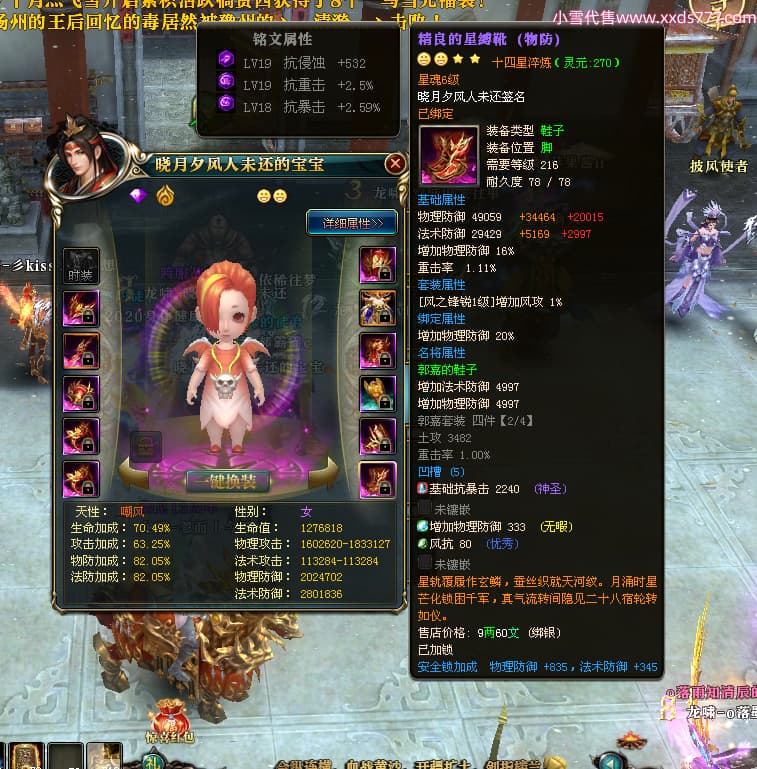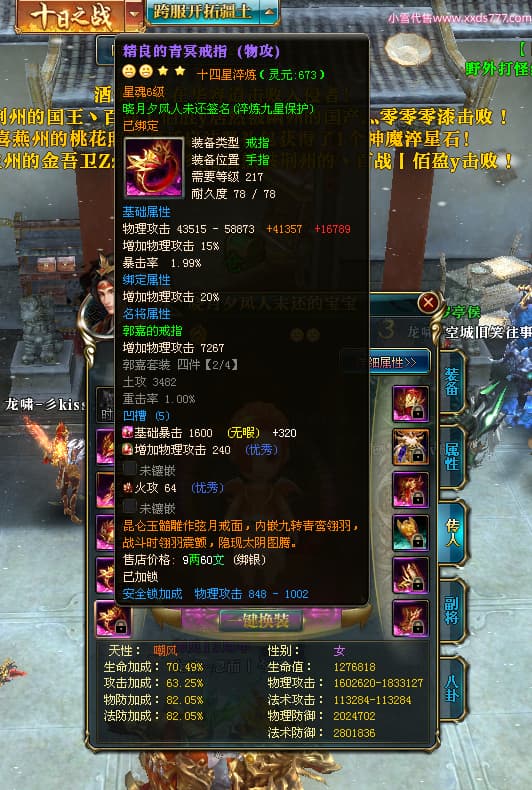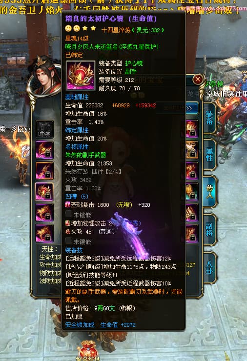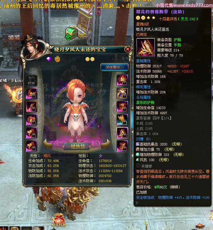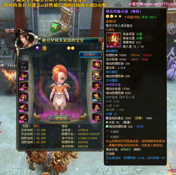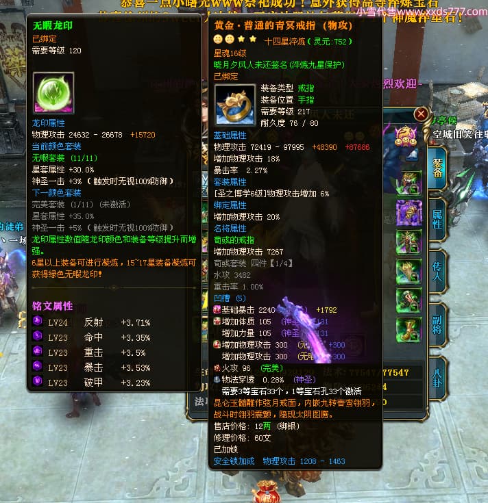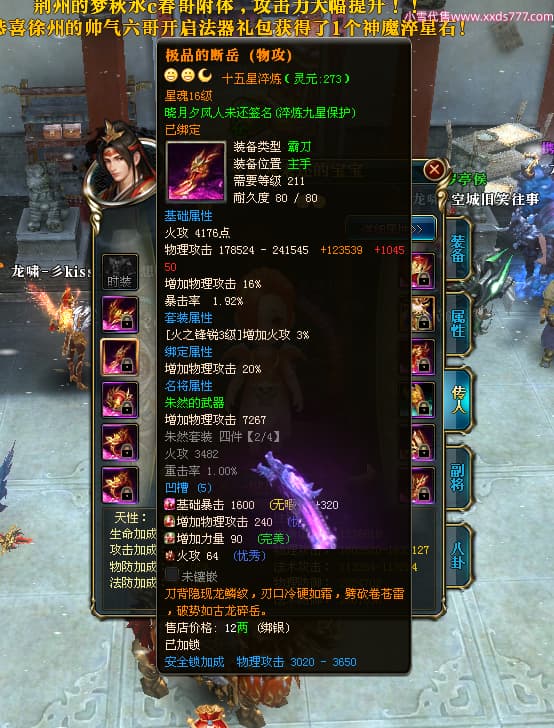 编号X24678 晓月夕风人未还 龙啸风云 益州 本国排名81名 15382W战力 人物黄金史诗紫14X(2件15X5件混沌) 传人精良紫12X 副将精良紫12X 马普通橙10X 精良紫14披风 人物星魂16级 传人星魂6级 副将星魂6级 马星魂11级 人物铭刻15级 点亮1件16星7件14星1件12星 马铭刻15级 点亮10星 人物绿龙印(1件紫龙印) 马蓝龙印 五等单双属性神圣完美无暇石头 黄蓝白孔