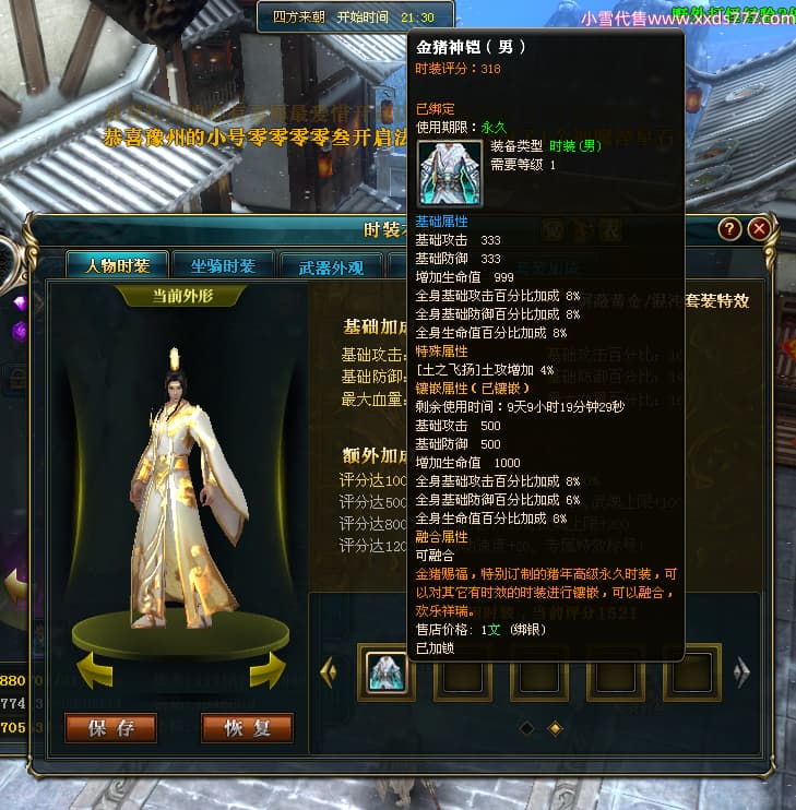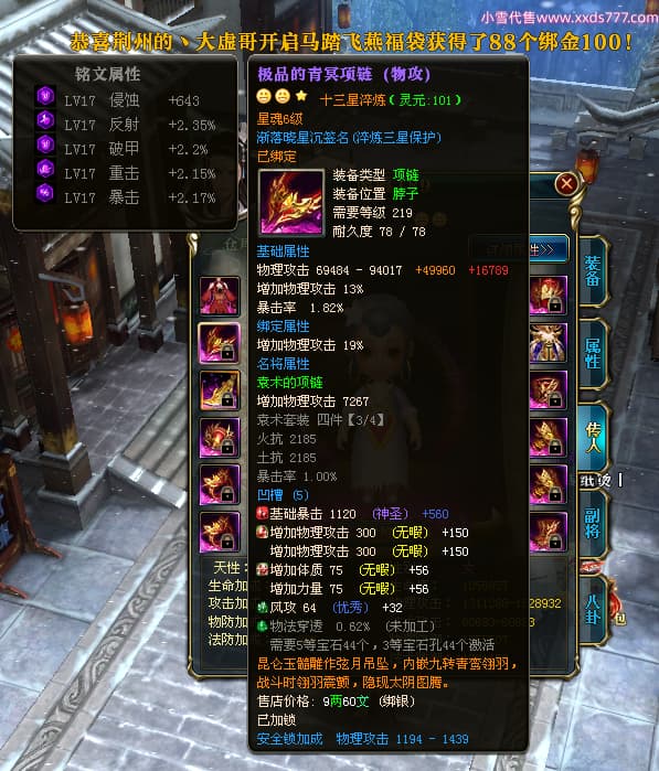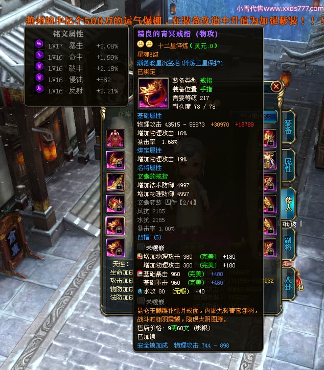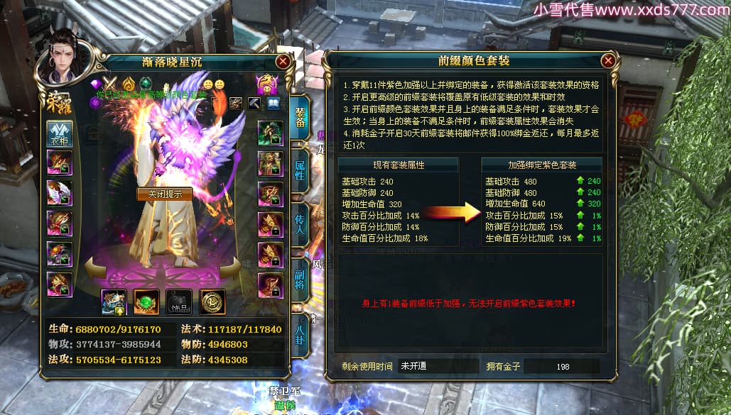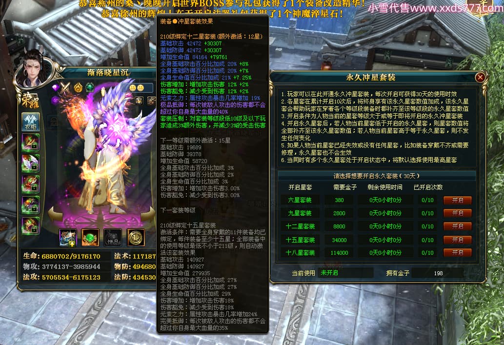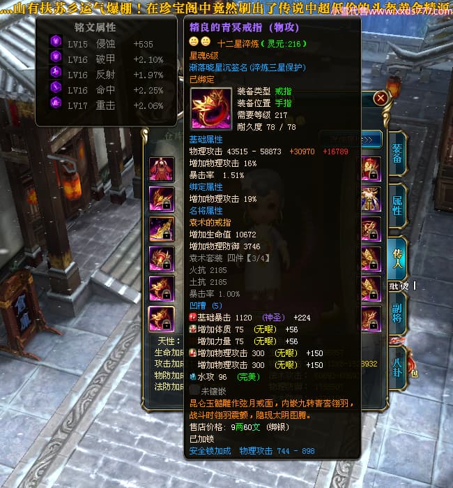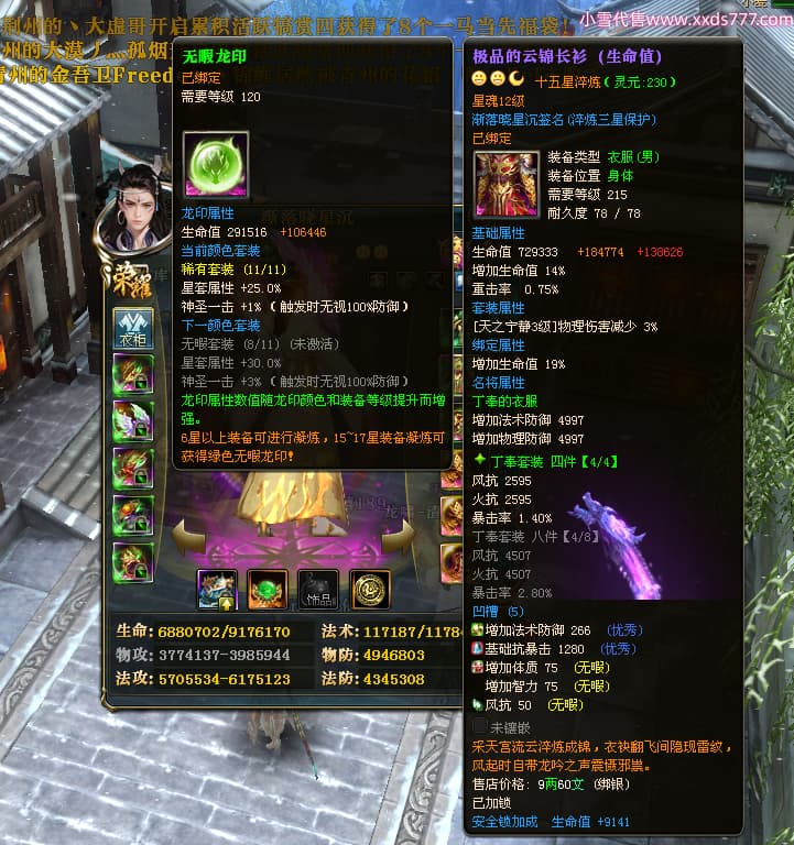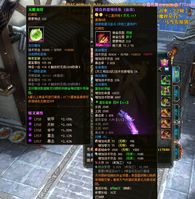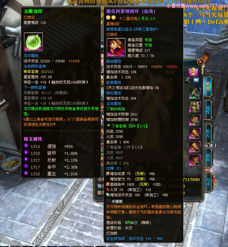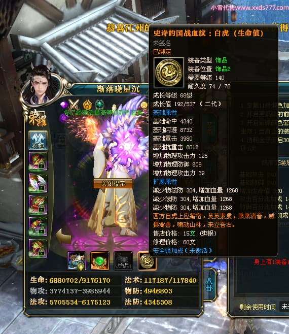 编号X24683 渐落晓星沉 龙啸风云 豫州 7413W战力 人物精良紫12X(4件15X) 传人精良紫12X 副将加强紫12X 马极品紫9X 普通紫12X披风 人物星魂8级 传人5级 马5级 人物铭刻1件15级1件14级其余12级 点亮2件14星其余12星 马铭12级 点亮10星 人物黄龙印(8件绿龙印) 马蓝龙印 五等单双属性神圣完美无暇石头 蓝白孔