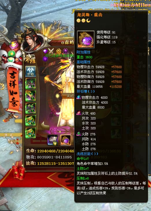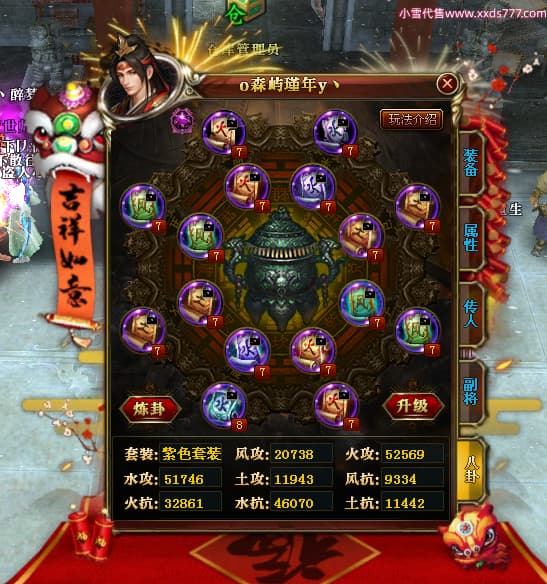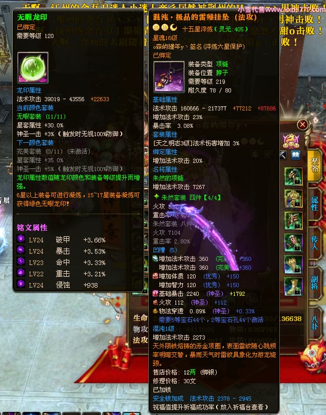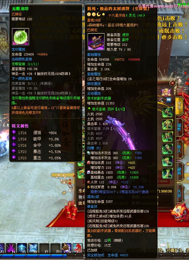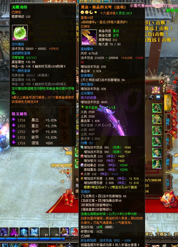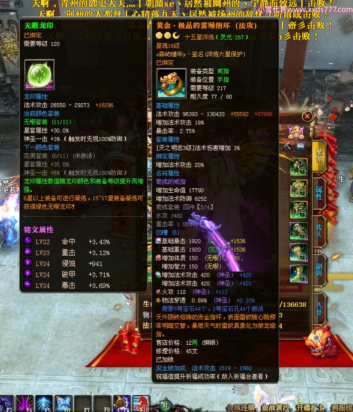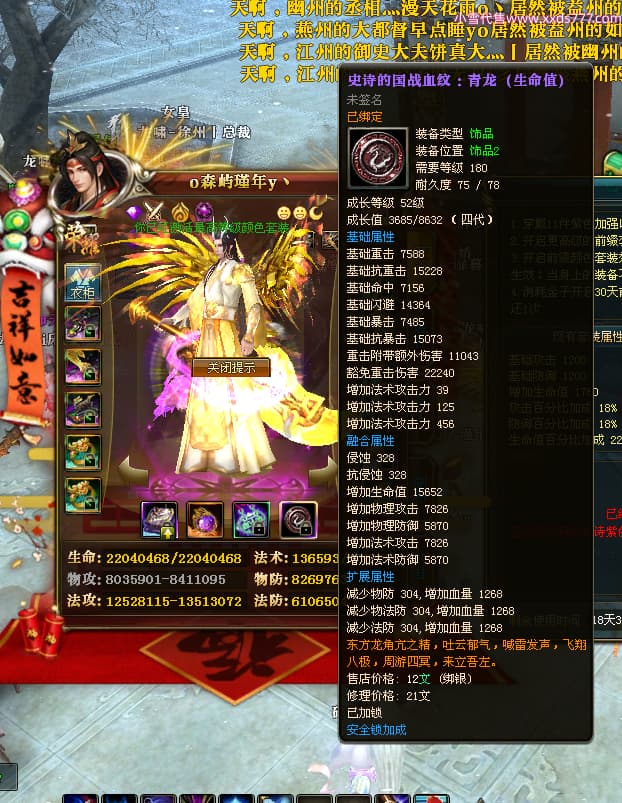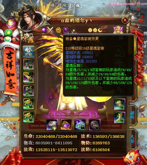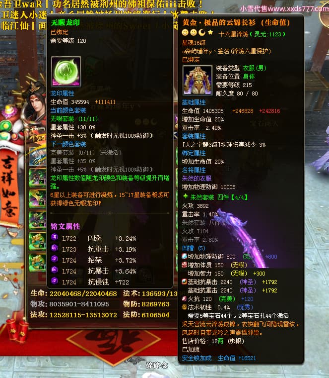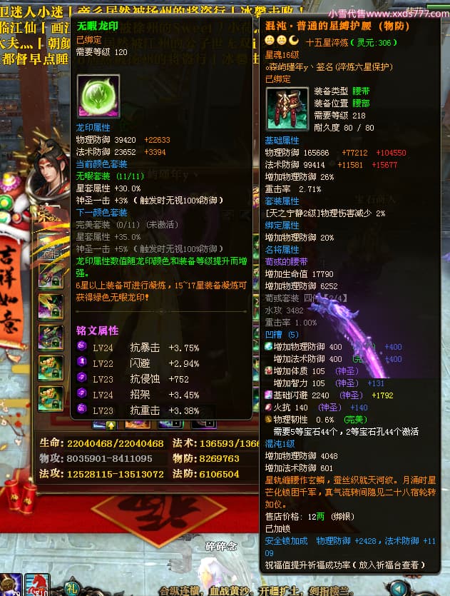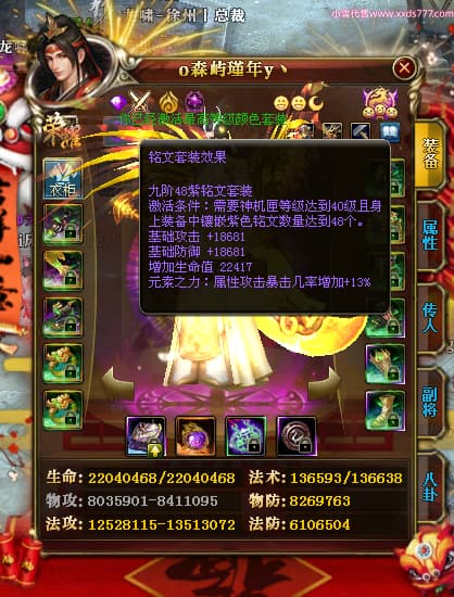 编号X24689 o森屿瑾年y丶 龙啸风云 徐州 本国排名22名 19500W战力 人物黄金史诗紫15X(5件混沌) 传人精良紫15X 副将精良紫12X 马史诗紫12X 极品紫15披风 人物星魂16级 传人星魂12级 副将星魂6级 马星魂12级 人物铭刻1件16级其余15级 人物点亮7件16星其余14星 马铭刻13级 点亮12星 人物绿龙印 马黄龙印 五六等单双属性神圣完美优秀石头 黄蓝孔