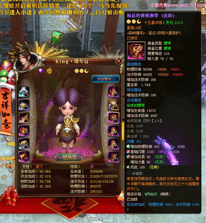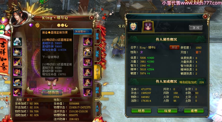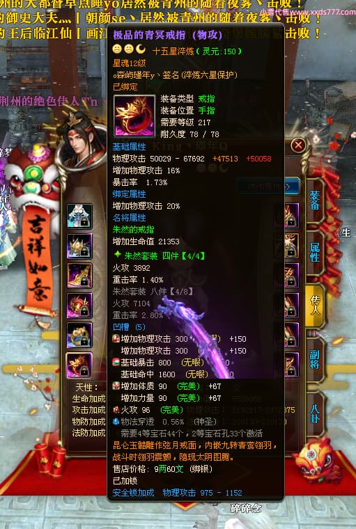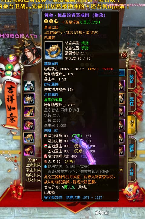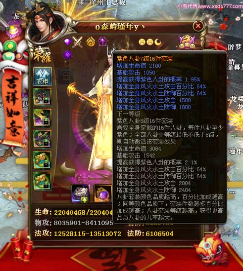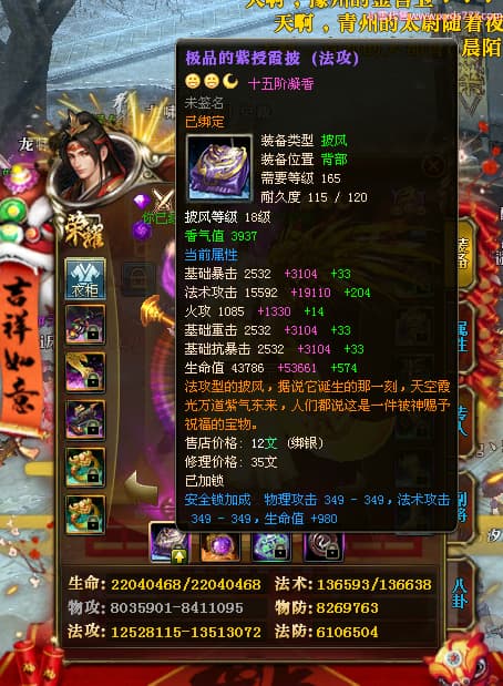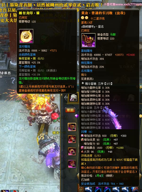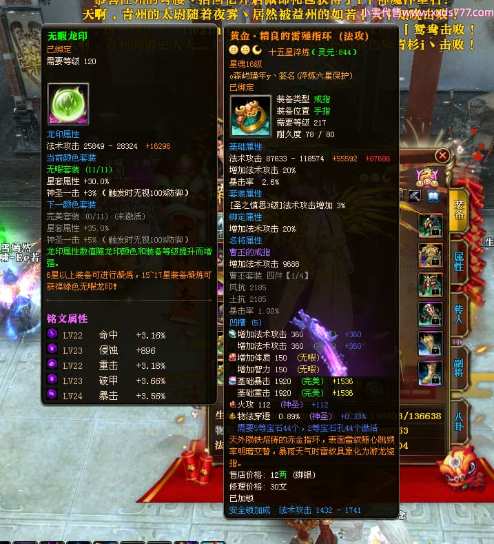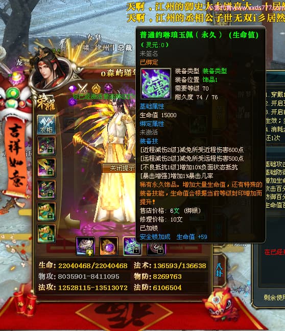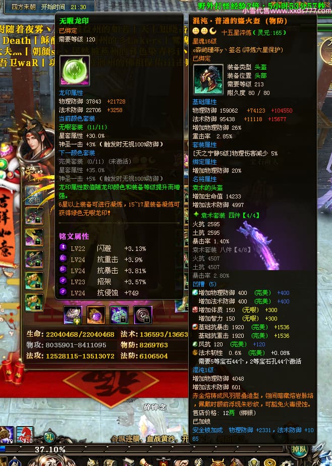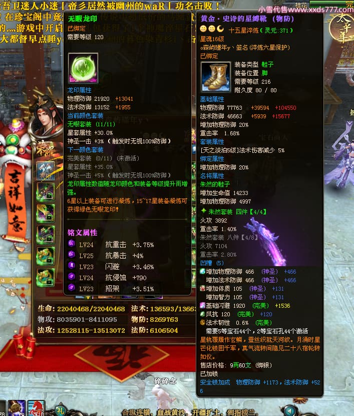编号X24689 o森屿瑾年y丶 龙啸风云 徐州 本国排名22名 19500W战力 人物黄金史诗紫15X(5件混沌) 传人精良紫15X 副将精良紫12X 马史诗紫12X 极品紫15披风 人物星魂16级 传人星魂12级 副将星魂6级 马星魂12级 人物铭刻1件16级其余15级 人物点亮7件16星其余14星 马铭刻13级 点亮12星 人物绿龙印 马黄龙印 五六等单双属性神圣完美优秀石头 黄蓝孔