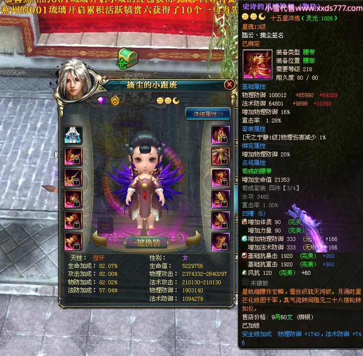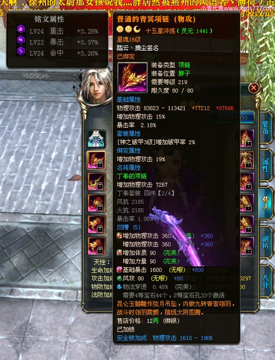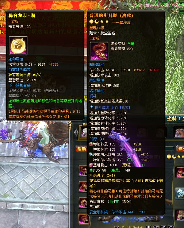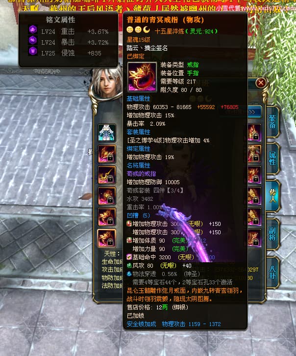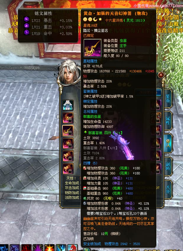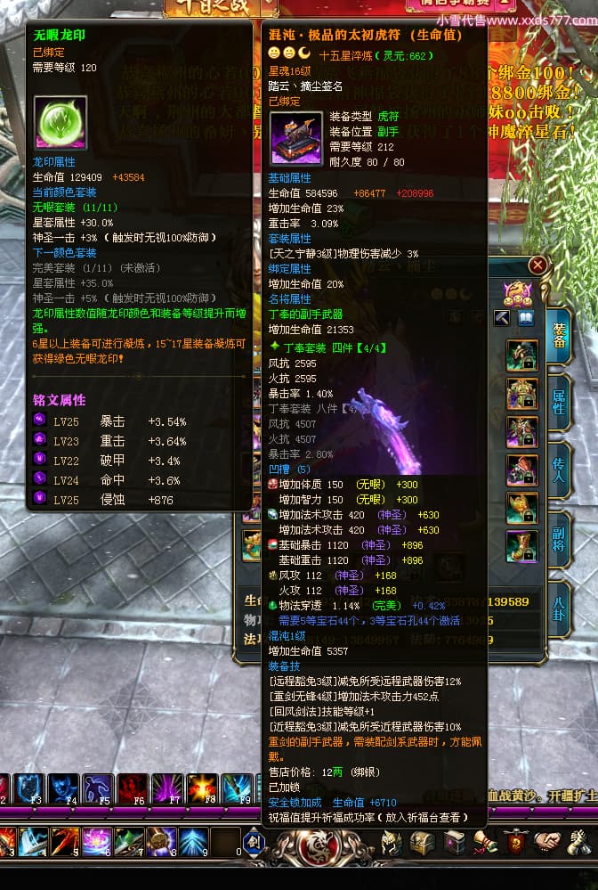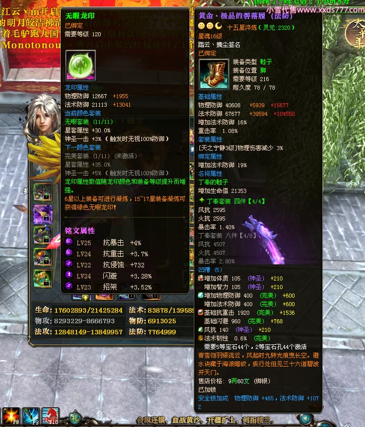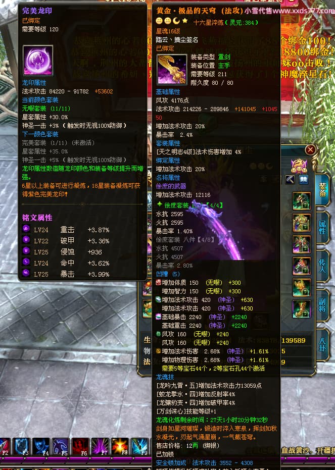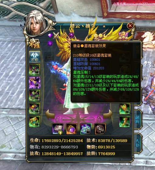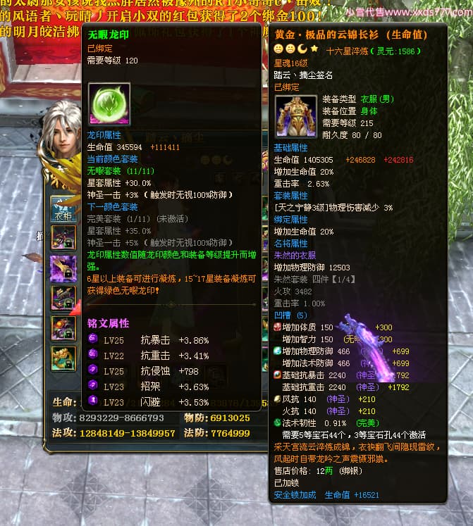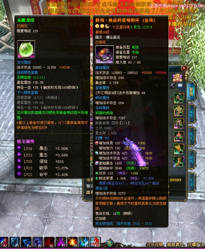 编号T24702 踏云丶摘尘 龙腾问鼎 荆州 本国排名41名 19567W战力 人物黄金通加强15X(6件混沌) 传人精良紫15X 副将极品紫12X 马普通橙11X 精良紫15披风 人物星魂16级 传人星魂13级 副将星魂6级 马星魂14级 人物铭刻1件17级其余15级 点亮16星 马铭刻15级 点亮12星 人物绿龙印(1件紫龙印) 马黄龙印 五六等单双属性完美无暇神圣石头 黄孔