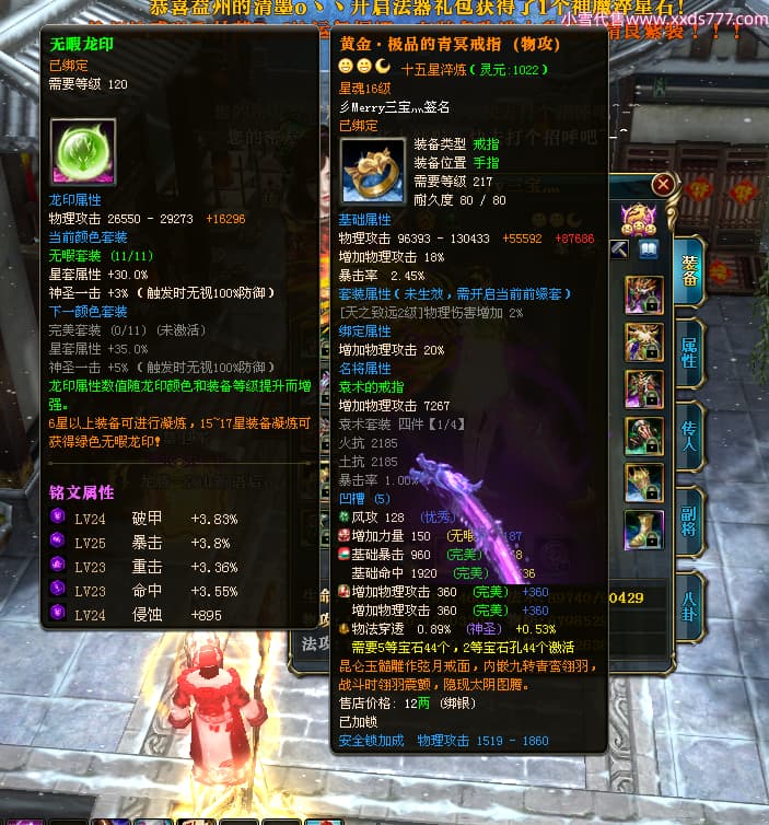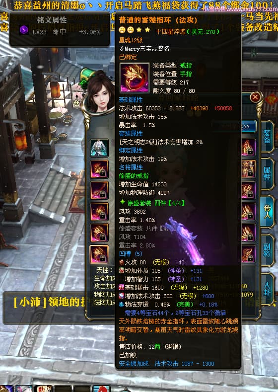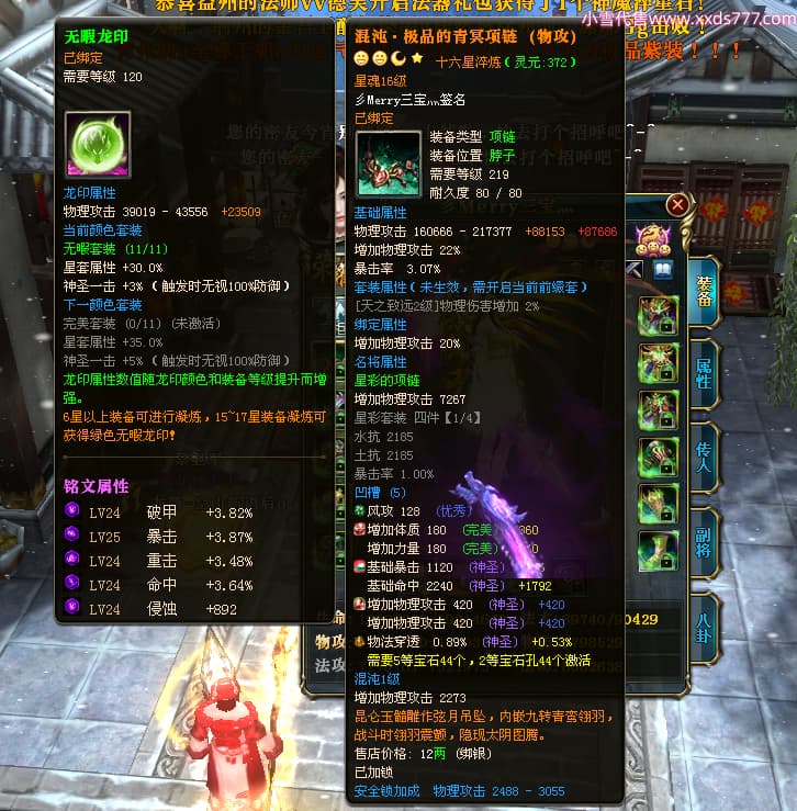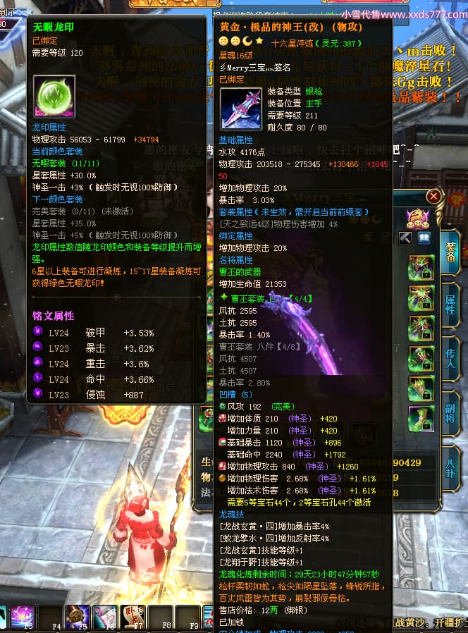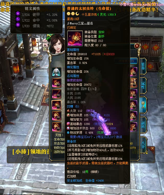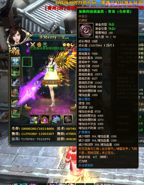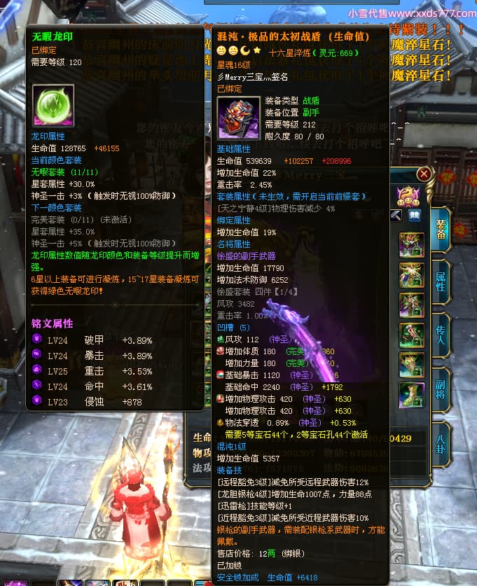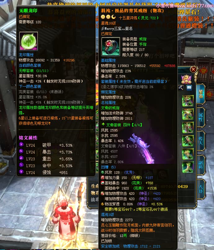 编号T24713 彡Merry三宝灬 龙腾问鼎 燕州 本国排名34名 17312W战力 人物黄金极品橙15X(6件混沌) 传人史诗紫12X 副将加强橙12X 马普通橙10X 精良紫14披风 人物星魂16级 传人星魂11级 副将星魂6级 马星魂14级 人物铭刻15级 人物点亮7件16星其余14星 马铭刻12级 点亮10星 人绿龙印 马黄龙印 六等单双属性神圣完美无瑕石头 黄蓝孔 可以转移百分百安全