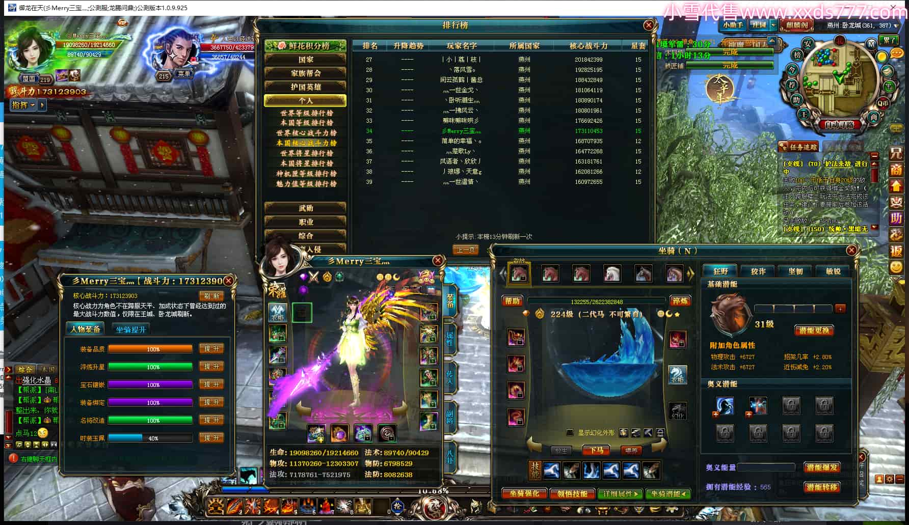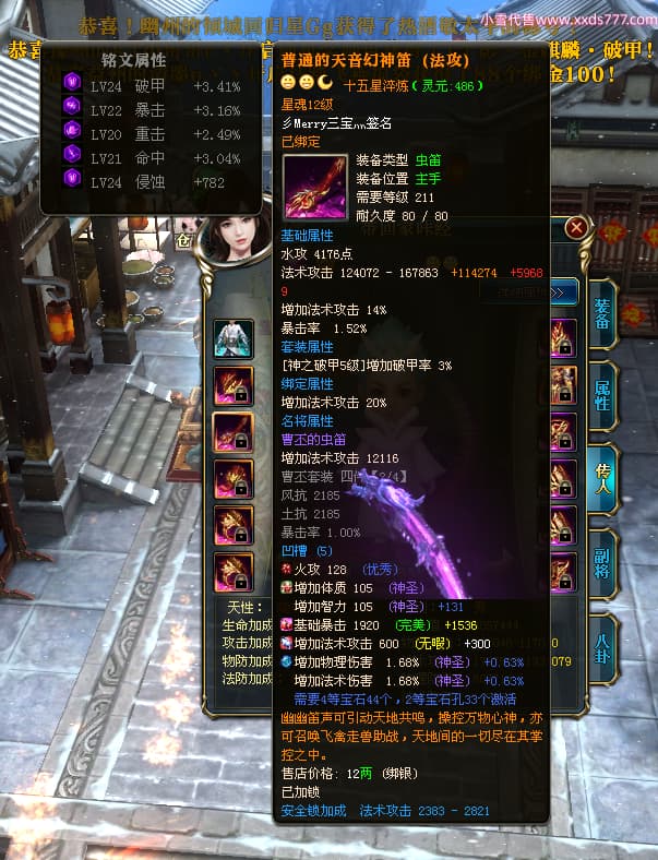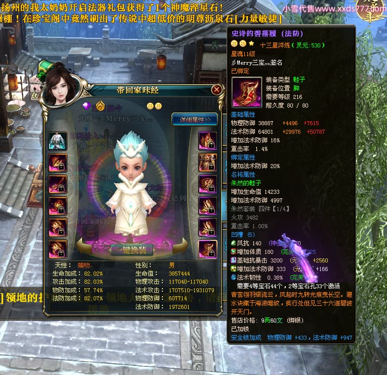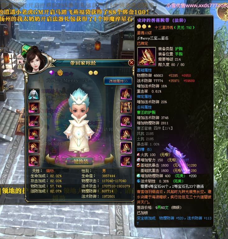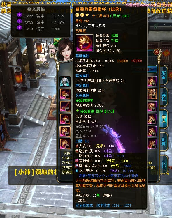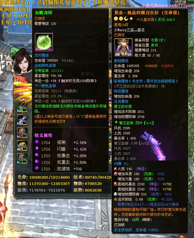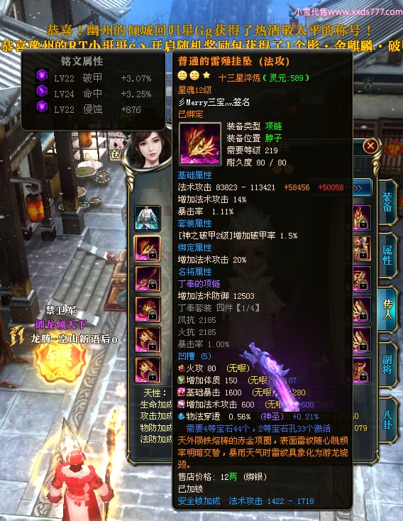 编号T24713 彡Merry三宝灬 龙腾问鼎 燕州 本国排名34名 17312W战力 人物黄金极品橙15X(6件混沌) 传人史诗紫12X 副将加强橙12X 马普通橙10X 精良紫14披风 人物星魂16级 传人星魂11级 副将星魂6级 马星魂14级 人物铭刻15级 人物点亮7件16星其余14星 马铭刻12级 点亮10星 人绿龙印 马黄龙印 六等单双属性神圣完美无瑕石头 黄蓝孔 可以转移百分百安全