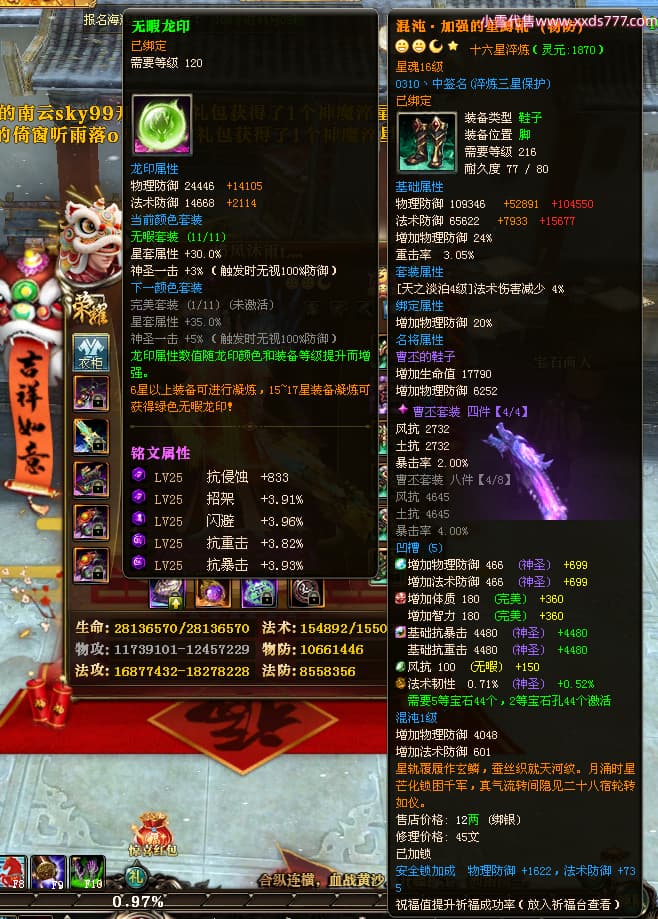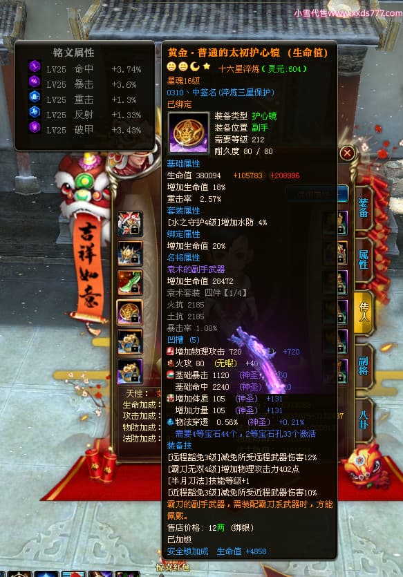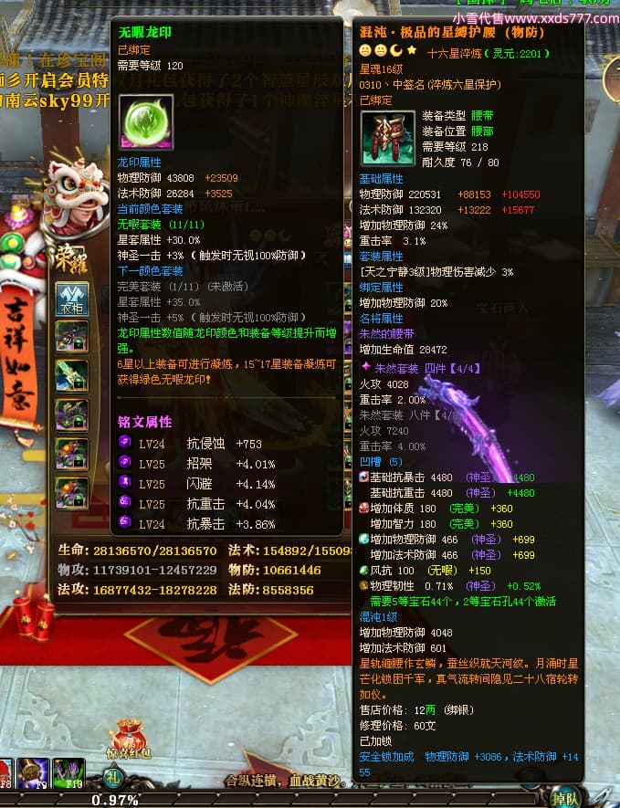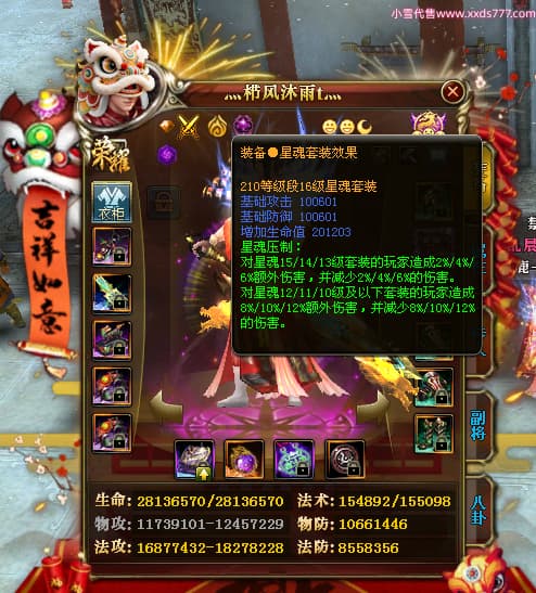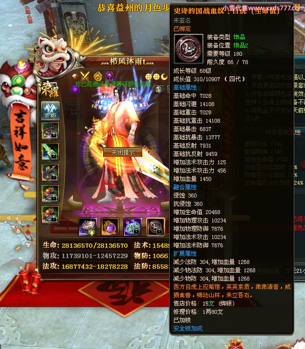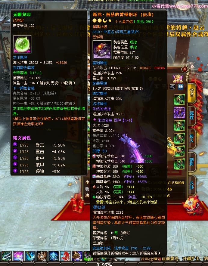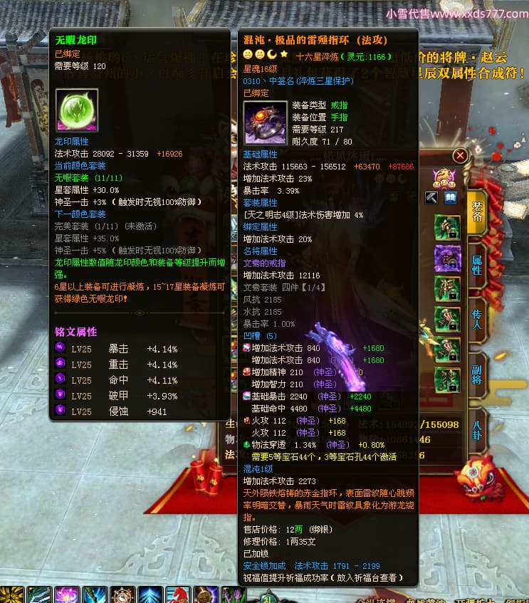 编号Z24718 灬栉风沐雨t灬 逐鹿天下 徐州 世界排名34名 29006W战力 人物黄金极品橙16X(4件18X10件混沌) 传人黄金史诗紫15X 副将精良紫12X 马黄金精良橙13X 极品紫16披风 人物星魂16级 传人星魂16级 副将星魂6级 马星魂16级 人物铭刻3件18级1件16级其余15级 人物点亮2件18星其余16星 马铭刻13级 点亮3件14星其余12星 人物绿龙印(1件紫龙印) 马黄龙印 六等单双属性神圣完美无暇石头 黄绿孔 已开4次永久15星套
