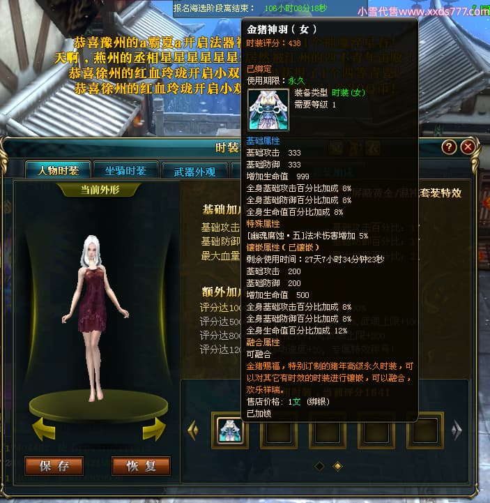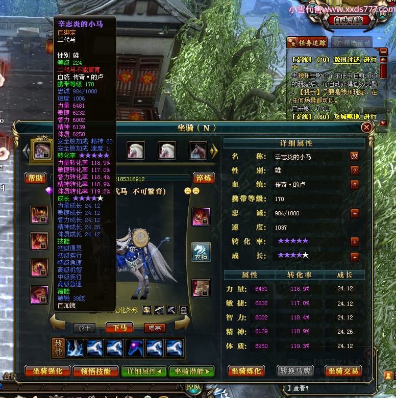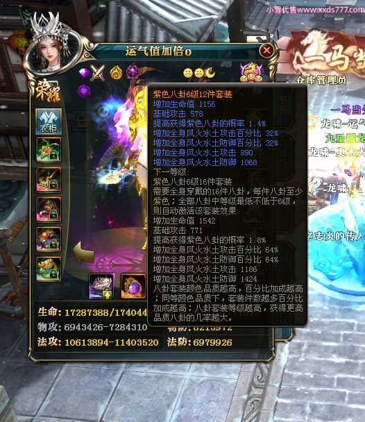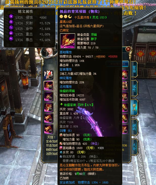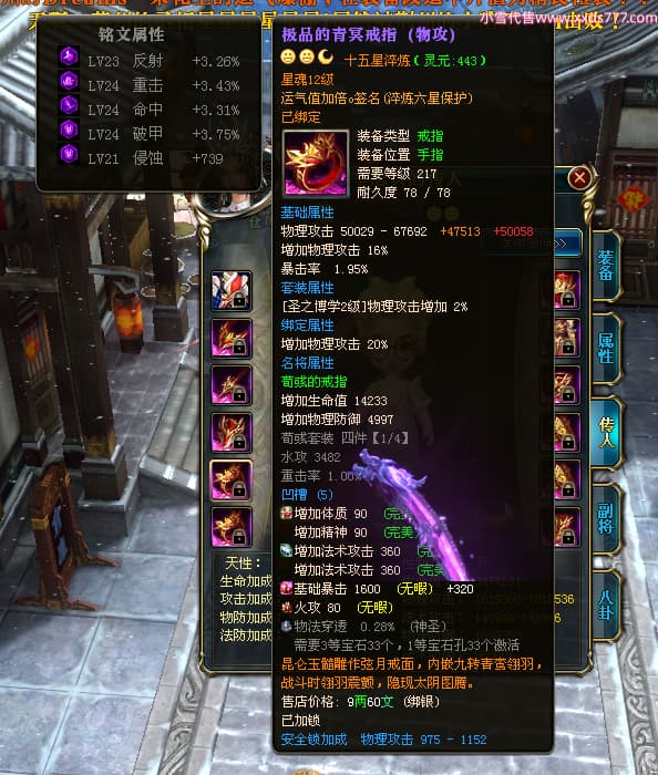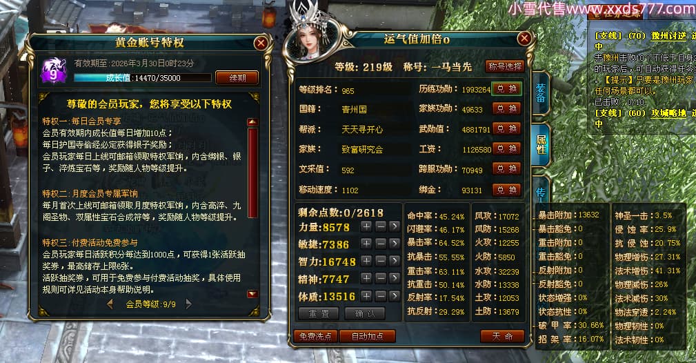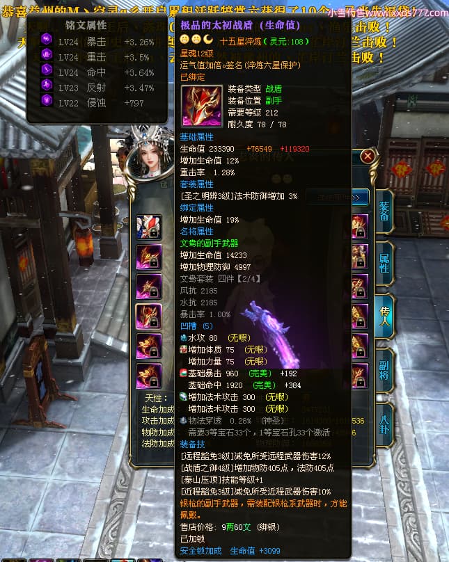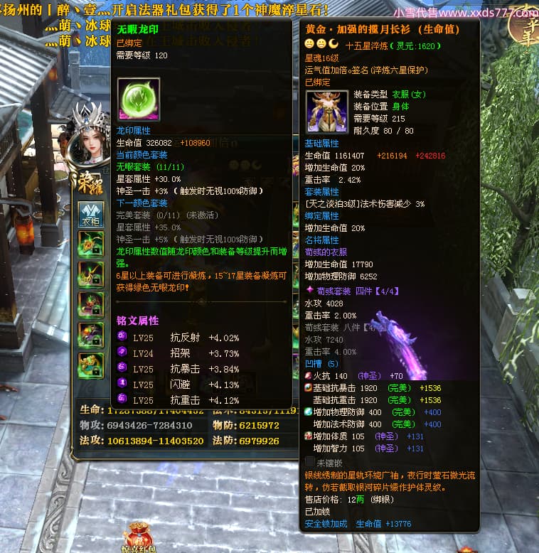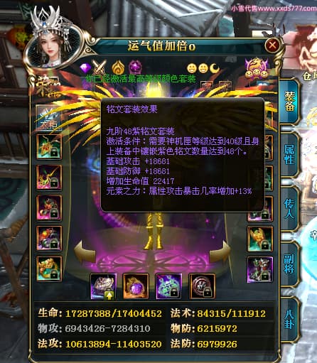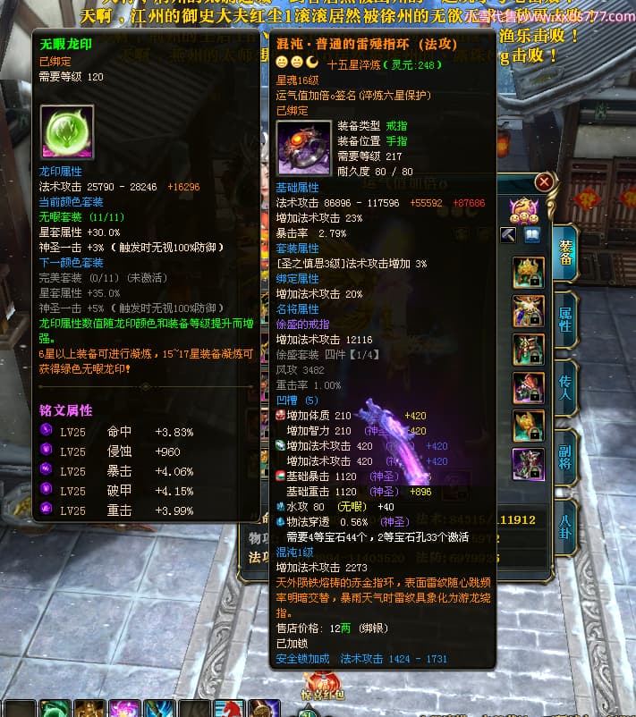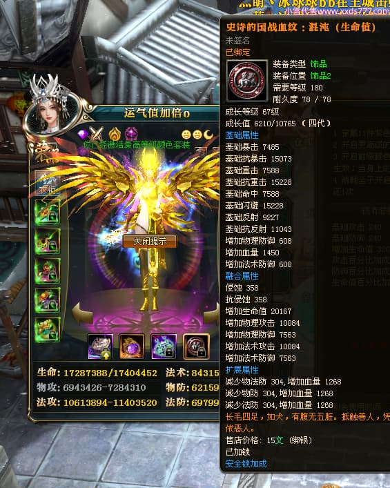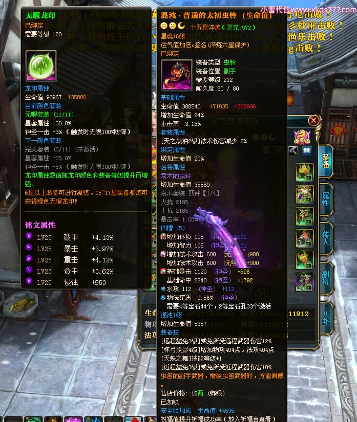 编号X24719 运气值加倍o 龙啸风云 青州 本国排名33名 16053W战力 人物黄金普通橙15X(5件混沌) 传人极品紫12X 副将极品紫12X 马史诗紫12X 精良紫14披风 人物星魂16级 传人星魂12级 副将星魂6级 马星魂12级 人物铭刻15级 点亮4件16星其余14星 马铭刻15级 点亮12星 人物绿龙印 马黄龙印 五六等单双属性神圣完美无暇石头 黄蓝孔 已开2次永久15星套