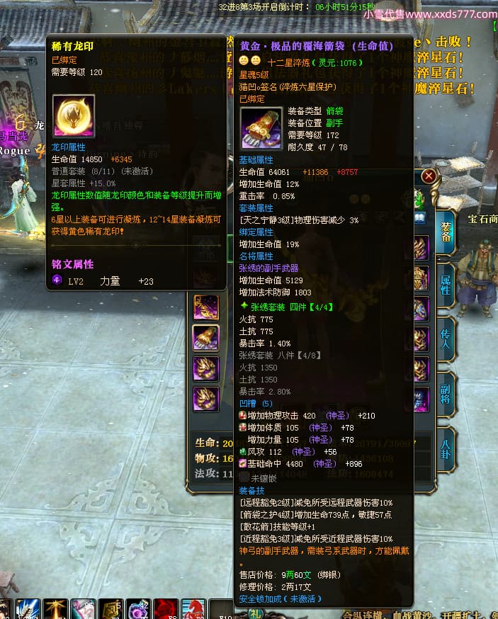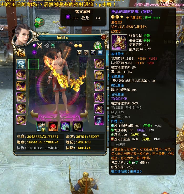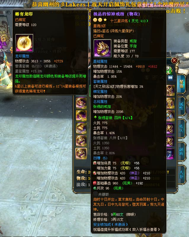 编号X24963 猫凹o 龙啸风云 扬州 1974W战力 人物极品紫12X(2件15X) 传人普通紫12X 副将加强紫12X 马极品紫9X 人物铭刻1件15级其余12级 点亮12星 五等单双属性神圣完美无暇石头 白孔