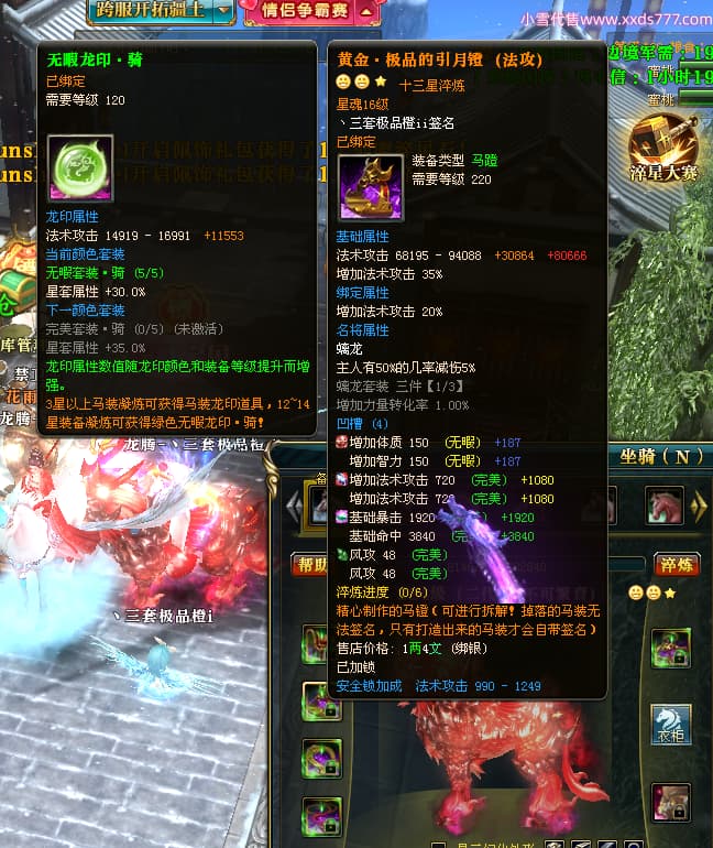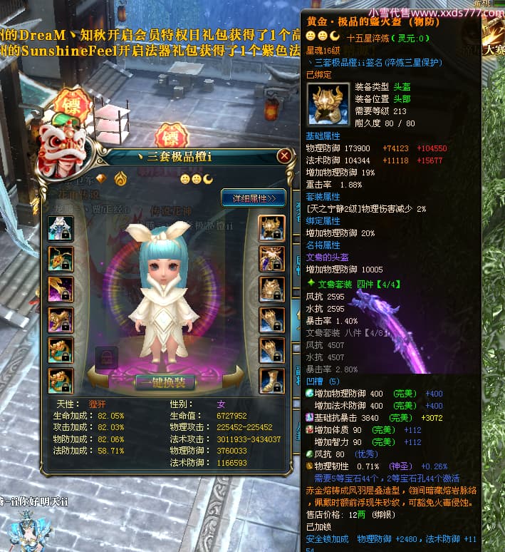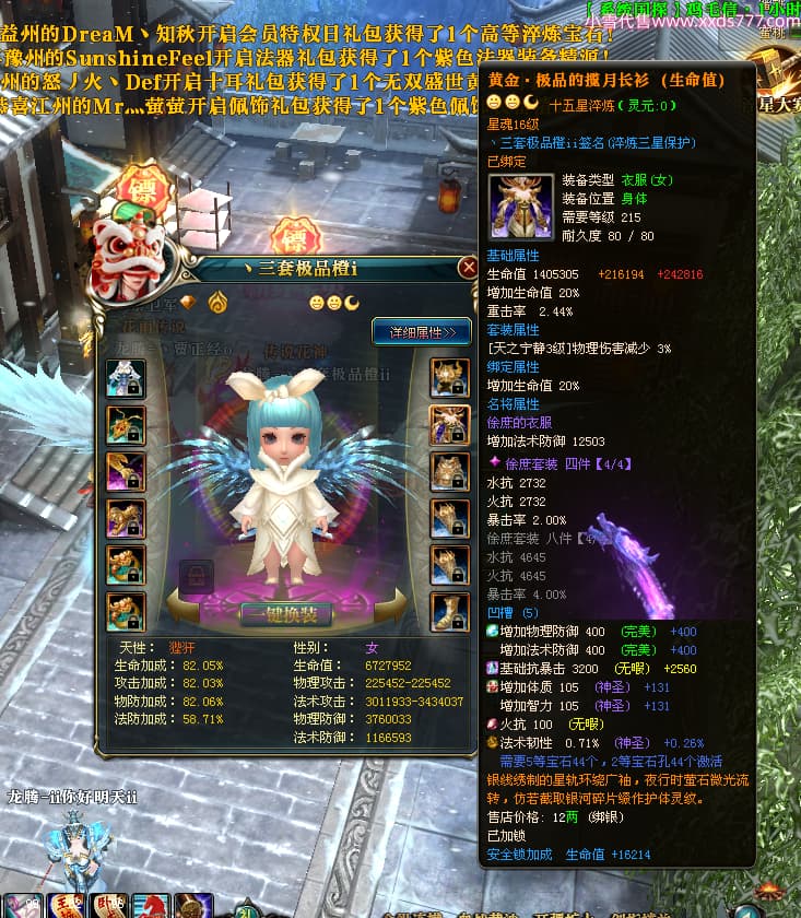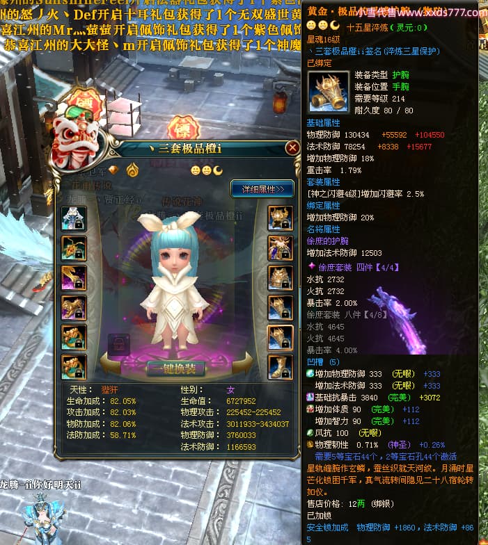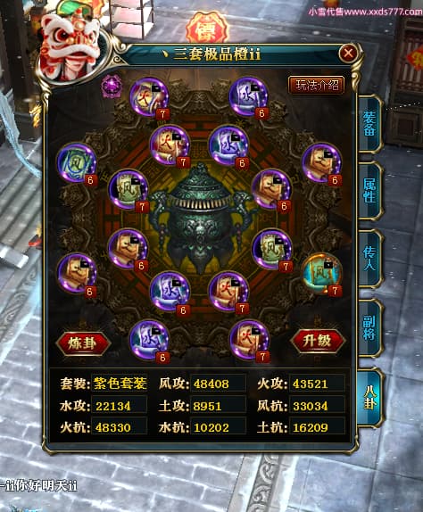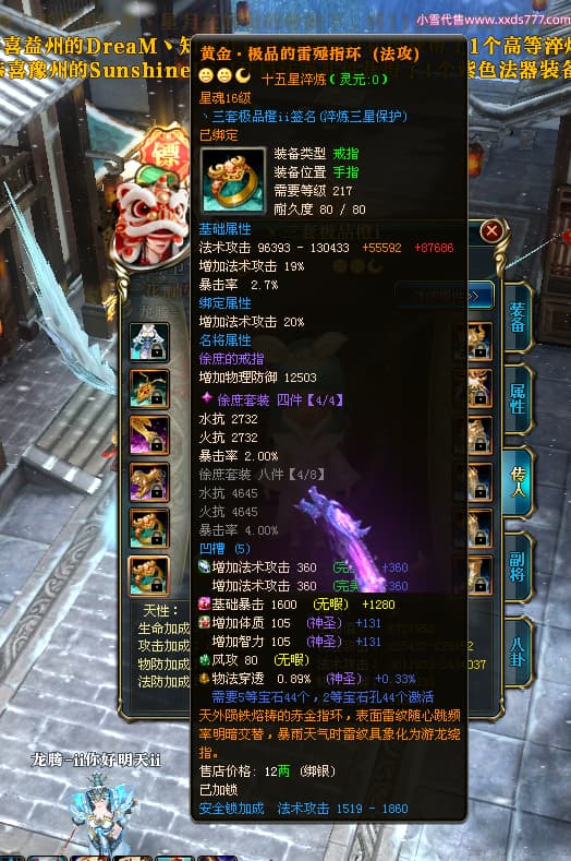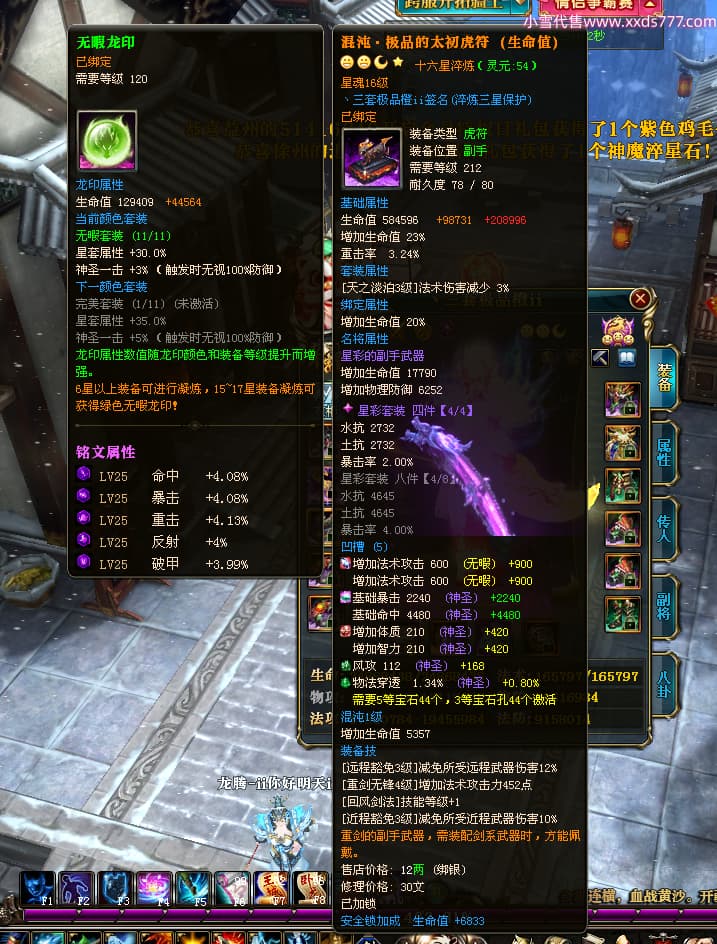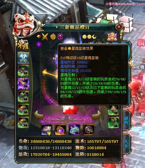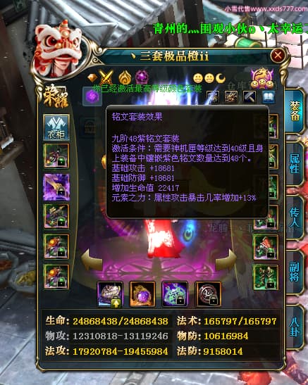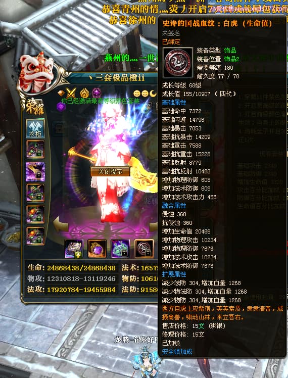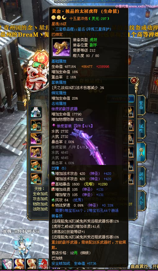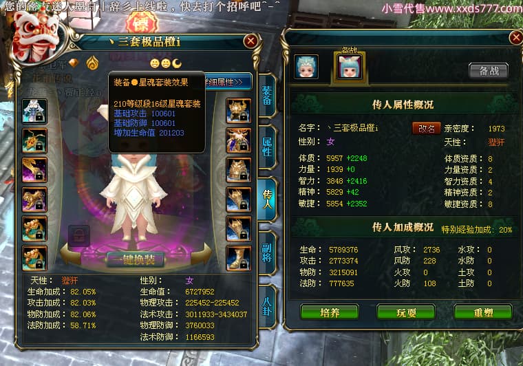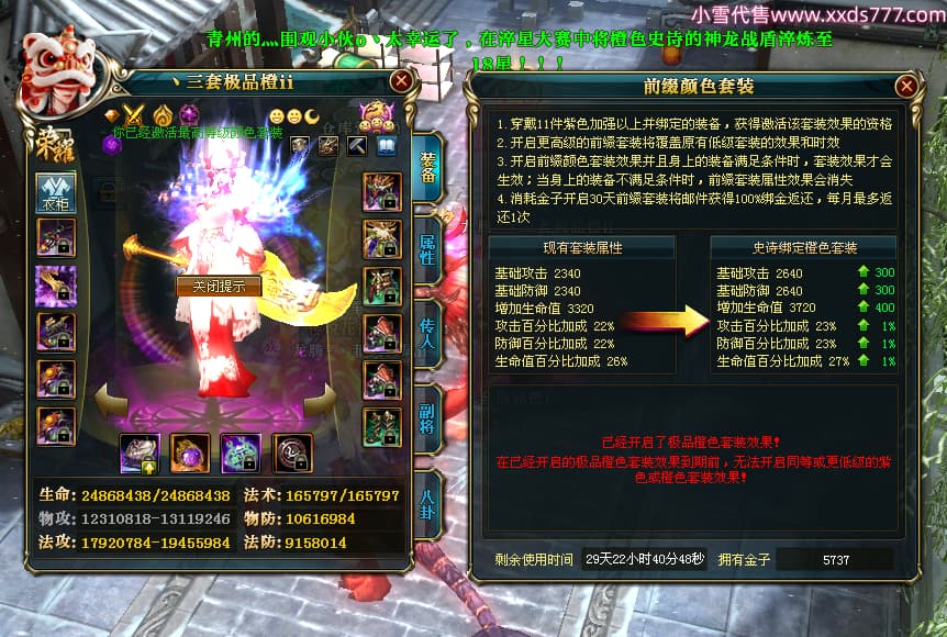 编号T25064 丶三套极品橙ii 龙腾问鼎 荆州 世界排名64名 28734W战力 人物黄金极品橙15X(1件18X9件混沌) 传人黄金极品橙15X 副将史诗紫15X 马黄金极品橙13X 极品紫15披风 人物星魂16级 传人星魂16级 副将星魂6级 马星魂16级 人物铭刻1件17级2件16级其余15级 点亮16星 马铭刻15级 点亮14星 人物绿龙印(1件紫龙印) 马绿龙印 六等单双属性完美无暇神圣石头 黄绿孔 可以转移百分百安全