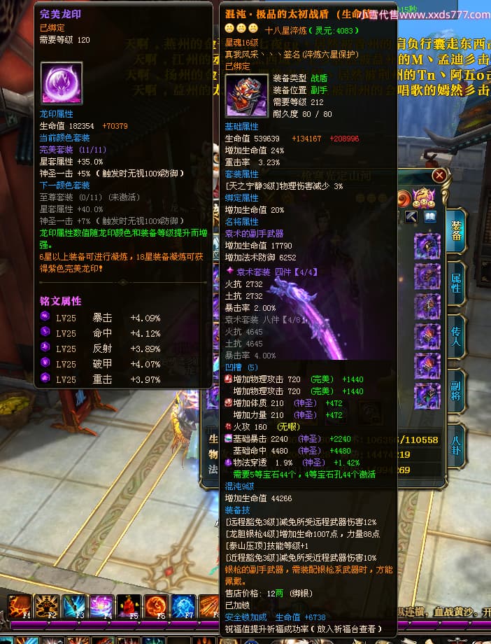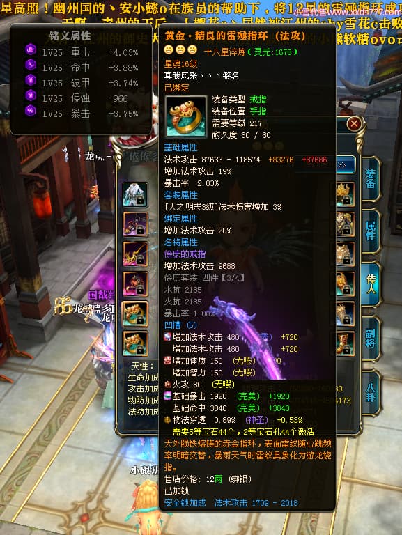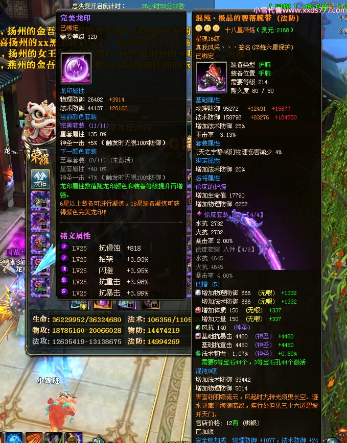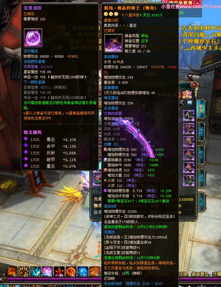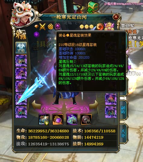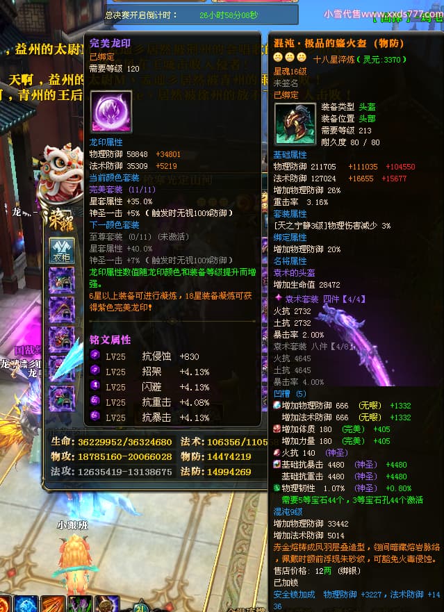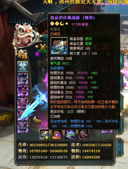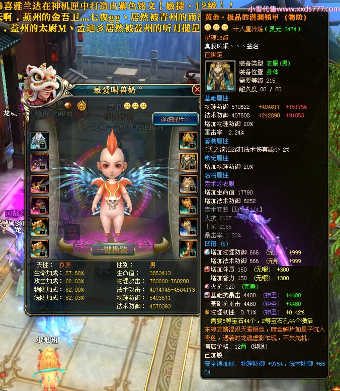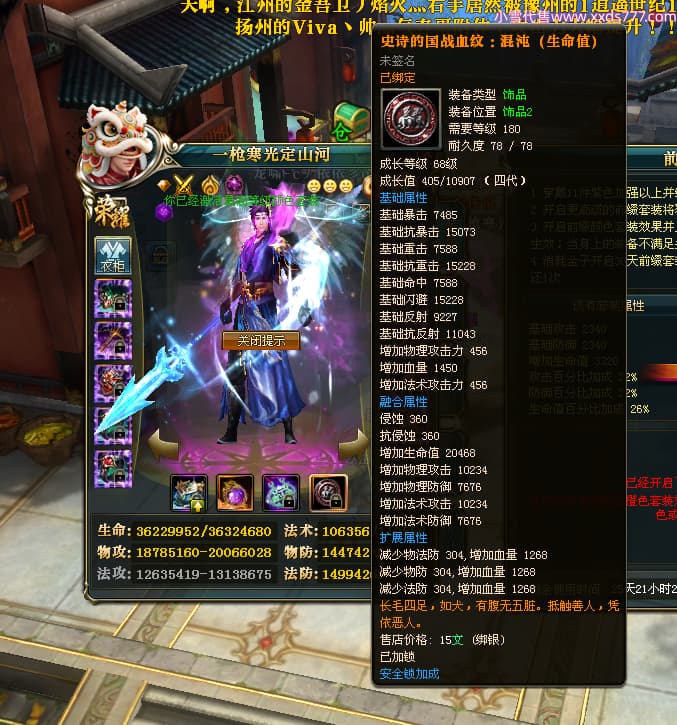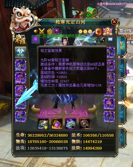 编号X25079 一枪寒光定山河 龙啸风云 荆州 世界排名15名 36636W战力 人物混沌极品橙18X 传人黄金加强橙18X 副将加强橙12X 马黄金极品橙13X(双潜能50级36级) 极品紫16披风 人物星魂16级 传人星魂16级 副将星魂9级 马星魂16级 人物铭刻18级 人物点亮18星 马铭刻3件14级其余13级 点亮14星 人物紫龙印 马绿龙印 六等单双属性神圣完美无瑕石头 绿孔 马庄那些都是卡着最后一手