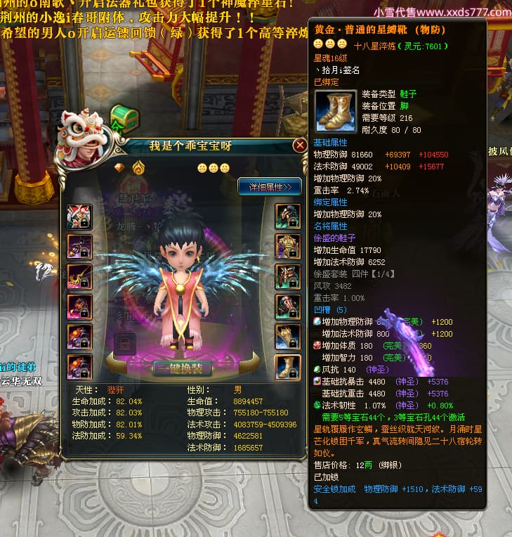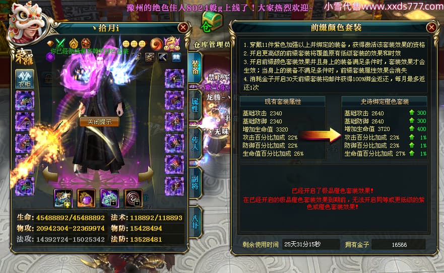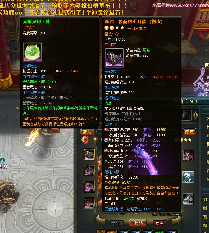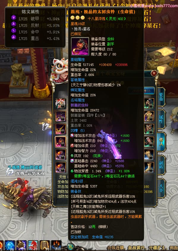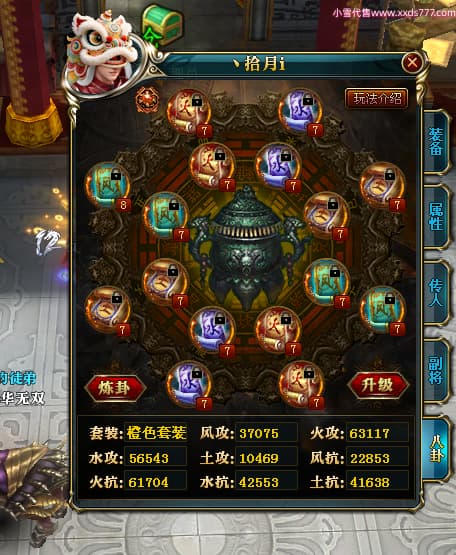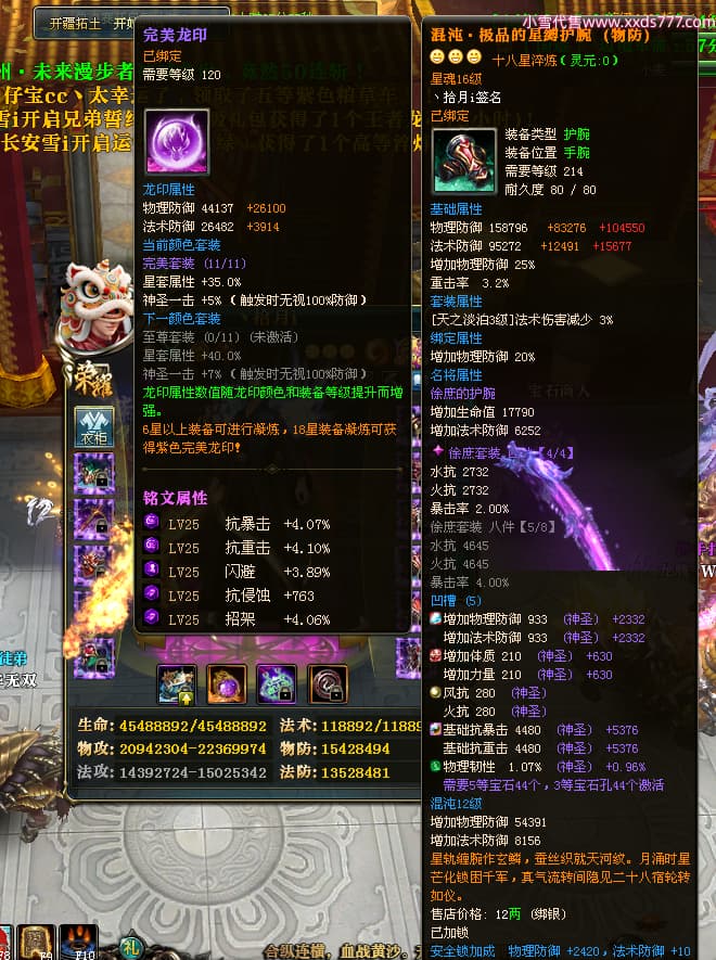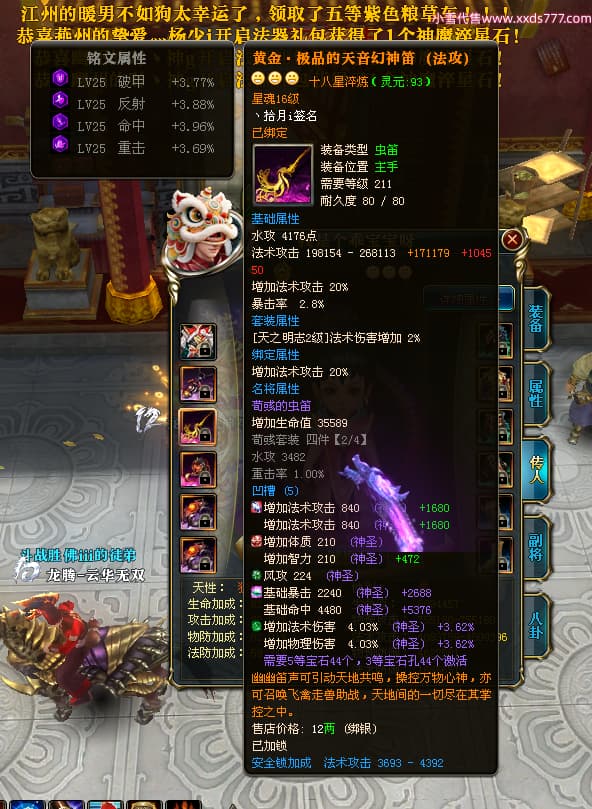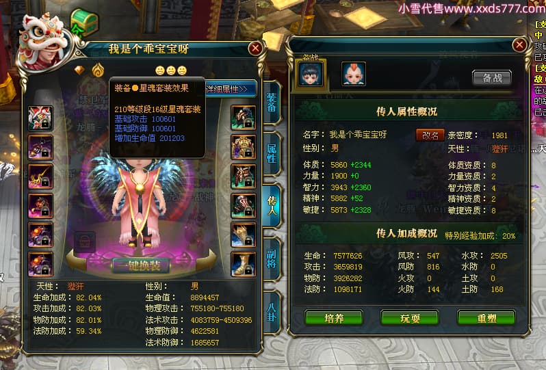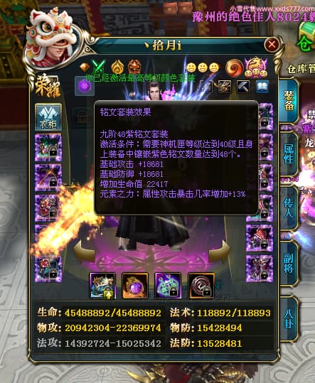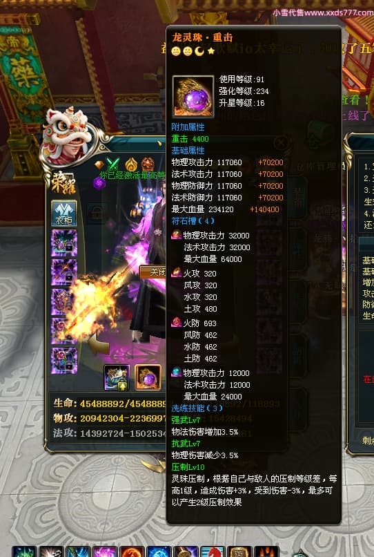 编号T25090 丶拾月i 龙腾问鼎 荆州 世界排名16名 43093W战力 人物混沌极品橙18X 传人黄金普通橙18X(7件混沌) 副将黄金普通橙15X 马混沌精良橙14X(双潜能63级60级) 史诗紫17披风 人物星魂16级 传人星魂16级 副将星魂16级 马星魂16级 人物铭刻18级 人物点亮18星 马铭刻2件18级1件17级其余16级 点亮1件16星其余14星 人紫龙印 马绿龙印 六等单双属性神圣石头 紫孔