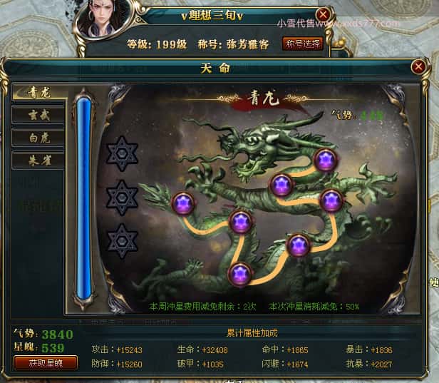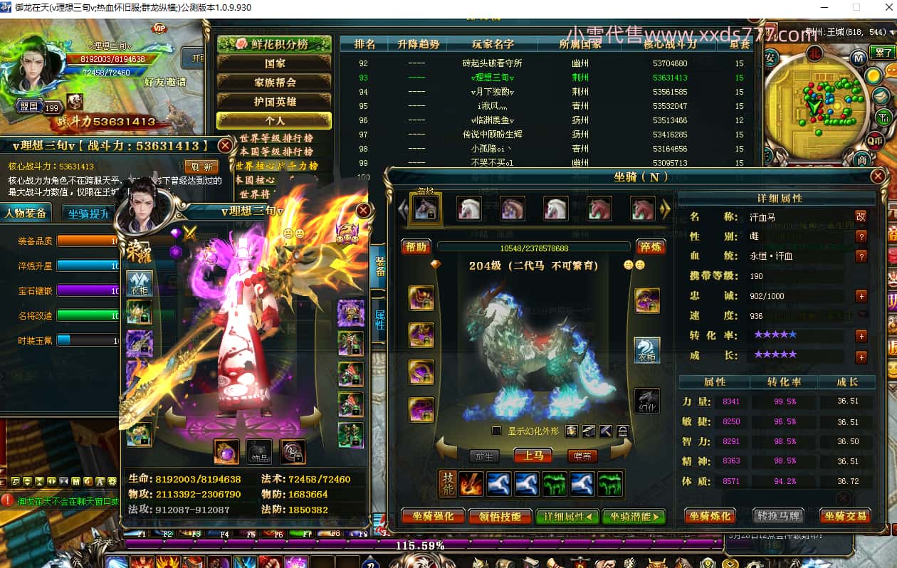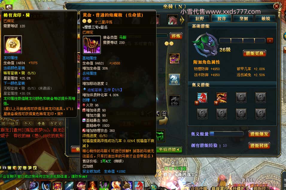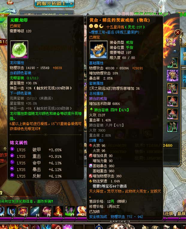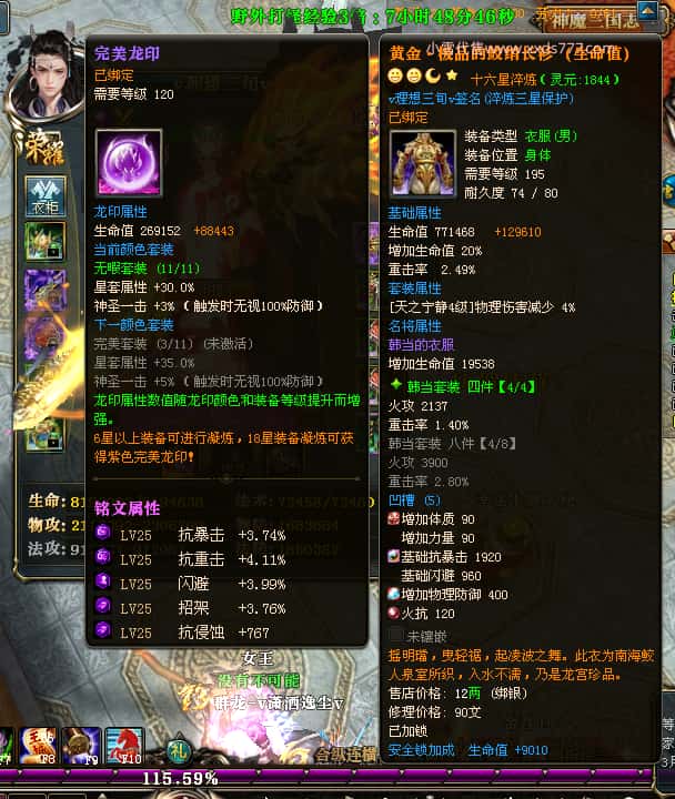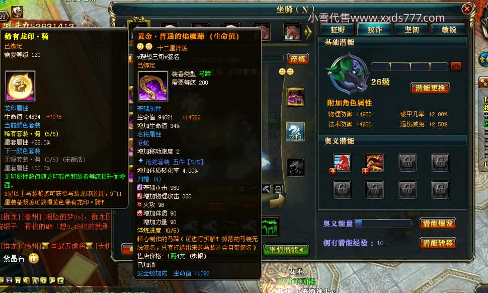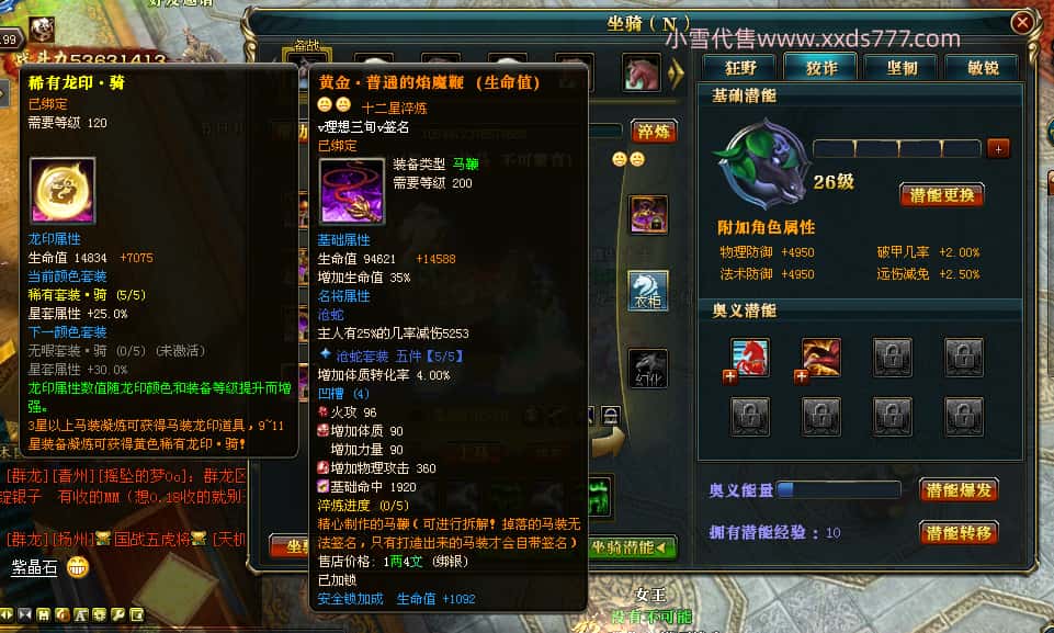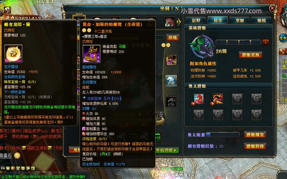 编号Q25134 v理想三旬v 群龙纵横 荆州 世界排名第93名 5363W战力 人物黄金史诗紫15X(6件混沌) 马黄金普通橙12X 龙魂257级 人物3件紫+8件绿龙印 马黄龙印 6666等单双属性石头 已开完永久15星套 可以转移百分百安全