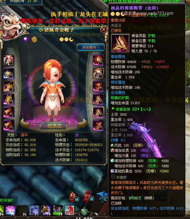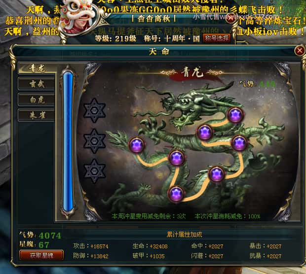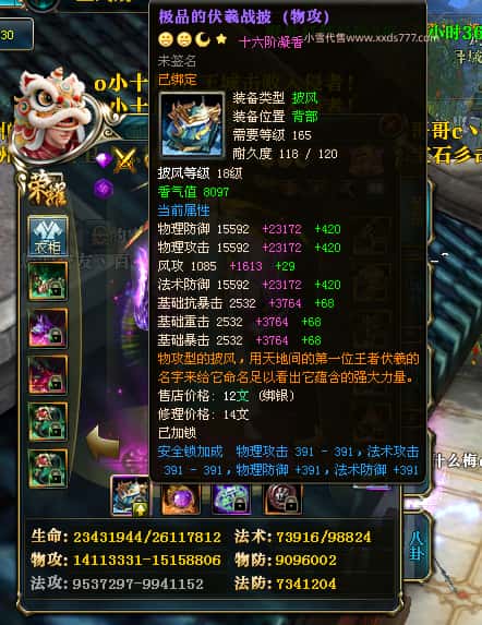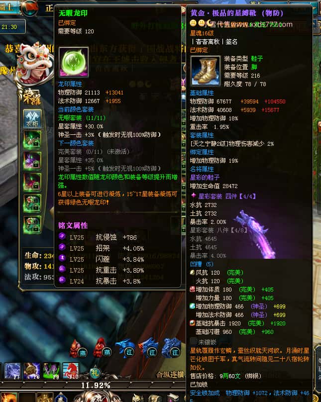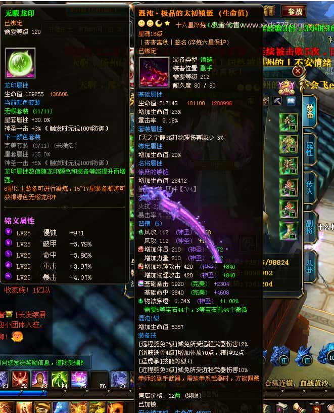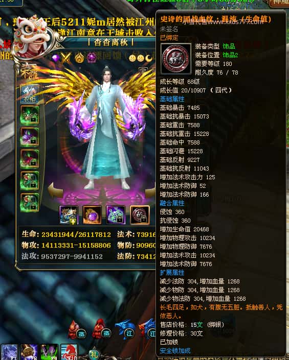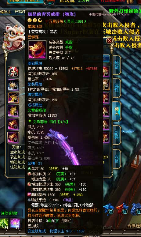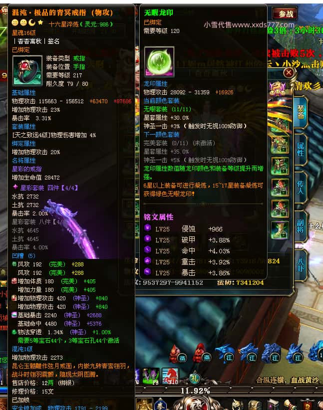 编号W25140 丨杳杳离秋丨 龙舞九州 江州 本国排名第20名 23427W战力 人物黄金极品紫15X(8件混沌) 传人极品紫15X 副将精良紫12X 马加强橙13X 极品紫16披风 人物星魂16级 传人16级 副将12级 马星魂16级 人物铭刻(主手/盔甲18级,项链/副手/戒指/头盔16级)剩下的15级 点亮盔甲18星剩下的16星 马铭刻14级 点亮14星 人物绿龙印 马绿龙印 五六等单双属性神圣完美无瑕石头 绿黄孔 已开完永久15星套
