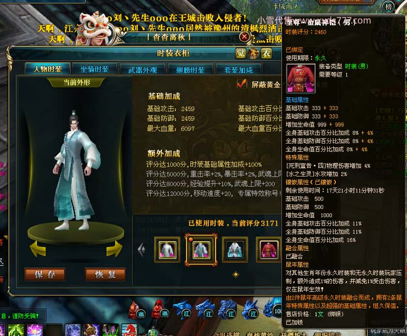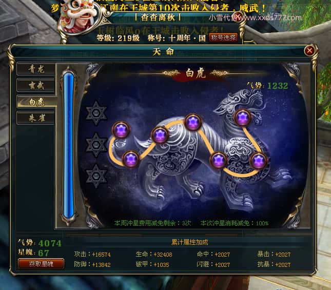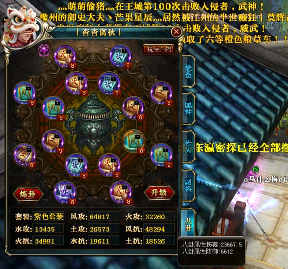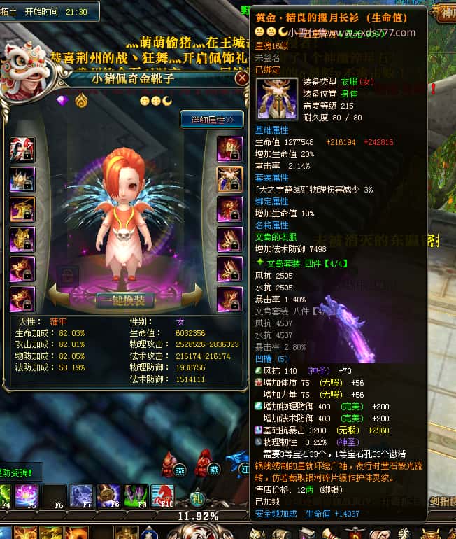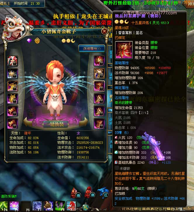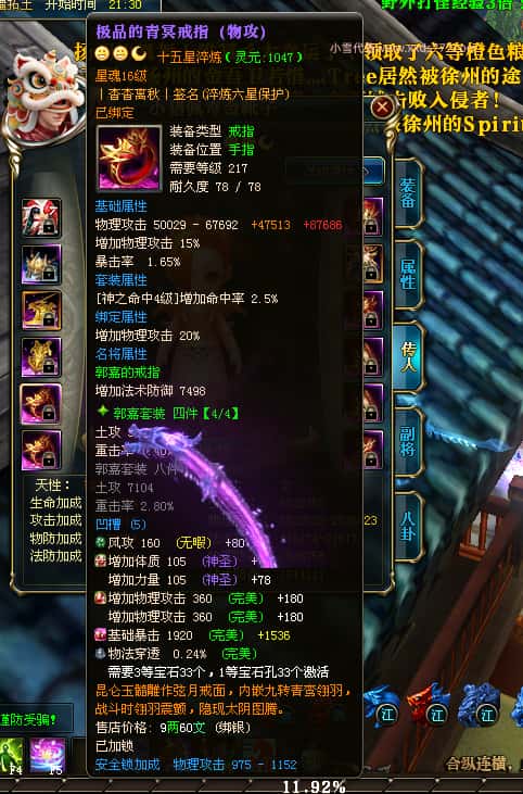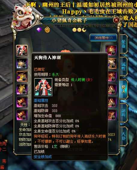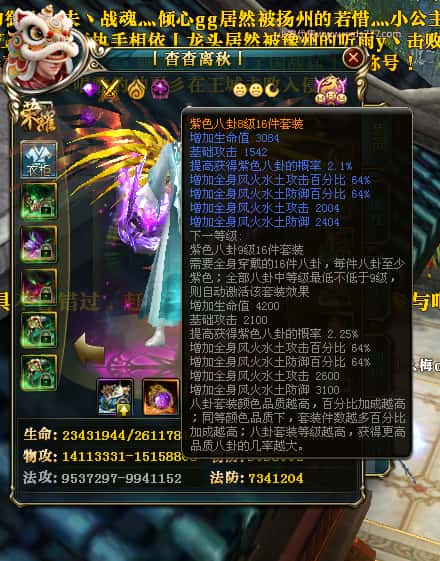编号W25140 丨杳杳离秋丨 龙舞九州 江州 本国排名第20名 23427W战力 人物黄金极品紫15X(8件混沌) 传人极品紫15X 副将精良紫12X 马加强橙13X 极品紫16披风 人物星魂16级 传人16级 副将12级 马星魂16级 人物铭刻(主手/盔甲18级,项链/副手/戒指/头盔16级)剩下的15级 点亮盔甲18星剩下的16星 马铭刻14级 点亮14星 人物绿龙印 马绿龙印 五六等单双属性神圣完美无瑕石头 绿黄孔 已开完永久15星套