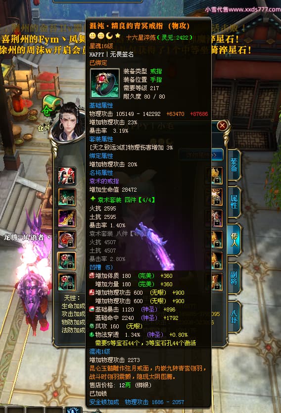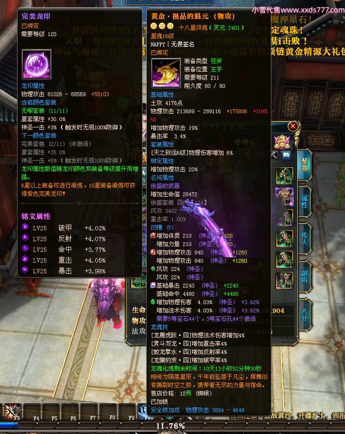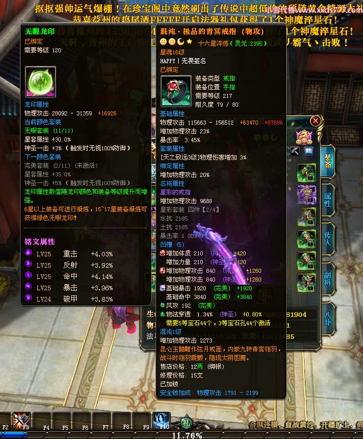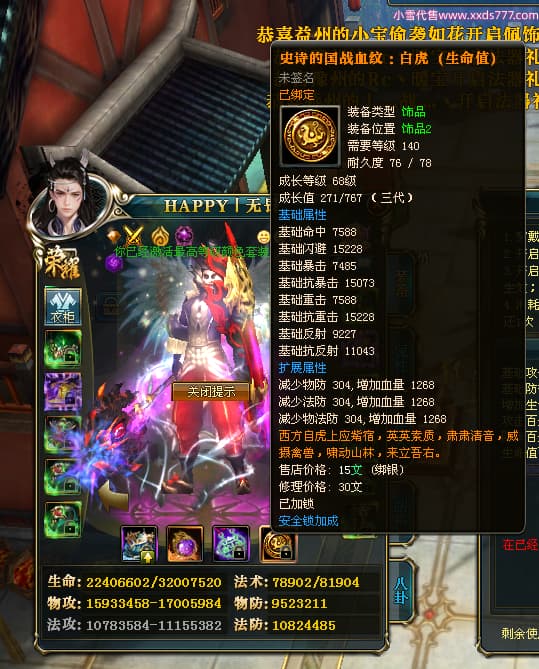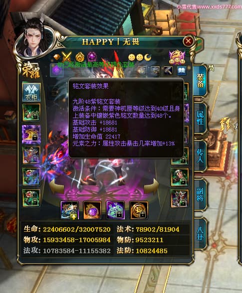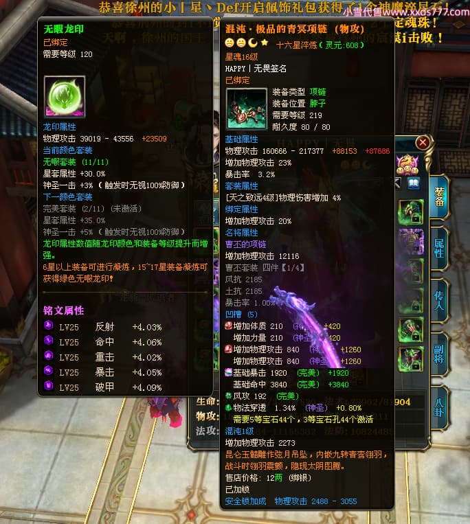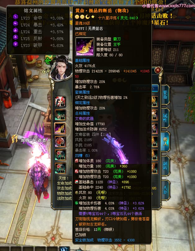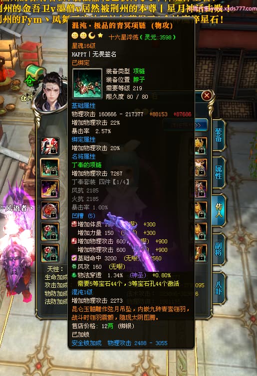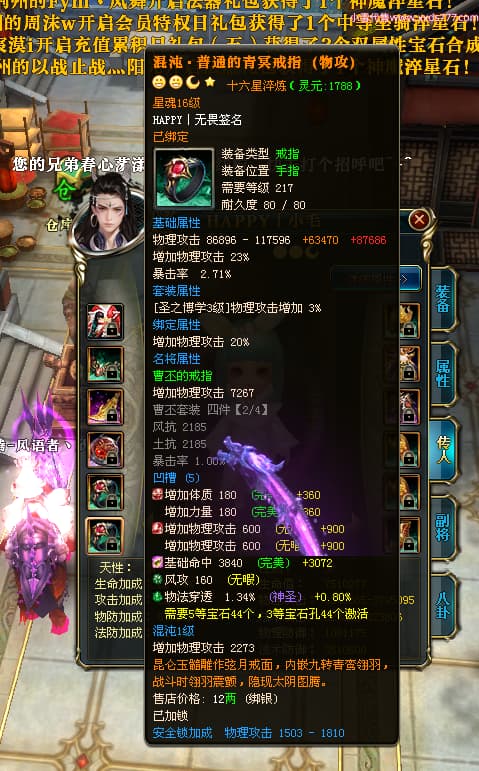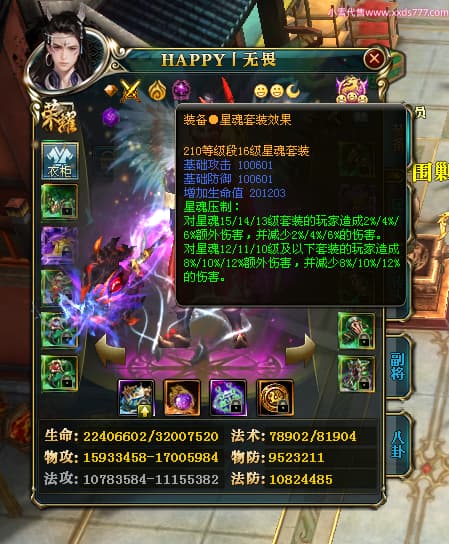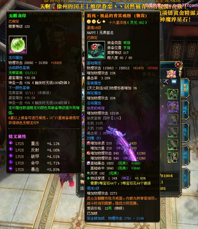 编号T25181 HAPPY丨无畏 龙腾问鼎 燕州 世界排名66名 28376W战力 人物黄金极品橙15X(2件18X9件混沌) 传人黄金普通橙15X(5件混沌) 副将精良紫12X 马加强橙12X 极品紫16披风 人物星魂16级 传人星魂15级 副将星魂6级 马星魂16级 人物铭刻8件16级其余15级 点亮16星 马铭刻1件15级其余12级 点亮1件14星其余12星 人物绿龙印(2件紫龙印) 马黄龙印 六等单双属性完美无暇神圣石头 黄绿孔 已开启永久18星套