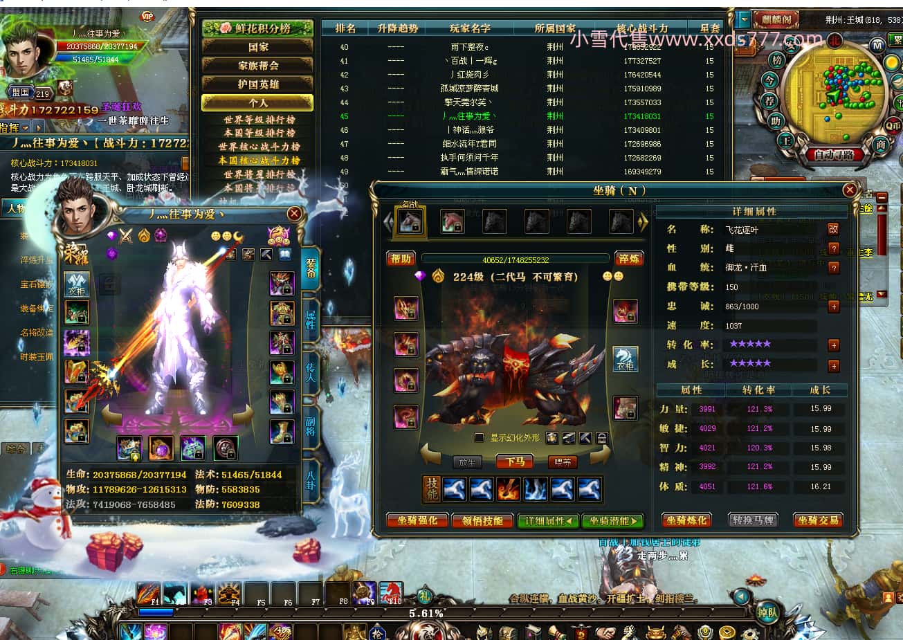 编号Z22589 风影y 逐鹿天下 江州 本国排名29名 15448W战力 人物黄金史诗紫15X(5件混沌) 传人加强紫15X 副将精良紫12X 马史诗紫12X 极品紫15披风 人物星魂16级 传人星魂12级 副将星魂6级 马星魂11级 人物铭刻15级 人物点亮16星 马铭刻12级 点亮12星 人绿龙印 马黄龙印 六等单双属性神圣完美无暇石头 黄孔 已开1次永久15星套