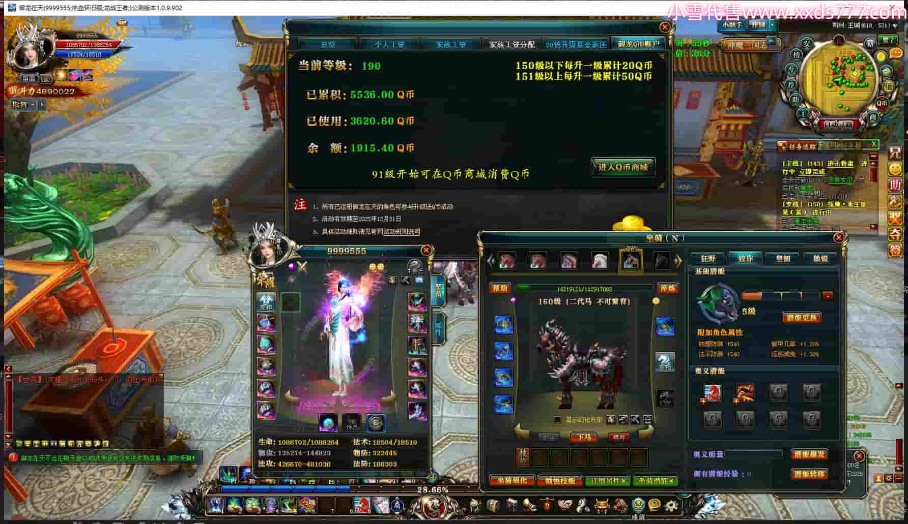 编号L23252 9999555 龙战王者 荆州 190级 人物12X点星号 马6X 号内Q币1915个 人物高淬331个 坐骑中淬88个