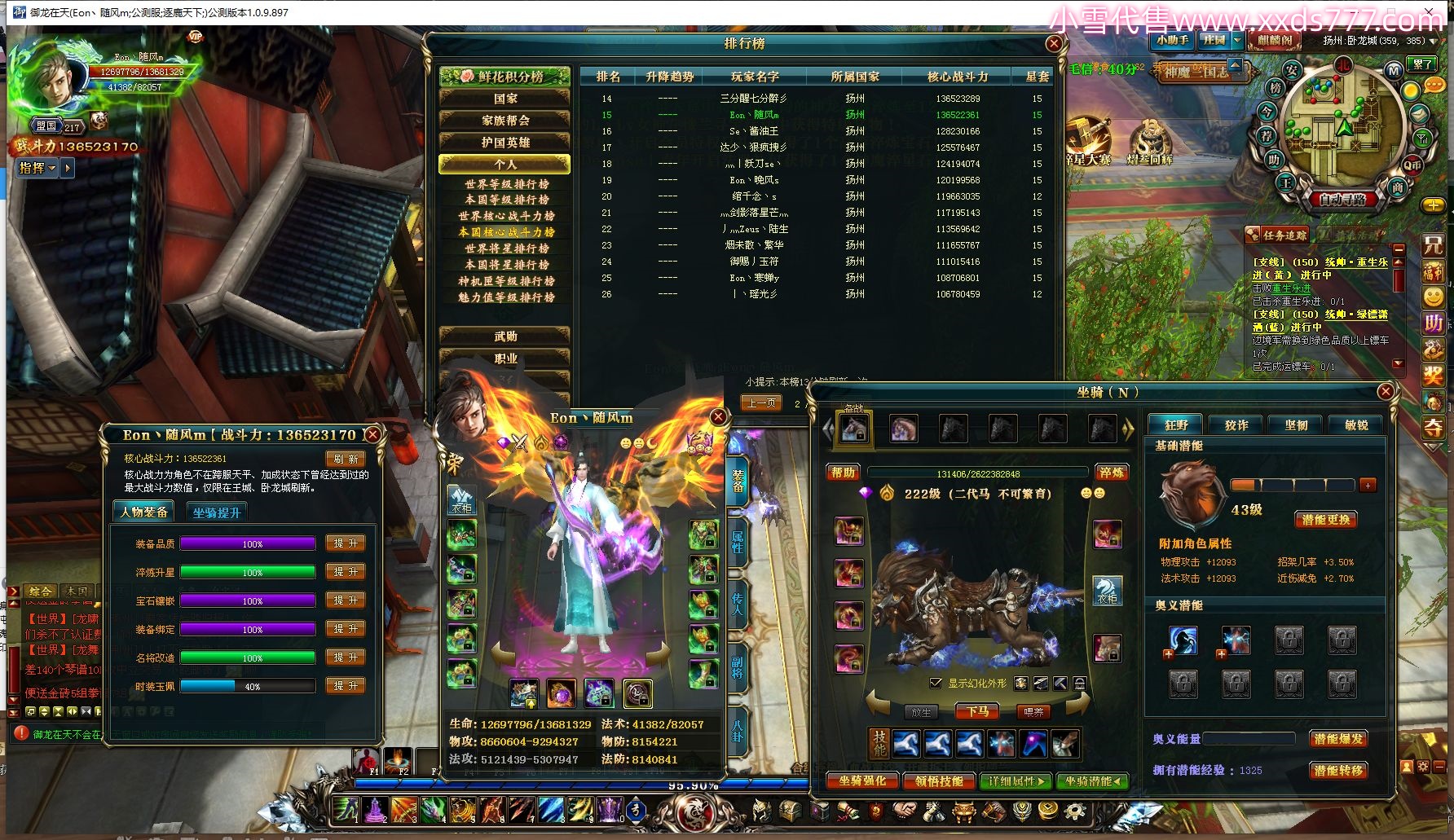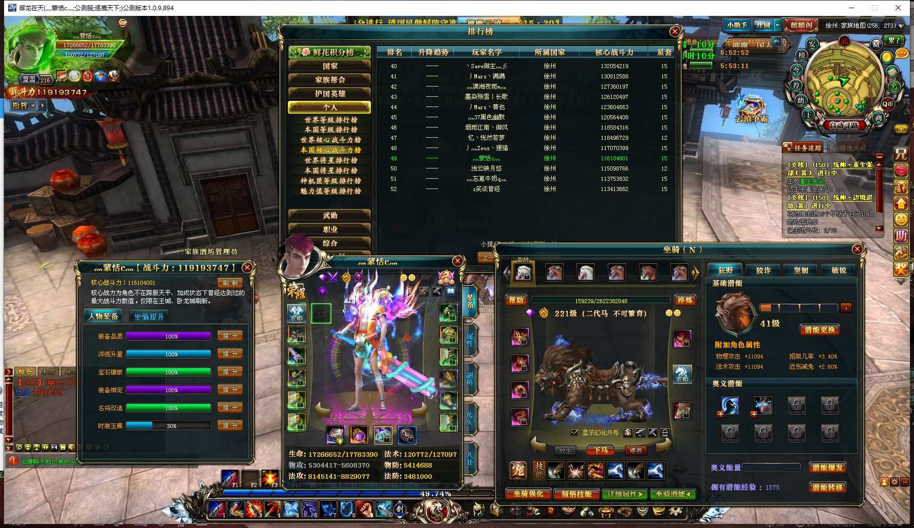 编号Z22698 MakeafortuneCC 逐鹿天 徐州 本国排名第38名 13901W战力 人物黄金极品紫15X(5件混沌) 传人极品紫15X 副将精良紫12X 马极品紫10X 精良紫15披风 人物星魂16级 传人8级 副将6级 马星魂10级 人物铭刻15级 点亮(主手/副手16星)剩下的14星 马铭刻3件15级1件14级1件13级 点亮10星 人物绿龙印 马黄龙印 五六等单双属性神圣完美无瑕石头 绿黄蓝孔