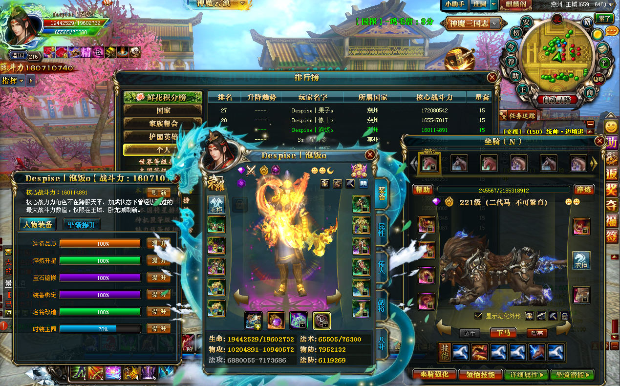 Despise丨泡饭o逐鹿天下 燕州 本国排名29名 16300W战力 人物黄金普通紫15X(2件16 2件18 5件混沌) 传人普通紫15X) 副将史诗紫12X(3件15)马史诗紫12X 极品紫15披风 人物星魂16级 传人星魂13级 副将星魂6级 马星魂16级 人物铭刻15级 人物点亮16星 马铭刻12 点亮12星 人绿龙印 马黄龙印 五六等单双属性神圣完美无暇石头 黄绿孔