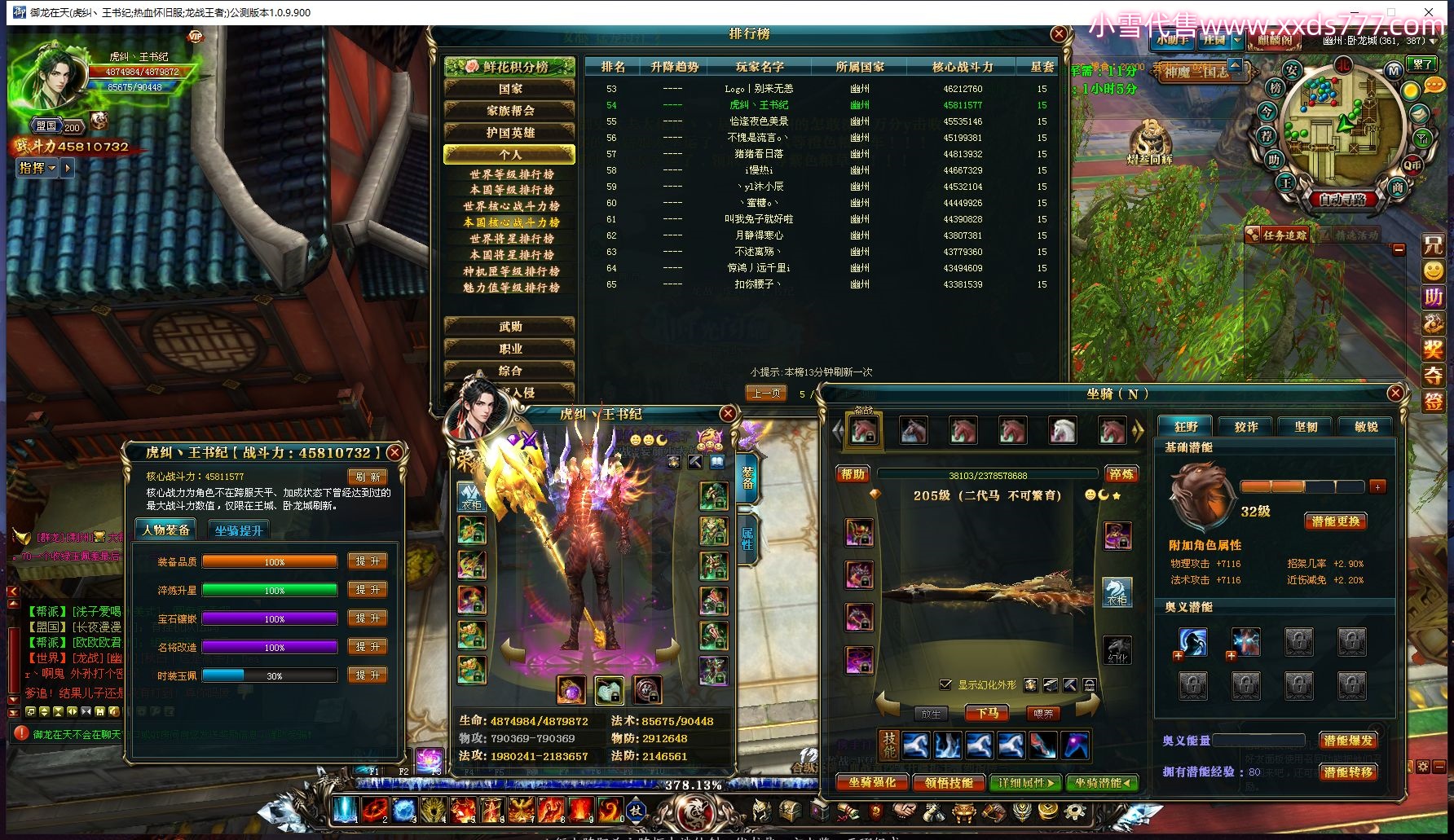 编号L23046 丿小满满灬 龙战王者 燕州 本国排名12名 5409W战力 人物黄金极品橙15X(1件18X8件混沌) 马黄金精良橙12X 人物绿龙印(2件紫龙印) 马黄龙印 六等单双属性石头
